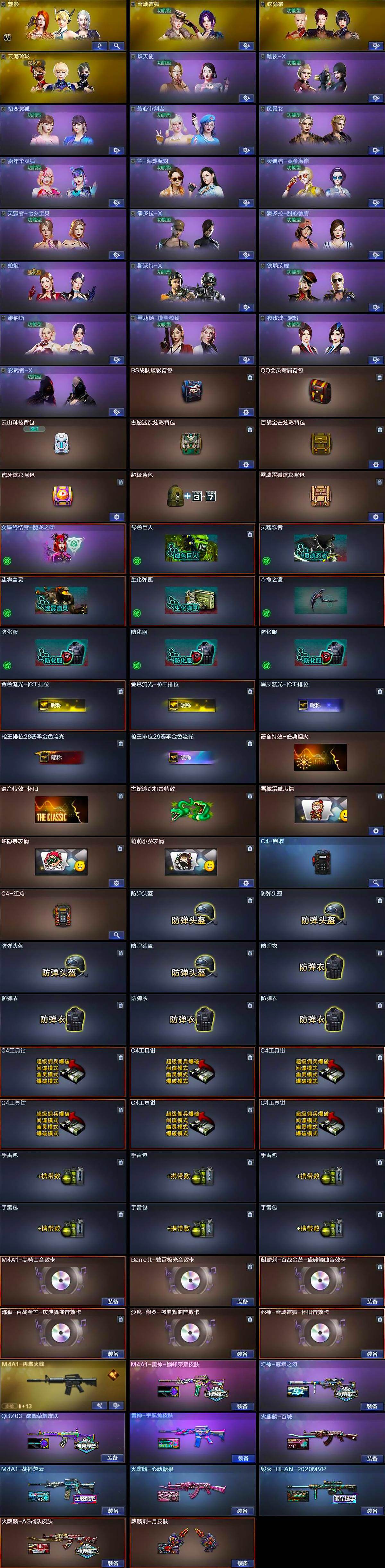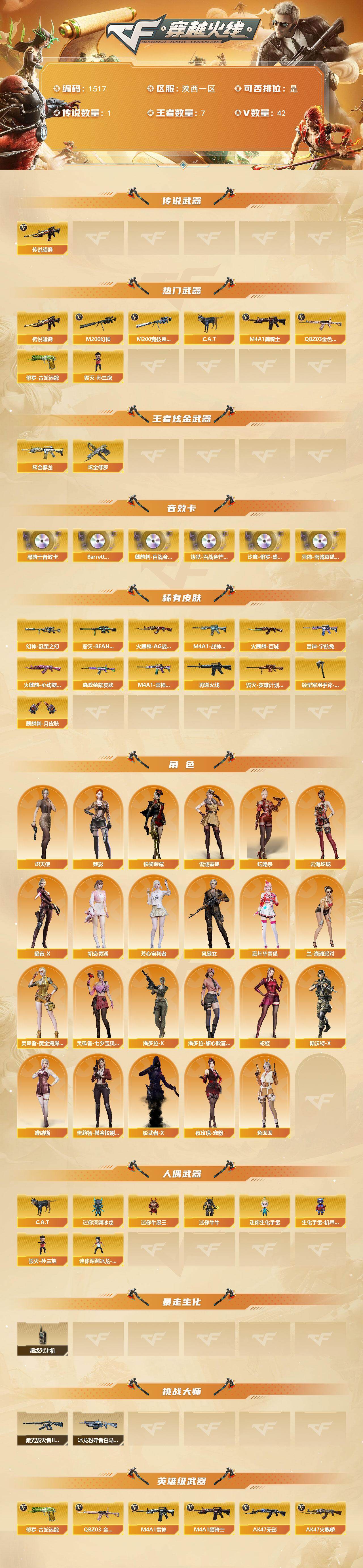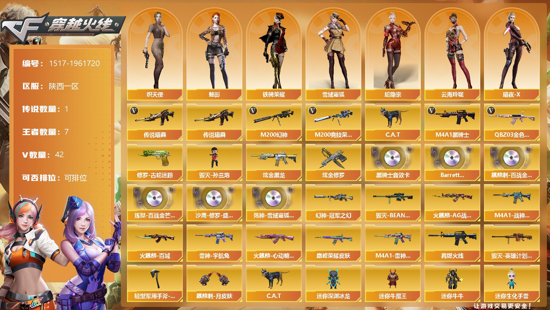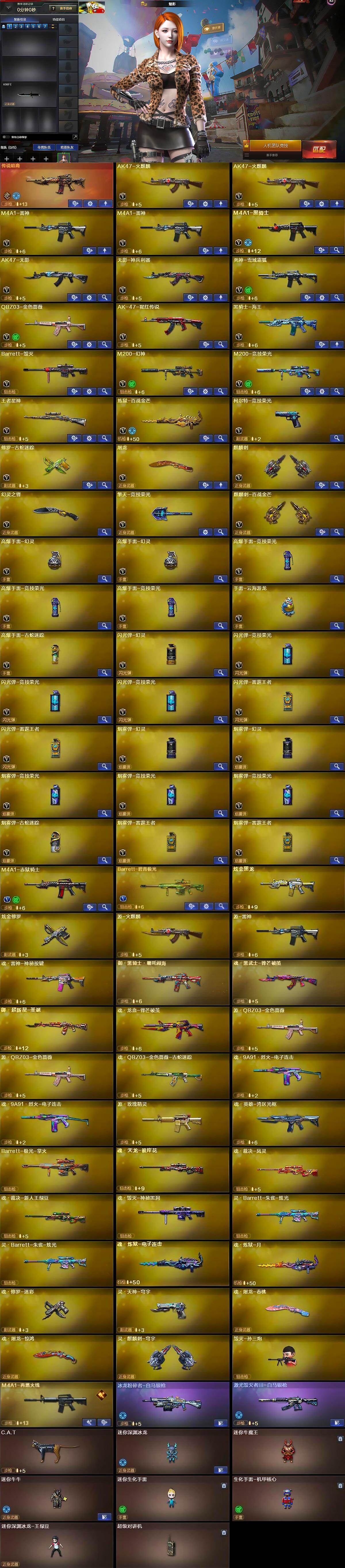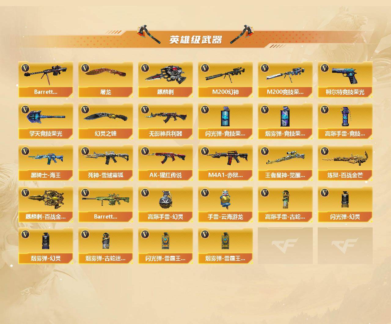 - [15421452]实名: 可修改 排位资格: 有 V武器: AK47-火麒麟,M4A1-雷神,M4A1-黑骑士,M4A1-青龙,M4A1-玫瑰精灵,Barrett-毁灭,Barrett-极光,AWM-裁决,M200-幻神,Kar98k-星神,AA-12-雷霆,AN94-超新星,QBZ03-金色蔷薇,汤姆逊-烈龙,加特林-炼狱,沙鹰-修罗,沙鹰-天神,屠龙,龙啸,麒麟刺,擎天,M4A1-幻灵,柯尔特-竞技荣光,USP-雷暴,擎天-竞技荣光,Barrett-暗月传说,斩神刀-雷暴,幻灵之锋,AK47-B-战神,AK-47-猩红传说,白虎-电玩蓝兔,QBZ03天罚,炽芒蝶刃,传说灵眸,龙啸-烈火龙威,烈火-动感闪耀,天神-动感闪耀,屠龙-动感闪耀,擎天-云海游龙,AK47-B-身先士卒,无影-神兵利器,COP 357-幻灵,金色蔷薇-古蛇迷踪,修罗-古蛇迷踪,M4A1-赤狱骑士,FAMAS G2-天戎,机械迷城-穹宇,从林匕首-玄豹,SCAR Light-玄豹,Anaconda-玄豹,异变清道夫-蛇影双骄 王者武器: 王者之心-觉醒版,王者芳薇-觉醒版,王者星神-觉醒版,王者风神-觉醒版 热门武器: COP-白鲨,M4A1-雷神-精英刀锋,毁灭-孙三炮,雷神-小红 狙击枪稀有皮肤: 毁灭-暗月,毁灭-冠军之怒,毁灭-黑大圣皮肤,毁灭-风暴,M200-幻神-荣耀世冠白鲨,毁灭-星耀 皮肤,裁决-流光秘银,幻神-星耀 皮肤,幻神-动感闪耀 皮肤 英雄角色: 王者-魅影,葵,影豹,隼,王者影豹,星际战将,司雨,王者潘多拉 音效道具: M4A1-黑骑士音效卡,M200-幻神音效卡,天神动感闪耀音效卡,烈火动感闪耀音效卡