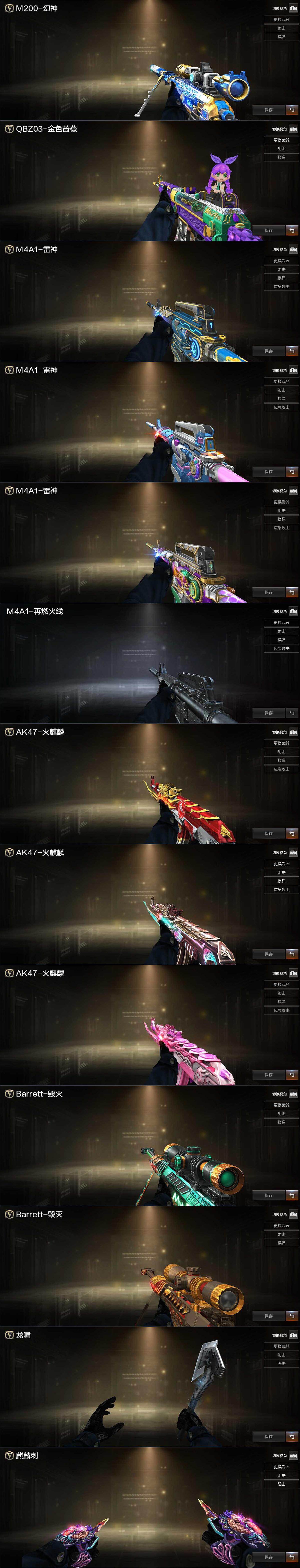 【音效卡】:M4A1-黑骑士音效卡,Barrett-碧霄极光音效卡,麒麟刺-百战金芒-盛典舞曲音效卡,炼狱-百战金芒-庆典舞曲音效卡,沙鹰-修罗-盛典舞曲音效