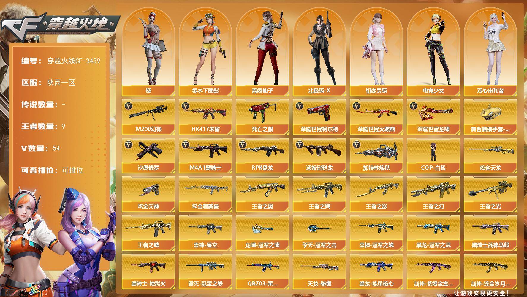 [15242626]陕西一区-54V-9王者-8炫金 【热门武器】:HK417-朱雀,M200-幻神,死亡之眼,荣耀世冠-火麒麟,荣耀世冠-柯尔特,M4A1-黑骑士,汤姆逊-烈龙*6,RPK-盘龙*5,加特林-炼狱*3,COP-白鲨,沙鹰-修罗*5,荣耀世冠-龙啸,黄金猫猫手套-白鲨 【王者炫金武器】:王者之戮,王者之幻,王者之翼,王者之影,王者之魄,王者之光,炫金超新星*5,炫金天龙*2,炫金天神 【皮肤】:QBZ03-荣耀世冠白鲨,雷神-星空,雷神-冠军之魄,毁灭-冠军之怒,黑龙-能量核心*2,黑龙-冠军之武,黑骑士-地狱火,黑骑士-战神马超,战神-紫绶金章皮肤,战神-流金岁月皮肤,天龙-秘银,龙啸-冠军之啸,龙啸-巅峰荣耀 皮肤,擎天-冠军之击 【角色】:樱,北极狐-X,初恋灵狐,电竞少女,芳心审判者,兰-海滩派对,零-水下丽影,麻雀,青霞仙子 【人偶武器】:COP-白鲨,M4A1-雷神-精英刀锋,迷你钢铁终结者,迷你救赎猎手,迷你生化手雷*2 【暴走生化】:死亡之眼 【英雄级武器】:AK47-火麒麟*3,M4A1-黑龙,M4A1-雷神,M4A1-黑骑士,AK47-机械迷城,AK47-黑鲨,M4A1-龙血,HK417-朱雀,M4A1-猎神*3,王者之武-觉醒版,AK-47-猩红传说*3,黑骑士-海王,荣耀世冠-火麒麟,AWM-天龙,Barrett-毁灭*4,AWM-裁决,M200-幻神,王者之力-觉醒版,RPK-盘龙*5,加特林-炼狱*3,汤姆逊-烈龙*6,沙鹰-修罗*5,沙鹰-天神,荣耀世冠-柯尔特,屠龙,龙啸,擎天,麒麟刺*2,荣耀世冠-龙啸,王者之啸-觉醒版 【道具】:虎牙炫彩背包,超级背包,黄金生化钩,绿色巨人,灵魂忍者,变异宝贝,迷雾幽灵,夺命之镰,防化服*2,金色流光-枪王排位,防弹头盔*3,防弹衣*3,C4工具钳*3,手雷包*4 【特殊枪械】:1黑骑士,6烈龙,5盘龙,3炼狱