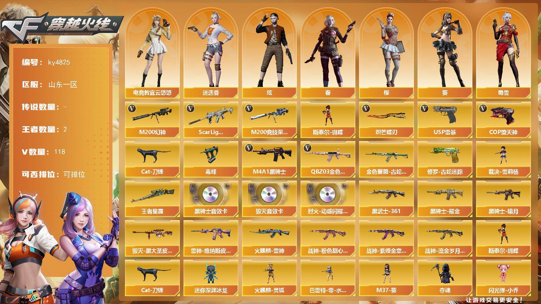[15520578]山东一区-118V-2王者-0炫金 【热门武器】:QBZ03-金色蔷薇,Scar Light-白虎,M200-幻神,金色蔷薇-古蛇迷踪,修罗-古蛇迷踪,M200-竞技荣光,Cat-刀锋,毒蜂,M4A1-黑骑士,斯泰尔-蝴蝶,裁决-雪莉杨,USP-雷暴,COP-堕天神,炽芒蝶刃 【王者炫金武器】:王者星霆 【音效卡】:烈火-动感闪耀 音效卡,M4A1-黑骑士音效卡,Barrett-毁灭音效卡 【皮肤】:雷神-维纳斯皮肤,火麒麟-雷神,毁灭-黑大圣皮肤,黑骑士-暗月,黑骑士耀金皮肤,AK47-黑武士-361,战神-粉色甜心皮肤,战神-紫绶金章皮肤,战神-流金岁月皮肤 【角色】:葵,樱,炫,春,迷迭香,电竞教官-云悠悠,蛇隐宗,乔伊教练,云海玲珑,暗夜-X,北极狐-X,电竞少女,芳心审判者,飞虎队-X,虎妞,嘉年华灵狐,娟娟,灵狐者-七夕宝贝,麻雀,潘多拉-X,潜龙队-X,蛇姬,蜀雪,新娜塔莎,雪莉杨,樱-战斗天使,影武者-X 【人偶武器】:裁决-雪莉杨,火麒麟-灵狐,天龙-乔伊教练,斯泰尔-蝴蝶,巴雷特-零-水下丽影,M37-葵,Cat-刀锋,迷你深渊冰龙,夺魂,闪光弹-小乔 【暴走生化】:毒蜂,黑龙吞噬者,超级对讲机 【挑战大师】:神圣爆裂者III*3,AK47-冰龙粉碎者,激光毁灭者III-白马银枪,激光毁灭者III*4 【英雄级武器】:M4A1-雷神,M4A1-黑骑士,AK47-黑武士,AK12-天启,M4A1-雷霆,AK47-雷暴,M4A1-堕天神,Scar Light-白虎,黑武士-锦绣游龙,金色蔷薇-古蛇迷踪,QBZ03-金色蔷薇,烈火-动感闪耀,AK-47-猩红传说*8,AK47-B-战神,Barrett-毁灭,M200-幻神,M200-竞技荣光,王者之怒-觉醒版,烈龙-云海游龙,USP-雷暴,COP-雷霆*2,COP-堕天神,柯尔特-竞技荣光,天神-动感闪耀,修罗-古蛇迷踪,麒麟刺-堕天神,擎天-竞技荣光*2,炽芒蝶刃,屠龙-动感闪耀,擎天-云海游龙,龙啸-堕天神,斩神刀-雷暴,高爆手雷-雷霆*7,高爆手雷-雷暴*8,高爆手雷-堕天神*6,高爆手雷-竞技荣光,手雷-动感闪耀,手雷-云海游龙,高爆手雷-古蛇迷踪,闪光弹-雷霆*7,闪光弹-雷暴*7,闪光弹-堕天神*6,闪光弹-竞技荣光,烟雾弹-雷霆*7,烟雾弹-雷暴*10,烟雾弹-堕天神*6,烟雾弹-竞技