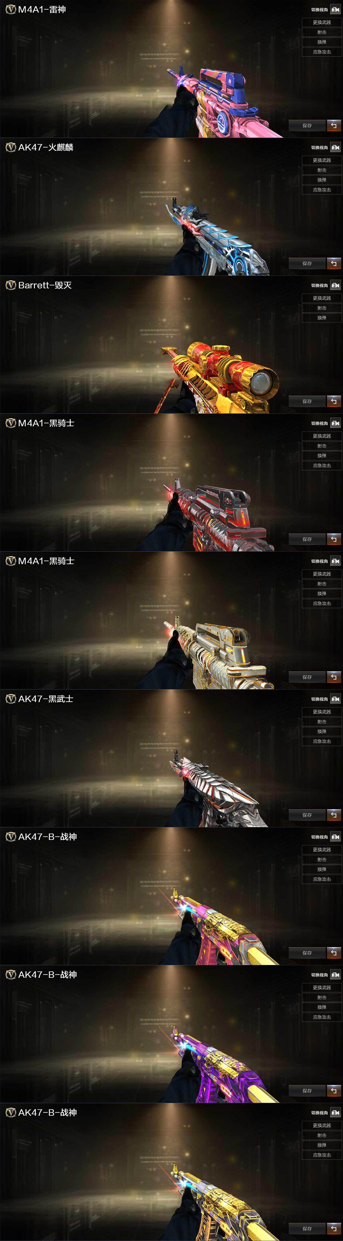 【英雄级武器】:M4A1-雷神,M4A1-黑骑士,AK47-黑武士,AK12-天启,M4A1-雷霆,AK47-雷暴,M4A1-堕天神,Scar Light-白虎,黑武士-锦绣游龙,金色蔷薇-古蛇迷踪,QBZ03-金色蔷薇,烈火-动感闪耀,AK-47-猩红传说*8,AK47-B-战神,Barrett-毁灭,M200-幻神,M200-竞技荣光,王者之怒-觉醒版,烈龙-云海游龙,USP-雷暴,COP-雷霆*2,COP-堕天神,柯尔特-竞技荣光,天神-动感闪耀,修罗-古蛇迷踪,麒麟刺-堕天神,擎天-竞技荣光*2,炽芒蝶刃,屠龙-动感闪耀,擎天-云海游龙,龙啸-堕天神,斩神刀-雷暴,高爆手雷-雷霆*7,高爆手雷-雷暴*8,高爆手雷-堕天神*6,高爆手雷-竞技荣光,手雷-动感闪耀,手雷-云海游龙,高爆手雷-古蛇迷踪,闪光弹-雷霆*7,闪光弹-雷暴*7,闪光弹-堕天神*6,闪光弹-竞技荣光,烟雾弹-雷霆*7,烟雾弹-雷暴*10,烟雾弹-堕天神*6,烟雾弹-竞技