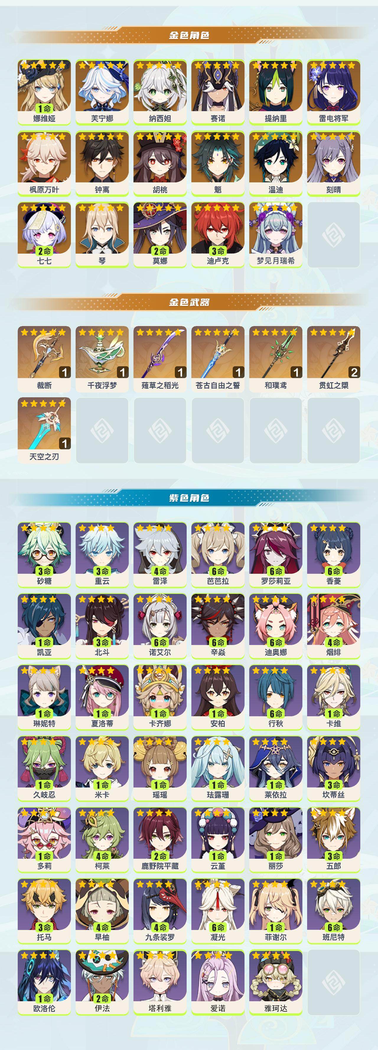 【紫色角色】:雅珂达(0命),爱诺(0命),塔利雅(0命),伊法(2命),欧洛伦(0命),卡齐娜(1命),夏洛蒂(1命),琳妮特(0命),卡维(0命),米卡(0命),瑶瑶(1命),珐露珊(1命),莱依拉(0命),坎蒂丝(3命),多莉(0命),柯莱(4命),鹿野院平藏(2命),久岐忍(0命),云堇(0命),五郎(3命),托马(3命),九条裟罗(4命),早柚(4命),烟绯(4命),罗莎莉亚(满命),辛焱(满命),迪奥娜(满命),砂糖(3命),雷泽(4命),菲谢尔(0命),丽莎(1命),北斗(3命),香菱(满命),安柏(1命),班尼特(满命),行秋(满命),芭芭拉(满命),凝光(满命),诺艾尔(满命),凯亚(0命),重云(3命)
