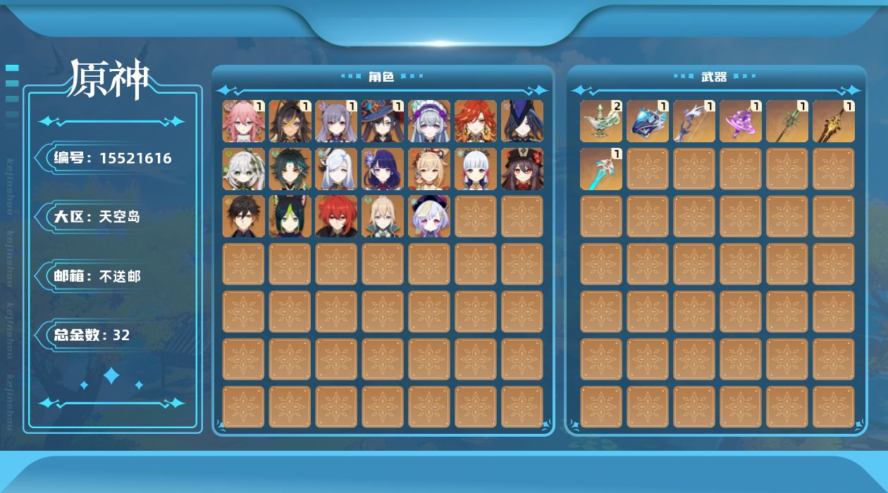 0命克洛琳德,1命迪希雅,0命纳西妲,0命提纳里,1命八重神子,0命申鹤,0命雷电将军,0命神里绫华,0命钟离,0命胡桃,0命魈,0命宵宫,1命刻晴,0命七七,0命琴,1命莫娜,0命迪卢克,0命玛薇卡,0命梦见月瑞希,0命菲林斯,精1万世流涌大典,精1苇海信标,精2千夜浮梦,精1若水,精1神乐之真意,精1和璞鸢,精1天空之刃
