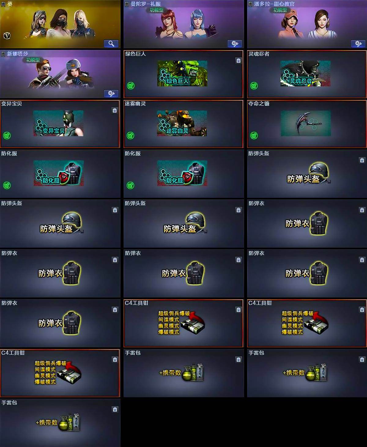 【道具】:绿色巨人,灵魂忍者,变异宝贝,迷雾幽灵,夺命之镰,防化服*2,防弹头盔*3,防弹衣*5,C4工具钳*3,手雷包*3