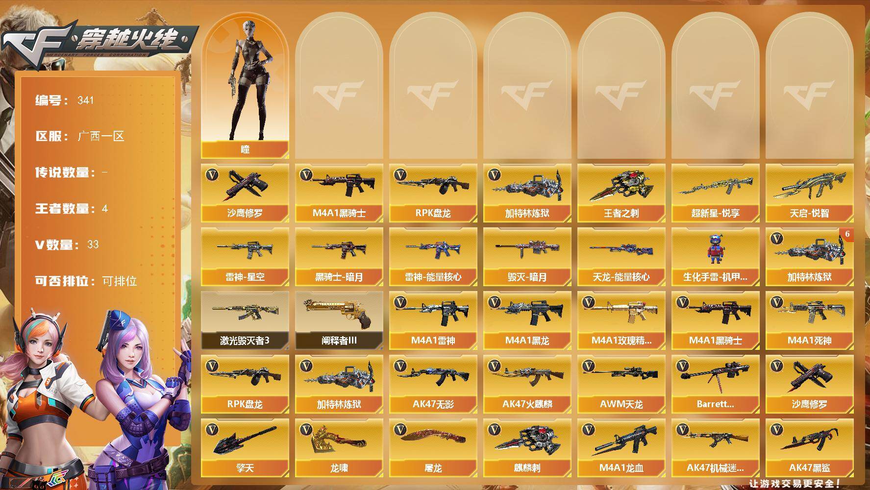 [13036135]广西一区-33V-4王者-0炫金 【热门武器】:M4A1-黑骑士,RPK-盘龙*2,加特林-炼狱*7,沙鹰-修罗*2 【王者炫金武器】:超新星-悦享,天启-悦智,王者之刺*2 【稀有皮肤】:雷神-能量核心*2,雷神-星空,黑骑士-暗月*2,毁灭-暗月,天龙-能量核心 【角色】:瞳 【人偶武器】:生化手雷-机甲核心 【挑战大师】:阐释者III,激光毁灭者III 【英雄级武器】:AK47-火麒麟*2,M4A1-黑龙,M4A1-雷神*2,M4A1-黑骑士,AK47-无影,M4A1-死神,AK47-机械迷城,AK47-黑鲨,M4A1-龙血*2,M4A1-玫瑰精灵,AWM-天龙,Barrett-毁灭,RPK-盘龙*2,加特林-炼狱*7,沙鹰-修罗*2,屠龙*2,龙啸,擎天,麒麟刺 【特殊枪械】:1黑骑士,2盘龙,6炼狱