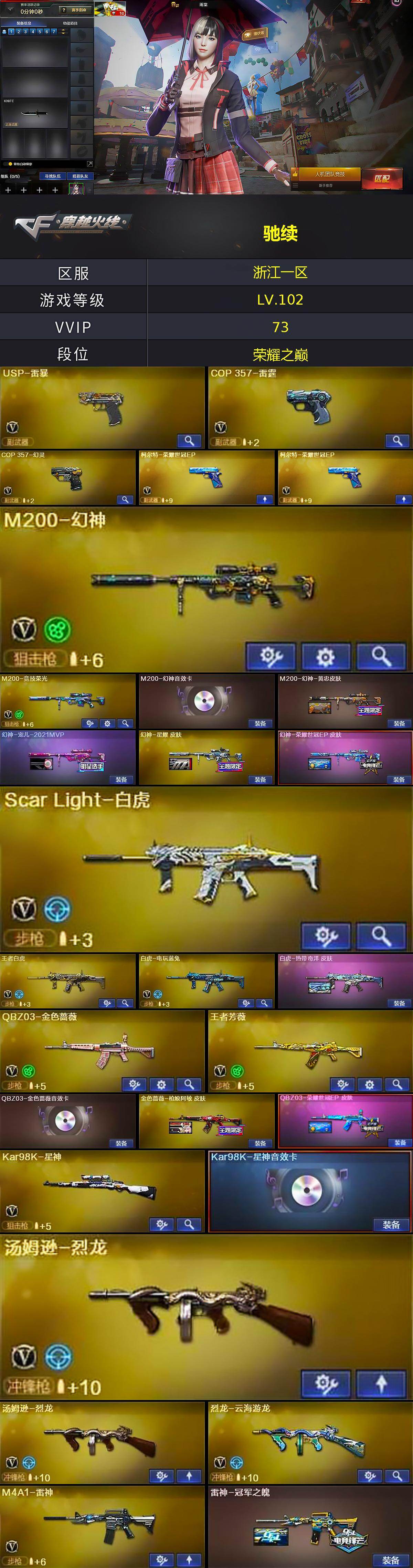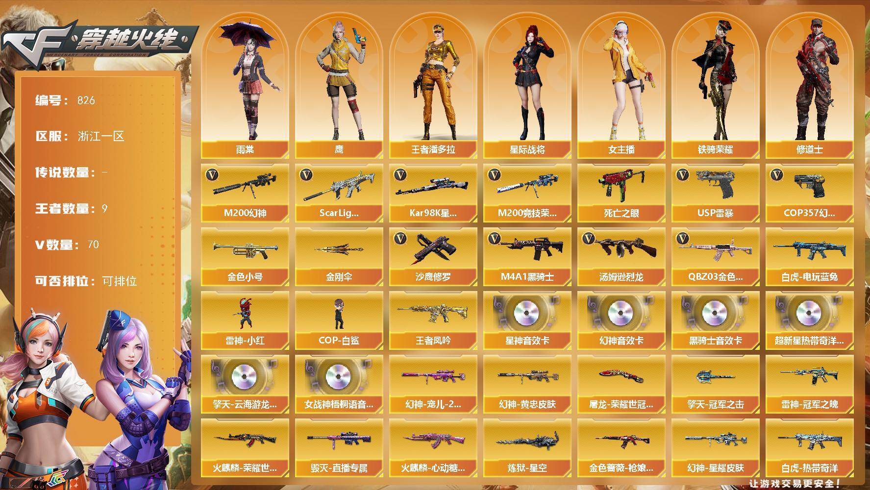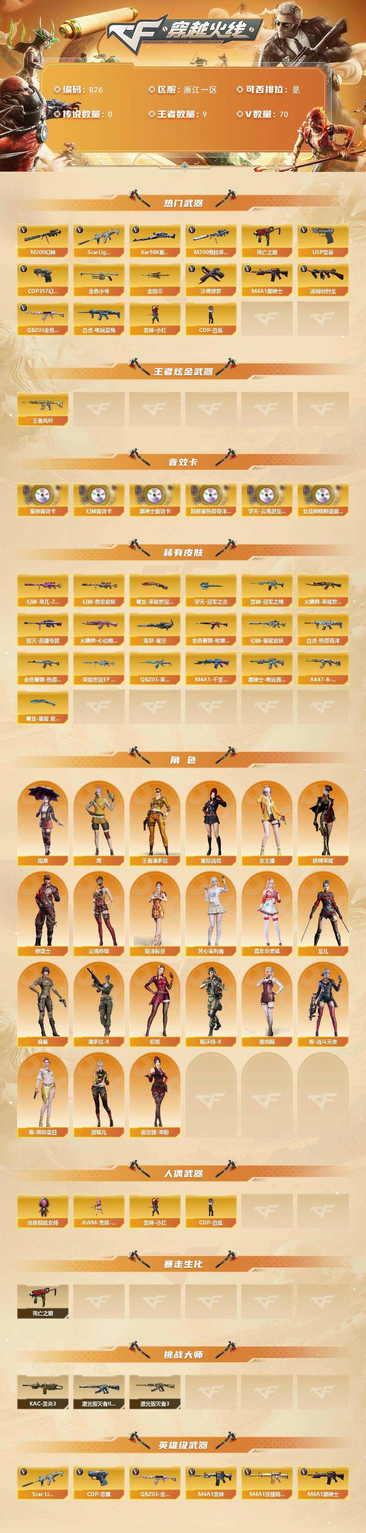 [15522873]浙江一区-70V-9王者-0炫金 【热门武器】:QBZ03-金色蔷薇,Scar Light-白虎,M200-幻神,M200-竞技荣光,死亡之眼,白虎-电玩蓝兔,Kar98K-星神,金色小号,M4A1-黑骑士,汤姆逊-烈龙*2,雷神-小红,COP-白鲨,USP-雷暴,COP 357-幻灵,沙鹰-修罗*2,金刚伞 【王者炫金武器】:王者凤吟 【音效卡】:擎天-云海游龙音效卡,AN94-超新星-热带奇洋音效卡,M200-幻神音效卡,M4A1-黑骑士音效卡,Kar98K-星神音效卡,女战神梧桐语音包 【皮肤】:M200-幻神-黄忠皮肤,幻神-宠儿-2021MVP,幻神-星耀 皮肤,幻神-荣耀世冠EP 皮肤,白虎-热带奇洋 皮肤,金色蔷薇-枪娘阿敏 皮肤,金色蔷薇-热带奇洋 皮肤,QBZ03-荣耀世冠EP 皮肤,雷神-冠军之魄,火麒麟-荣耀世冠AG,火麒麟-心动糖果,毁灭-直播专属,M4A1-千变-孔明皮肤,黑骑士-电玩青兔皮肤,超新星-深海萌鲨 皮肤,AK47-B-常胜将军-刘备,炼狱-星空,屠龙-荣耀世冠AG,屠龙-星耀 皮肤*2,擎天-冠军之击 【角色】:雨棠,鹰,星际战将,王者潘多拉,奇洋探员,修道士,云海玲珑,芳心审判者,嘉年华灵狐,龙儿,麻雀,女主播,潘多拉-X,蛇姬,斯沃特-X,铁骑荣耀,维纳斯,夜玫瑰-宠粉,樱-战斗天使,樱-缤纷夏日,游珑儿 【人偶武器】:雷神-小红,COP-白鲨,AWM-灵狐-15周年嘉年华*2,迷你超能女侍 【暴走生化】:死亡之眼 【挑战大师】:激光毁灭者III-白马银枪,激光毁灭者III,KAC-圣炎切割者III 【英雄级武器】:M4A1-千变,AK47-火麒麟*2,M4A1-雷神,M4A1-黑骑士,AN94-超新星,Scar Light-白虎,无影-神兵利器,黑武士-锦绣游龙,超新星-热带奇洋,M4A1-玫瑰精灵,QBZ03-金色蔷薇,AK-47-猩红传说*2,AK47-B-战神*2,王者白虎-觉醒版,白虎-电玩蓝兔,王者芳薇-觉醒版,AWM-天龙,Barrett-毁灭,Barrett-极光,M200-幻神,Kar98K-星神,M200-竞技荣光,汤姆逊-烈龙*2,烈龙-云海游龙,沙鹰-修罗*2,沙鹰-天神,USP-雷暴,COP-雷霆,COP 357-幻灵,柯尔特-荣耀世冠EP*2,屠龙,龙啸,擎天,麒麟刺,幻灵之锋*3,擎天-云海