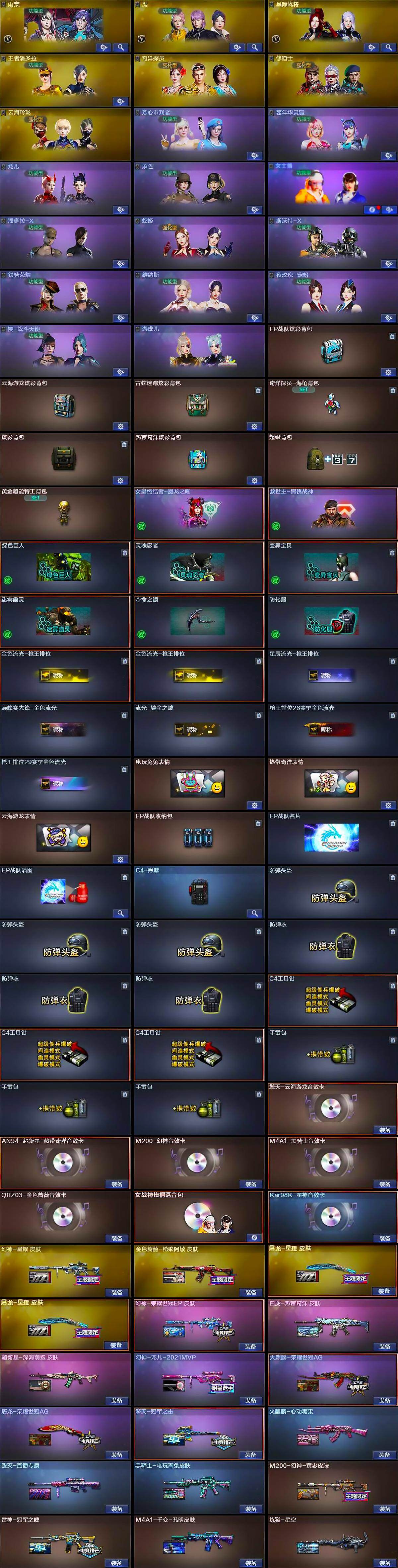 【皮肤】:M200-幻神-黄忠皮肤,幻神-宠儿-2021MVP,幻神-星耀 皮肤,幻神-荣耀世冠EP 皮肤,白虎-热带奇洋 皮肤,金色蔷薇-枪娘阿敏 皮肤,金色蔷薇-热带奇洋 皮肤,QBZ03-荣耀世冠EP 皮肤,雷神-冠军之魄,火麒麟-荣耀世冠AG,火麒麟-心动糖果,毁灭-直播专属,M4A1-千变-孔明皮肤,黑骑士-电玩青兔皮肤,超新星-深海萌鲨 皮肤,AK47-B-常胜将军-刘备,炼狱-星空,屠龙-荣耀世冠AG,屠龙-星耀 皮肤*2,擎天-冠军之击