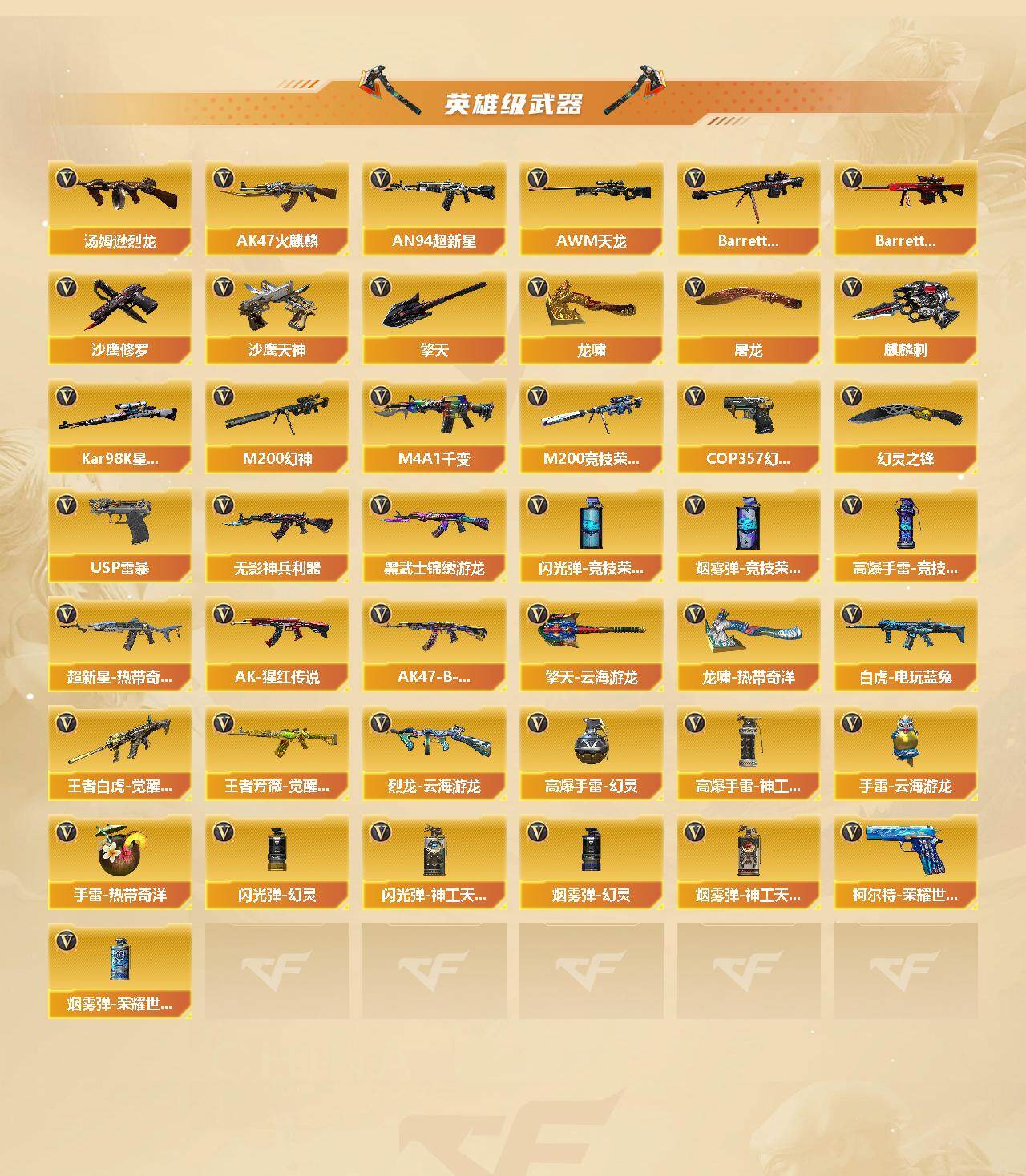 【英雄级武器】:M4A1-千变,AK47-火麒麟*2,M4A1-雷神,M4A1-黑骑士,AN94-超新星,Scar Light-白虎,无影-神兵利器,黑武士-锦绣游龙,超新星-热带奇洋,M4A1-玫瑰精灵,QBZ03-金色蔷薇,AK-47-猩红传说*2,AK47-B-战神*2,王者白虎-觉醒版,白虎-电玩蓝兔,王者芳薇-觉醒版,AWM-天龙,Barrett-毁灭,Barrett-极光,M200-幻神,Kar98K-星神,M200-竞技荣光,汤姆逊-烈龙*2,烈龙-云海游龙,沙鹰-修罗*2,沙鹰-天神,USP-雷暴,COP-雷霆,COP 357-幻灵,柯尔特-荣耀世冠EP*2,屠龙,龙啸,擎天,麒麟刺,幻灵之锋*3,擎天-云海