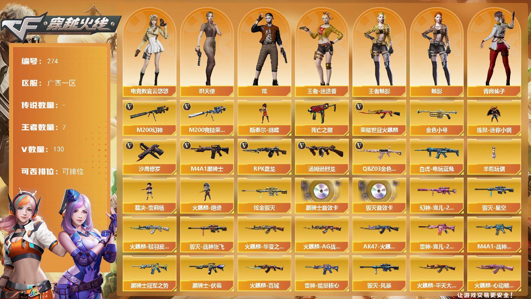[13035261]广西一区-130V-7王者-1炫金 【热门武器】:QBZ03-金色蔷薇,M200-幻神,M200-竞技荣光,死亡之眼*2,荣耀世冠-火麒麟,白虎-电玩蓝兔,金色小号,炼狱-迷你小钢,M4A1-黑骑士,汤姆逊-烈龙*5,RPK-盘龙*6,斯泰尔-蝴蝶,羊驼玩偶*5,裁决-雪莉杨*2,火麒麟-绝迹,沙鹰-修罗*4 【王者炫金武器】:炫金毁灭 【音效卡】:M4A1-黑骑士音效卡,Barrett-毁灭音效卡 【稀有皮肤】:幻神-宠儿-2021MVP,雷神-能量核心,M4A1-战神赵云,雷神-宠儿-2019MVP,火麒麟-AG战队皮肤,火麒麟-华夏之心,AK47-火麒麟-传奇EVEN,火麒麟-轻羽皮肤,火麒麟-平天大圣,火麒麟-百城,火麒麟-心动糖果,黑骑士-冠军之势,黑骑士-伏羲,毁灭-星空,毁灭-战神张飞,毁灭-风暴,AWM-天龙-传奇70KG,AWM-天龙-传奇白鲨 【角色】:王者-魅影,王者-迷迭香,魅影,炫,电竞教官-云悠悠,蜀雪,炽天使,青霞仙子 【人偶武器】:火麒麟-绝迹,裁决-雪莉杨*2,斯泰尔-蝴蝶,Barrett-夜玫瑰,M37-葵,COP-旗袍,炼狱-迷你小钢,迷你超能女侍,迷你生化手雷,深渊终结者手雷,闪光弹-小乔,闪光弹-貂蝉,高爆手雷-大乔 【暴走生化】:斯泰尔-蝴蝶,炼狱-迷你小钢,死亡之眼*2,超级对讲机 【挑战大师】:神圣爆裂者III*2,阐释者III,激光毁灭者III-白马银枪*2 【英雄级武器】:M200-竞技荣光,柯尔特-竞技荣光,擎天-竞技荣光,高爆手雷-竞技荣光*6,烟雾弹-竞技荣光*7,闪光弹-竞技荣光*7,幻灵之锋,马来剑-夜魔,斩神刀-雷暴,M4A1-雷霆*2,荣耀世冠-火麒麟,QBZ03-金色蔷薇,白虎-电玩蓝兔,M4A1-雷神*3,M4A1-黑龙,M4A1-黑骑士,M4A1-死神,RPK-盘龙*6,汤姆逊-烈龙*5,AK47-火麒麟*3,AK47-黑武士*2,AK12-天启,AWM-天龙*3,Barrett-毁灭*3,Barrett-极光,AWM-裁决,AA-12-雷霆,M200-幻神,AK47-黑鲨*2,AK-47-猩红传说*12,AK47-B-战神*2,AK47-B-常胜将军,炼狱-风暴,M4A1-赤狱骑士,沙鹰-天神*3,沙鹰-修罗*4,麒麟刺*3,擎天*2,龙啸,屠龙*3 【特殊枪械】:蝴蝶斯泰尔+5烈龙,1黑骑