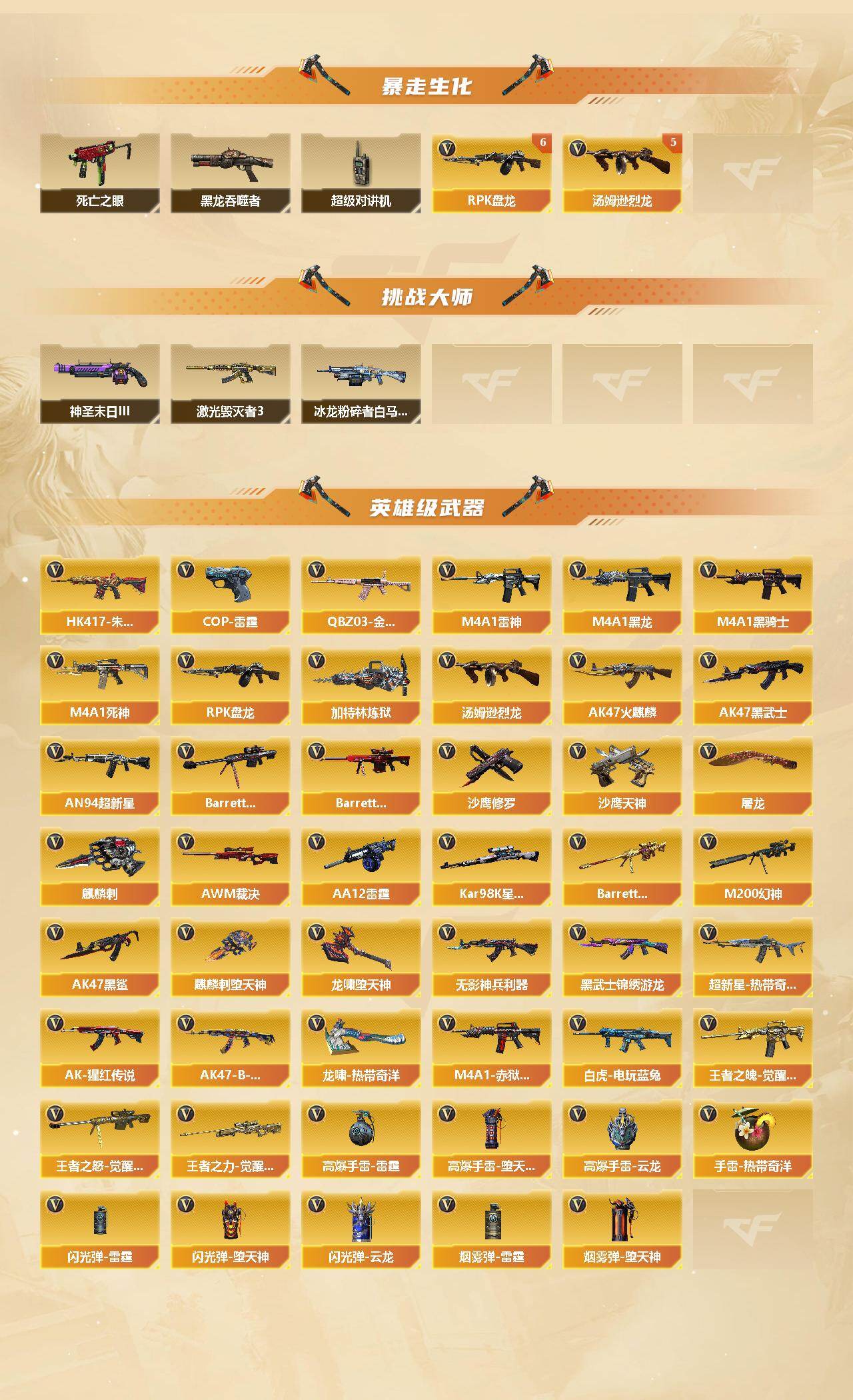 【英雄级武器】:AK47-火麒麟,M4A1-黑龙,M4A1-雷神,M4A1-黑骑士,M4A1-死神,AK47-黑武士,AN94-超新星,AK47-黑鲨,HK417-朱雀,无影-神兵利器,黑武士-锦绣游龙,超新星-热带奇洋,QBZ03-金色蔷薇,王者之魄-觉醒版*2,AK-47-猩红传说*3,AK47-B-战神,白虎-电玩蓝兔,Barrett-毁灭,Barrett-极光,AWM-裁决,M2