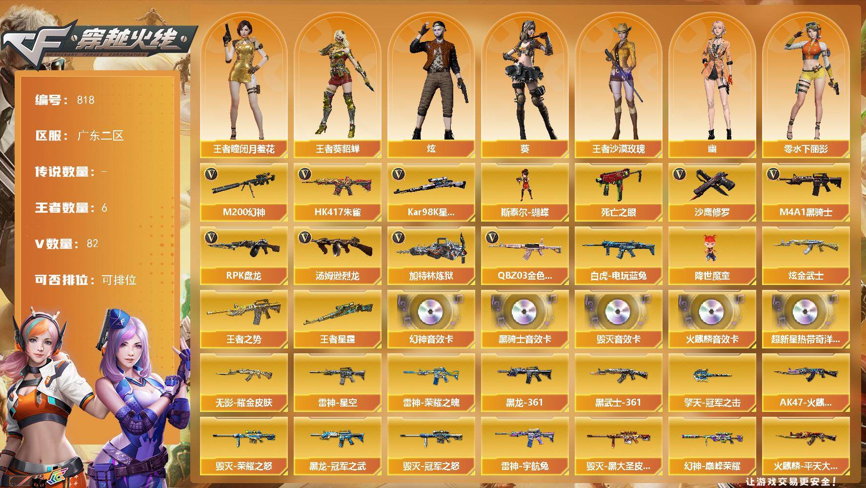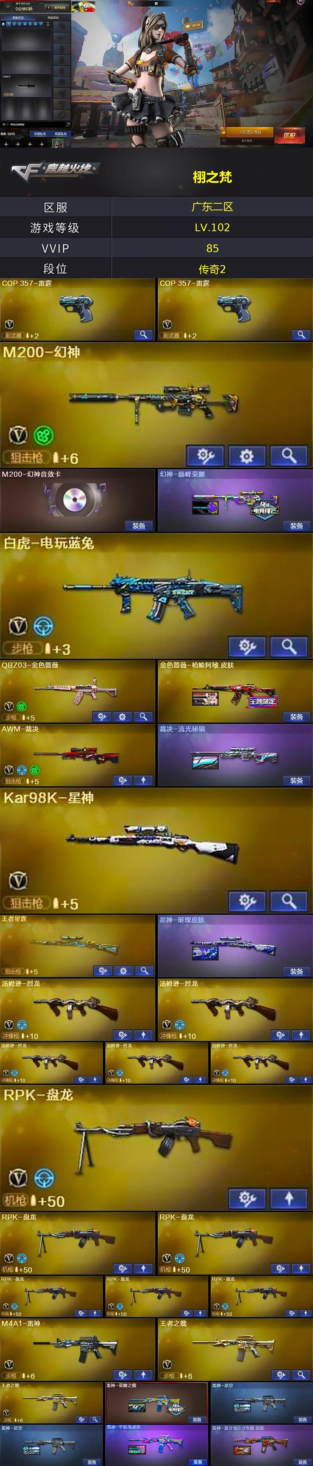 [15523078]广东二区-82V-6王者-1炫金 【热门武器】:QBZ03-金色蔷薇,HK417-朱雀,M200-幻神,死亡之眼,白虎-电玩蓝兔,Kar98K-星神,M4A1-黑骑士,汤姆逊-烈龙*5,RPK-盘龙*6,加特林-炼狱*2,斯泰尔-蝴蝶,降世魔童,沙鹰-修罗*4 【王者炫金武器】:王者之势,王者星霆,炫金武士 【音效卡】:AN94-超新星-热带奇洋音效卡,M200-幻神音效卡,AK47-火麒麟音效卡,M4A1-黑骑士音效卡,Barrett-毁灭音效卡 【皮肤】:幻神-巅峰荣耀,金色蔷薇-枪娘阿敏 皮肤,裁决-流光秘银,星神-璀璨皮肤,雷神-荣耀之魄,雷神-星空*2,雷神-宇航兔皮肤,雷神-源计划2.0专属 皮肤,AK47-火麒麟-传奇EVEN,火麒麟-平天大圣,火麒麟-心动糖果,毁灭-荣耀之怒,毁灭-冠军之怒,毁灭-黑大圣皮肤,M4A1-千变-孔明皮肤,黑龙-能量核心,M4A1-黑龙-361,黑龙-冠军之武,无影耀金皮肤,AK47-黑武士-361,战神-粉色甜心皮肤*2,战神-紫绶金章皮肤*2,战神-流金岁月皮肤*2,AK47-B-常胜将军-孙权*2,AWM-天龙-传奇白鲨,极光-能量核心,炼狱-玩具枪皮肤,擎天-冠军之击 【角色】:葵,炫,战地猎狐,王者-瞳-闭月羞花,王者-葵-貂蝉,王者沙漠玫瑰,奇洋探员,乔伊教练,空,暗夜-X,芳心审判者,飞虎队-X,嘉年华灵狐,兰-海滩派对,零-水下丽影,灵狐者-X,灵狐者-七夕宝贝,龙儿,曼陀罗-礼服,潘多拉-X,斯沃特-X,铁骑荣耀,兔囡囡,新娜塔莎,幽,游珑儿 【人偶武器】:天龙-曼陀罗,斯泰尔-蝴蝶,AWM-灵狐-15周年嘉年华*2,M37-葵,迷你生化手雷,闪光弹-小乔,迷你超能女侍,灵狐娃娃手雷,降世魔童 【暴走生化】:黑龙吞噬者,死亡之眼,超级对讲机 【挑战大师】:冰龙粉碎者-白马银枪,激光毁灭者III,神圣爆裂者-末日III 【英雄级武器】:AK47-火麒麟,M4A1-黑龙,M4A1-雷神,M4A1-黑骑士,M4A1-死神,AK47-黑武士,AN94-超新星,AK47-黑鲨,HK417-朱雀,无影-神兵利器,黑武士-锦绣游龙,超新星-热带奇洋,QBZ03-金色蔷薇,王者之魄-觉醒版*2,AK-47-猩红传说*3,AK47-B-战神,白虎-电玩蓝兔,Barrett-毁灭,Barrett-极光,AWM-裁决,M2