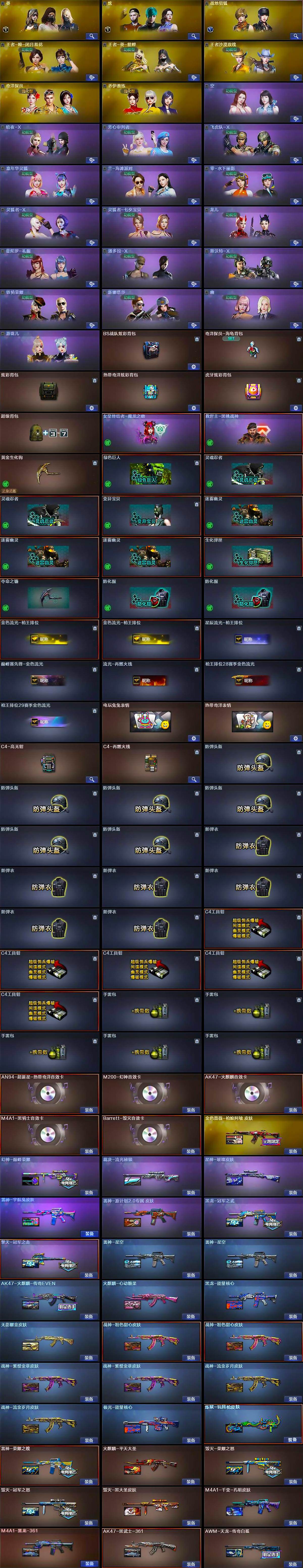 【皮肤】:幻神-巅峰荣耀,金色蔷薇-枪娘阿敏 皮肤,裁决-流光秘银,星神-璀璨皮肤,雷神-荣耀之魄,雷神-星空*2,雷神-宇航兔皮肤,雷神-源计划2.0专属 皮肤,AK47-火麒麟-传奇EVEN,火麒麟-平天大圣,火麒麟-心动糖果,毁灭-荣耀之怒,毁灭-冠军之怒,毁灭-黑大圣皮肤,M4A1-千变-孔明皮肤,黑龙-能量核心,M4A1-黑龙-361,黑龙-冠军之武,无影耀金皮肤,AK47-黑武士-361,战神-粉色甜心皮肤*2,战神-紫绶金章皮肤*2,战神-流金岁月皮肤*2,AK47-B-常胜将军-孙权*2,AWM-天龙-传奇白鲨,极光-能量核心,炼狱-玩具枪皮肤,擎天-冠军之击