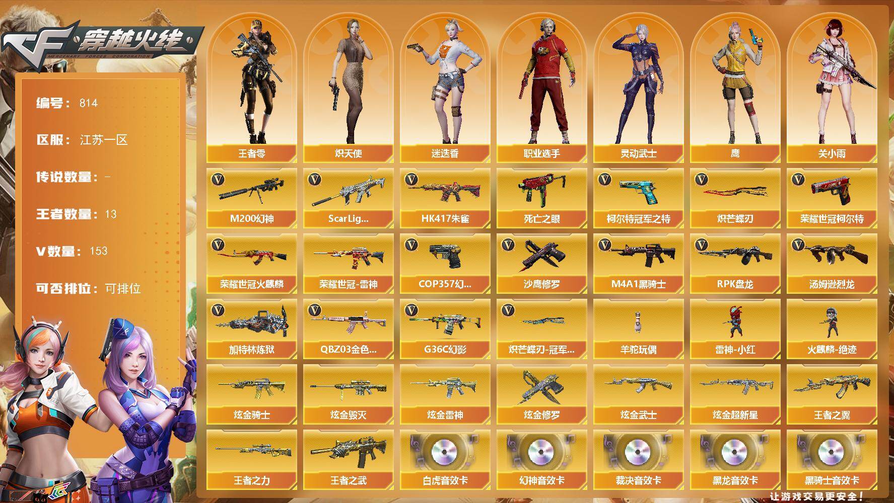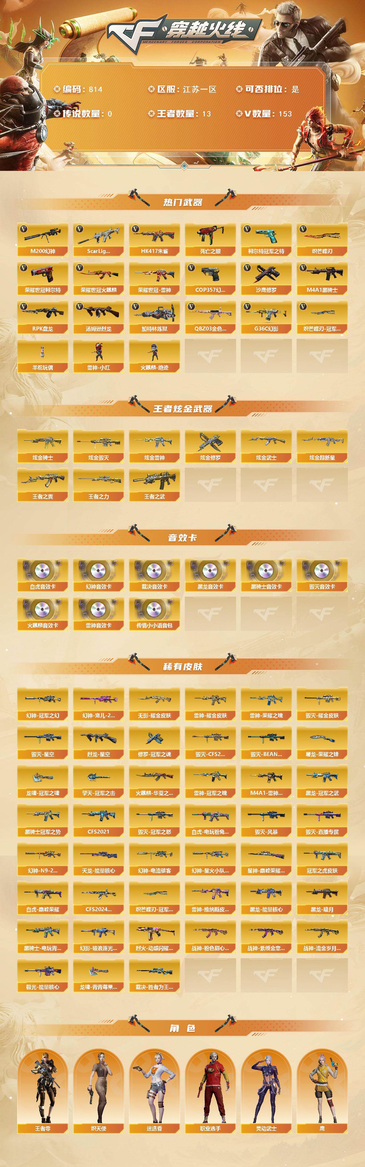 [15523254]江苏一区-153V-13王者-9炫金 【热门武器】:G36C-幻影,QBZ03-金色蔷薇,Scar Light-白虎,HK417-朱雀,M200-幻神,死亡之眼,荣耀世冠-火麒麟,荣耀世冠-雷神,柯尔特-冠军之特,荣耀世冠-柯尔特,M4A1-黑骑士,汤姆逊-烈龙*6,RPK-盘龙*6,加特林-炼狱*2,羊驼玩偶,雷神-小红,火麒麟-绝迹,COP 357-幻灵,沙鹰-修罗*5,炽芒蝶刃,炽芒蝶刃-冠军炽芒皮肤 【王者炫金武器】:王者之翼*2,王者之武,王者之力,炫金骑士,炫金雷神*2,炫金武士,炫金超新星,炫金毁灭*3,炫金修罗 【音效卡】:M200-幻神音效卡,AK47-火麒麟音效卡,M4A1-雷神音效卡*2,M4A1-黑龙音效卡,M4A1-黑骑士音效卡*2,Barrett-毁灭音效卡,AWM-裁决音效卡,Scar Light-白虎音效卡,传情小小语音包 【皮肤】:幻神-冠军之幻,幻神-宠儿-2021MVP,M200-幻神-N9-2022MVP,幻神-电流骇客 皮肤,幻神-星火小队签名臻藏版 皮肤,白虎-电玩粉兔皮肤,ScarLight-白虎-冠军之虎皮肤,白虎-巅峰荣耀 皮肤,QBZ03-CFS2024 皮肤,裁决-胜者为王 皮肤,星神-巅峰荣耀 皮肤,烈龙-星空,雷神-荣耀之魄,M4A1-雷神-CFS 2019,雷神-耀金皮肤,雷神-冠军之魄,雷神-维纳斯皮肤,火麒麟-华夏之心,毁灭耀金皮肤,毁灭-星空,毁灭-冠军之怒,毁灭-CFS2020,毁灭-BEAN-2020MVP,毁灭-风暴,毁灭-直播专属,黑龙-能量核心*2,黑龙-暗月,黑龙-冠军之武,黑骑士-冠军之势,黑骑士-CFS2021,黑骑士-电玩青兔皮肤,无影耀金皮肤,幻影-破浪逐光 皮肤,烈火-动感闪耀 皮肤*2,战神-粉色甜心皮肤,战神-紫绶金章皮肤*5,战神-流金岁月皮肤*4,天龙-能量核心,极光-能量核心,修罗-冠军之魂,屠龙-荣耀之锋,龙啸-冠军之啸,龙啸-青青莓果 皮肤,擎天-冠军之击*2,炽芒蝶刃-冠军炽芒皮肤 【角色】:零,迷迭香,鹰,关小雨,玄豹,战地猎狐,王者-零,奇洋探员,乔伊教练,炽天使,飞虎队-X,嘉年华灵狐,兰-新年限定,猎狐者-追月,灵动武士,灵狐者-黄金海岸,潘多拉-X,兔囡囡,新娜塔莎,游珑儿,职业选手 【人偶武器】:雷神-小红,火麒麟-绝迹,巴雷特-零-水下丽影*2,A