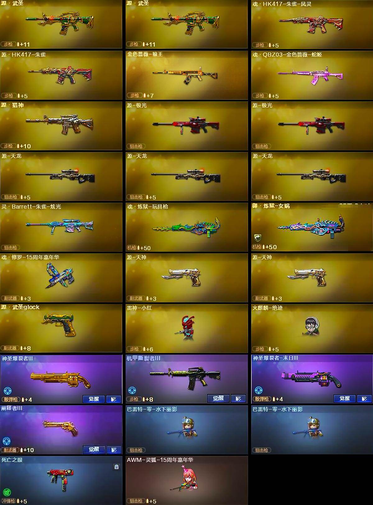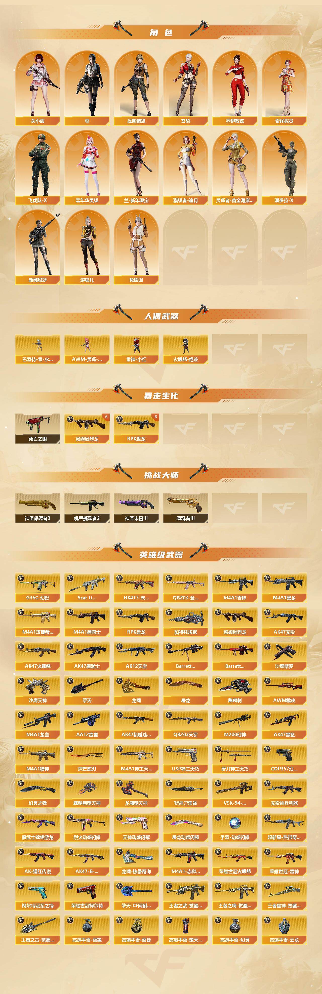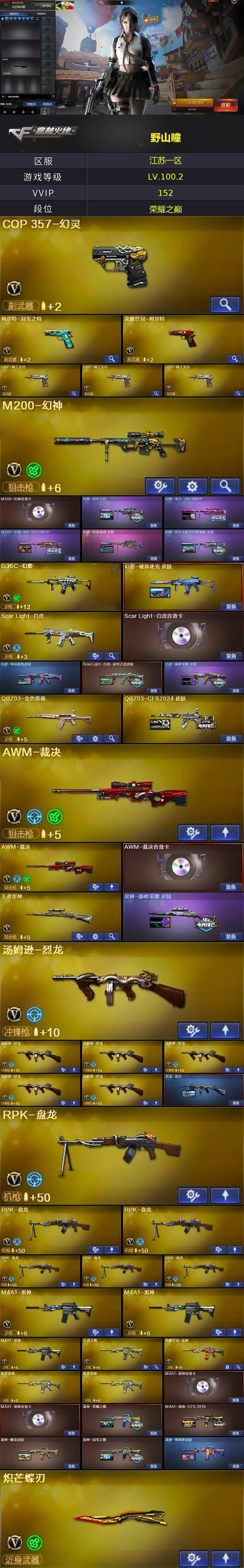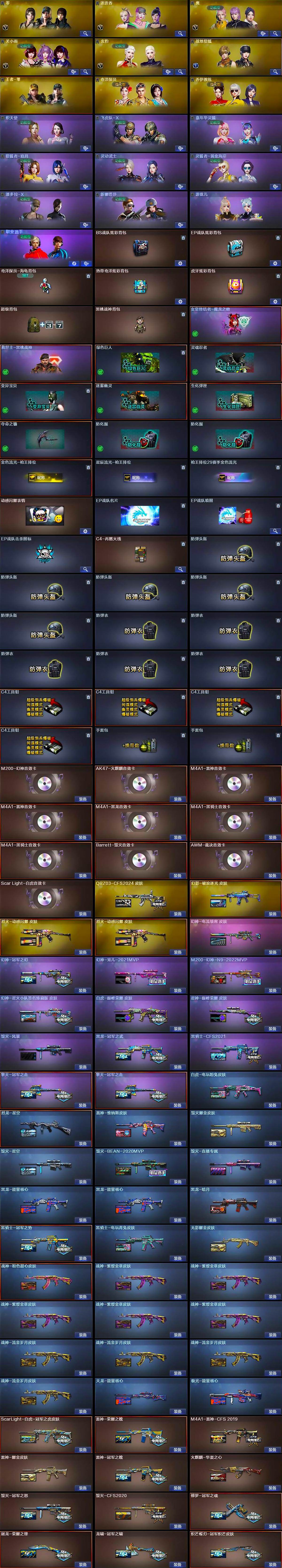 【皮肤】:幻神-冠军之幻,幻神-宠儿-2021MVP,M200-幻神-N9-2022MVP,幻神-电流骇客 皮肤,幻神-星火小队签名臻藏版 皮肤,白虎-电玩粉兔皮肤,ScarLight-白虎-冠军之虎皮肤,白虎-巅峰荣耀 皮肤,QBZ03-CFS2024 皮肤,裁决-胜者为王 皮肤,星神-巅峰荣耀 皮肤,烈龙-星空,雷神-荣耀之魄,M4A1-雷神-CFS 2019,雷神-耀金皮肤,雷神-冠军之魄,雷神-维纳斯皮肤,火麒麟-华夏之心,毁灭耀金皮肤,毁灭-星空,毁灭-冠军之怒,毁灭-CFS2020,毁灭-BEAN-2020MVP,毁灭-风暴,毁灭-直播专属,黑龙-能量核心*2,黑龙-暗月,黑龙-冠军之武,黑骑士-冠军之势,黑骑士-CFS2021,黑骑士-电玩青兔皮肤,无影耀金皮肤,幻影-破浪逐光 皮肤,烈火-动感闪耀 皮肤*2,战神-粉色甜心皮肤,战神-紫绶金章皮肤*5,战神-流金岁月皮肤*4,天龙-能量核心,极光-能量核心,修罗-冠军之魂,屠龙-荣耀之锋,龙啸-冠军之啸,龙啸-青青莓果 皮肤,擎天-冠军之击*2,炽芒蝶刃-冠军炽芒皮肤