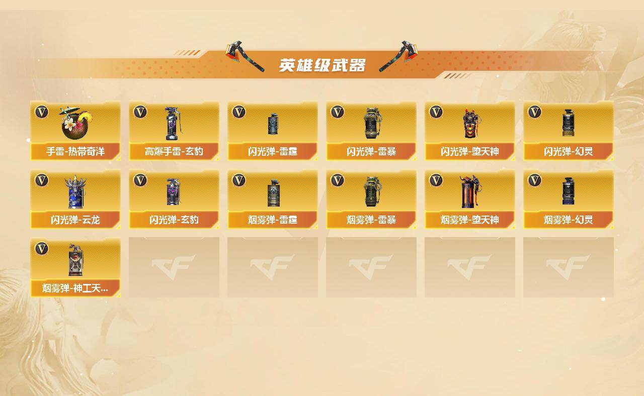 【热门武器】:G36C-幻影,QBZ03-金色蔷薇,Scar Light-白虎,HK417-朱雀,M200-幻神,死亡之眼,荣耀世冠-火麒麟,荣耀世冠-雷神,柯尔特-冠军之特,荣耀世冠-柯尔特,M4A1-黑骑士,汤姆逊-烈龙*6,RPK-盘龙*6,加特林-炼狱*2,羊驼玩偶,雷神-小红,火麒麟-绝迹,COP 357-幻灵,沙鹰-修罗*5,炽芒蝶刃,炽芒蝶刃-冠军炽芒皮肤