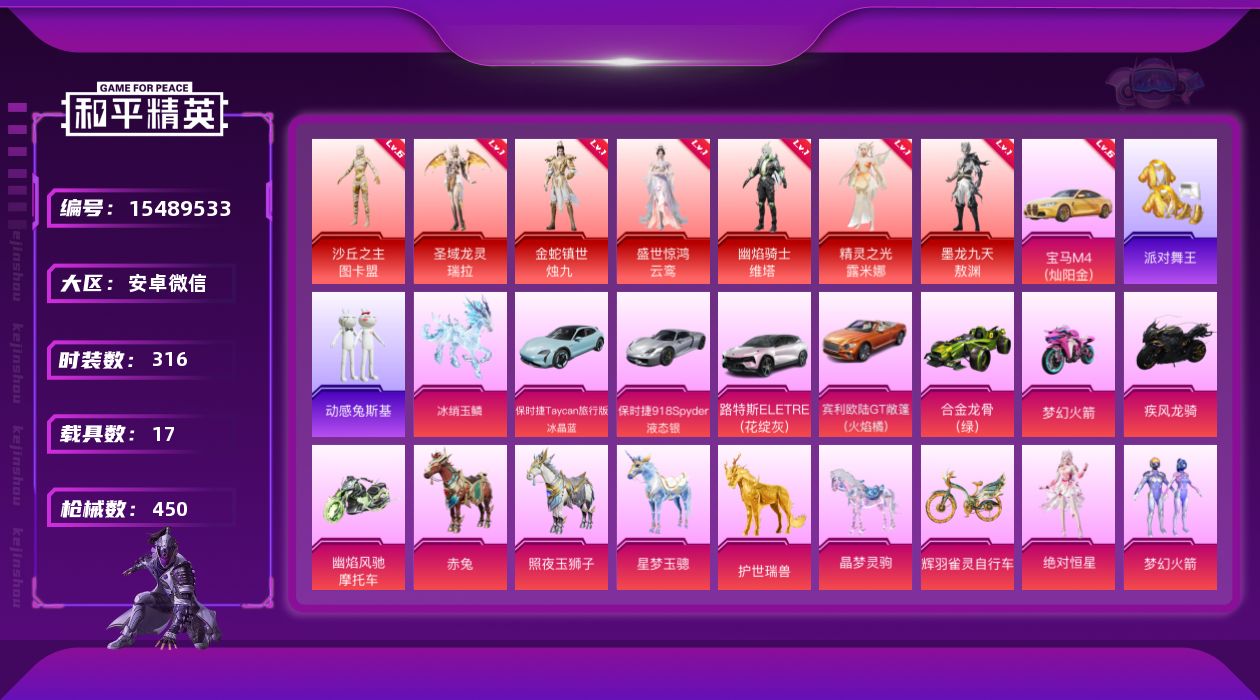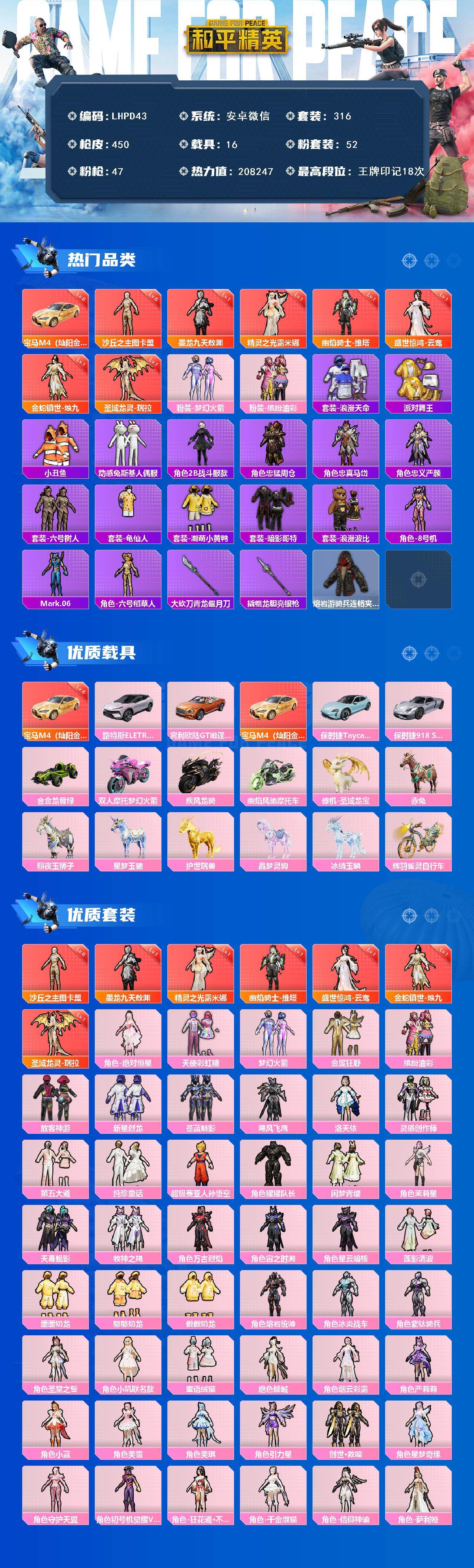 [15489533]7套6级红装可随意切换等级【特价出售/店主推荐/可直接二次换绑】安卓 微信-7神装-52粉装-47特效枪-17载具-30粉色飞行器-208247热力值-18王牌印记-316套装-450枪皮【红色载具】:宝马M4(灿阳金)(六级)【红色神装等级】:圣域龙灵-瑞拉(一级),金蛇镇世-烛九(一级),盛世惊鸿-云鸾(一级),幽焰骑士-维塔(一级),精灵之光-露米娜(一级),墨龙九天-敖渊(一级),沙丘之主-图卡盟(六级)【红色角色神装】:圣域龙灵-瑞拉,金蛇镇世-烛九,盛世惊鸿-云鸾,幽焰骑士-维塔,精灵之光-露米娜,墨龙九天-敖渊,沙丘之主-图卡盟【热门品类】:粉装-梦幻火箭,粉装-缤纷油彩,套装-浪漫天命,套装-派对舞王,套装-小丑鱼,套装-动感兔斯基人偶服,角色-2B战斗服款,角色-忠猛周仓,角色-忠真马岱,角色-忠义严颜,套装-六号树人,套装-龟仙人,套装-潮萌小黄鸭,套装-暗影哥特,套装-浪漫波比,角色-8号机,角色-Mark.06,角色-六号稻草人,大砍刀-青龙偃月刀,撬棍-龙胆亮银枪,熔岩游骑兵连帽夹克【粉色套装】:角色-绝对恒星,粉装-天使彩虹糖,粉装-梦幻火箭,粉装-金属狂野,粉装-缤纷油彩,粉装-放客神游,粉装-新星烈龙,粉装-苍蓝魅影,粉装-飓风飞鹰,角色-洛天依,粉装-灵感创作师,粉装-第五大道,粉装-纯珍童话,超级赛亚人-孙悟空,角色-猩猩队长,粉装-闲梦青缨,角色-茉莉星,粉装-天幕蝎影,粉装-牧神之羯,角色-万古烈焰,角色-宙之时溯,角色-星云暗核,粉装-莲影清波,粉装-暖暖奶龙,粉装-憨憨奶龙,粉装-傲傲奶龙,角色-熔岩统帅,角色-冰炎战车,角色-紫钛骑兵,角色-圣堂之誓,角色-小叽联名款,粉装-蜜语绒猫,角色-绝色倾城,角色-烟云彩露,角色-严莉莉,角色-小蓝,角色-美雪,角色-美琪,角色-引力星,套装-创世·救赎,角色-星梦奇缘,角色-守护天翼,角色-初号机 觉醒Ver.,角色-狂花道·不知火舞,角色-千金淑猫,角色-信仰神谕,角色-萨利娅,角色-樱桃泡泡,角色-智耀战神,粉装-幻彩电音,角色-罗征,角色-荧海星豚【粉色枪皮等级】:AKM-梦之光华(一级),AKM-绿萝繁花(五级),AKM-幽焰骑士(三级),SCAR-L-梦幻火箭(一级),SCAR-L-万古烈焰(一级),SCAR-L-金蛇镇世(三级),M416-心之恋语(四级),M41
