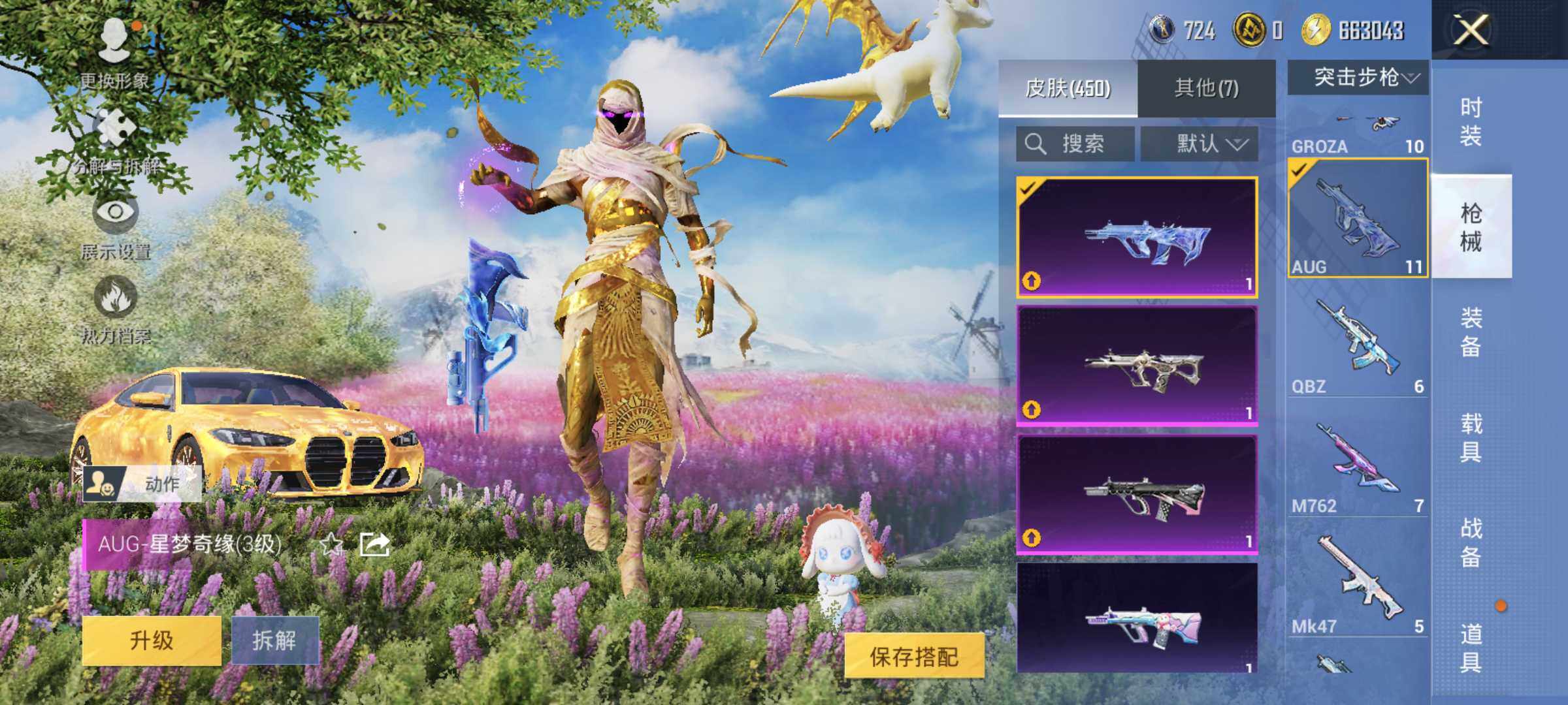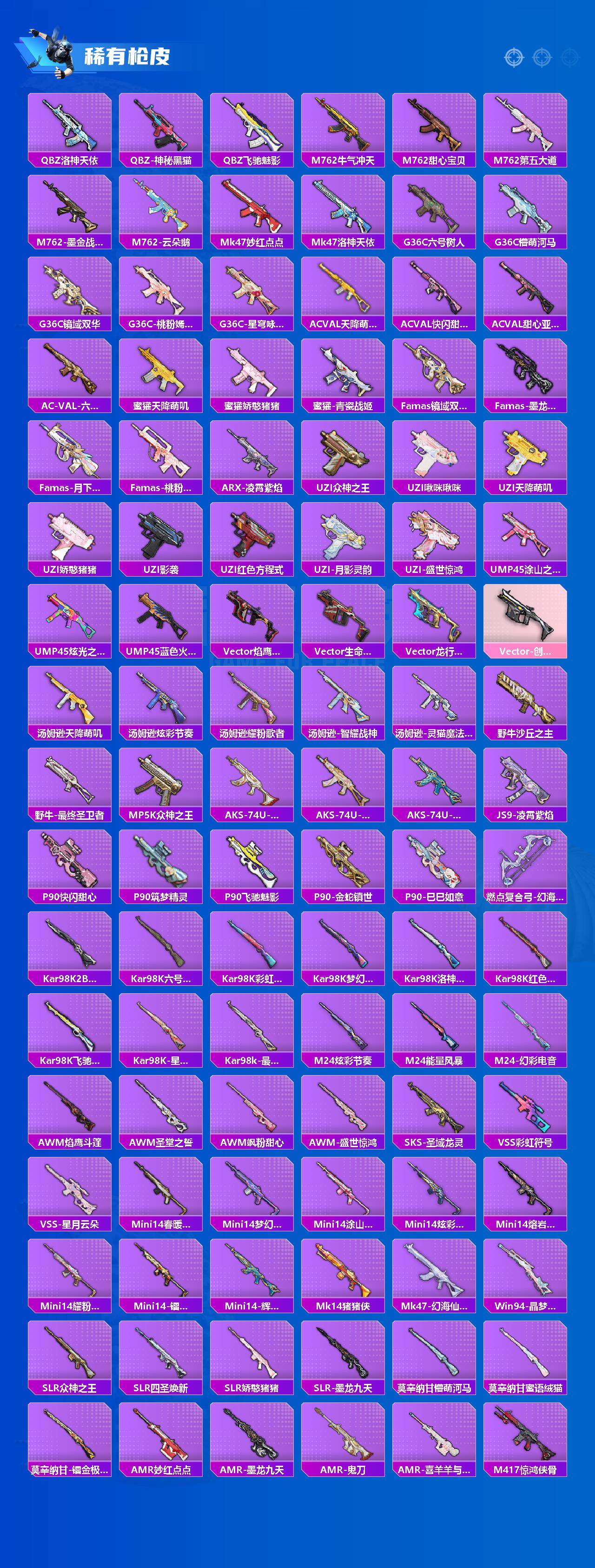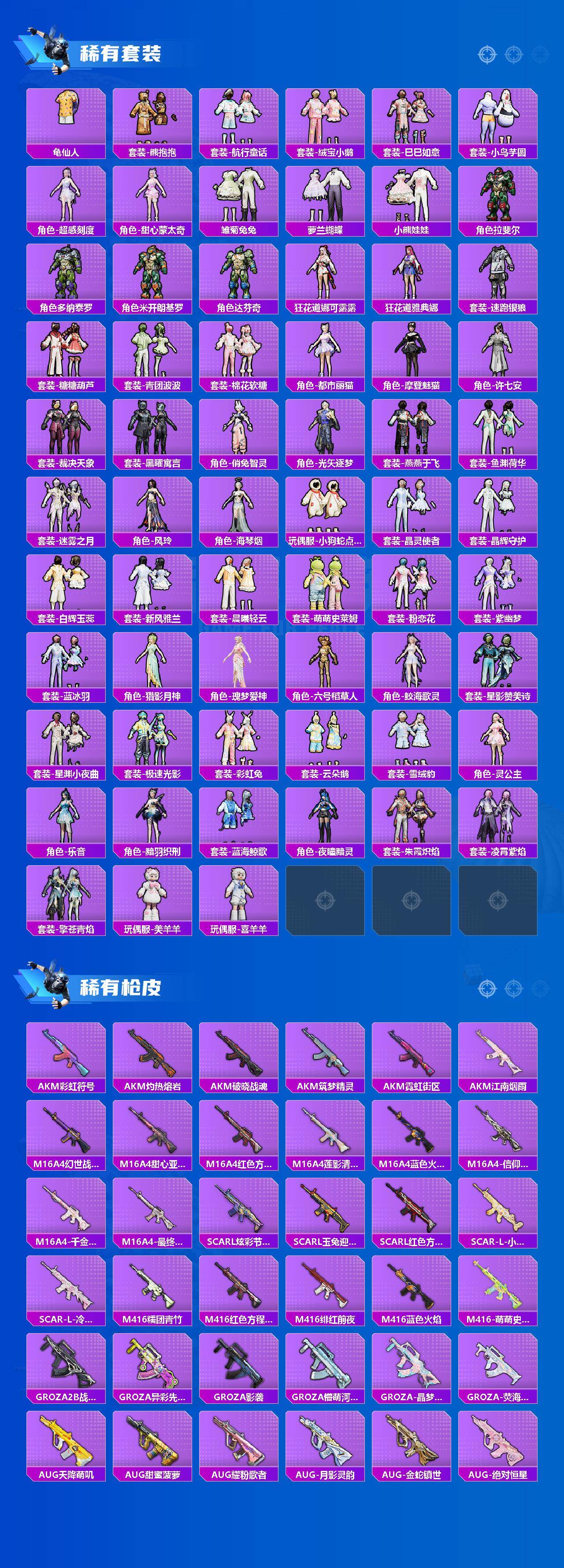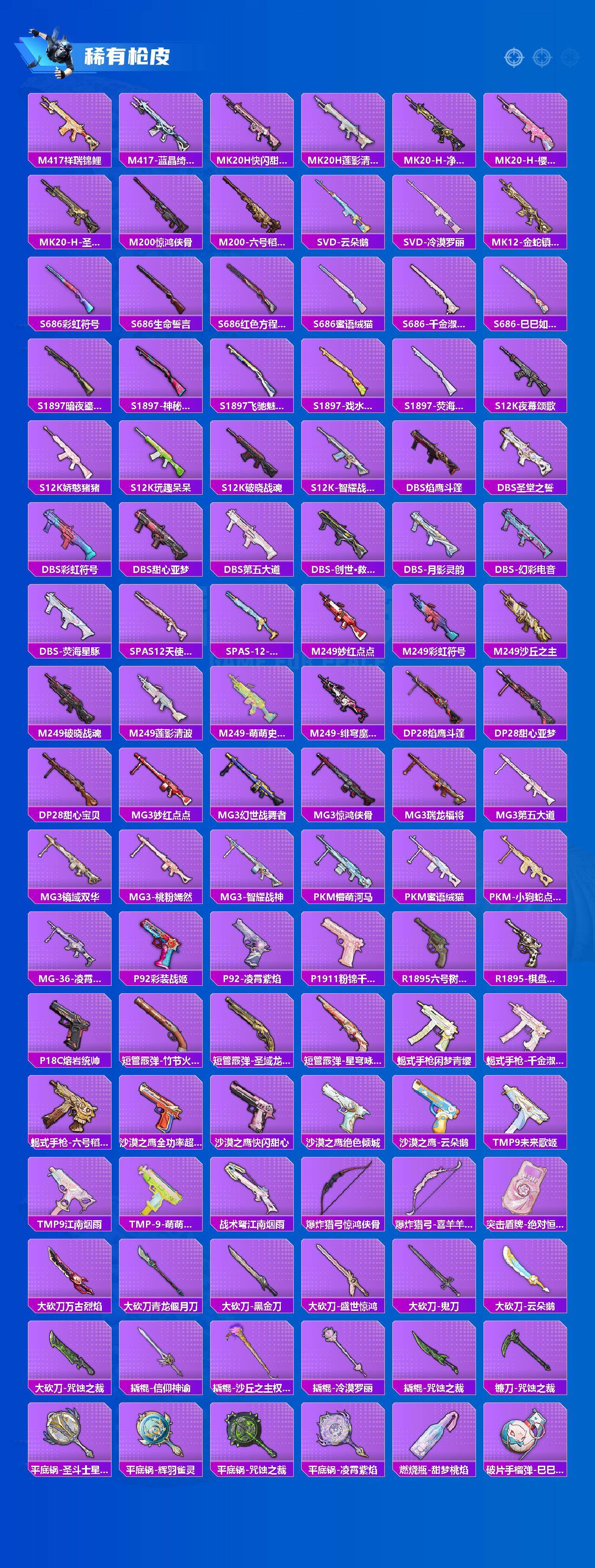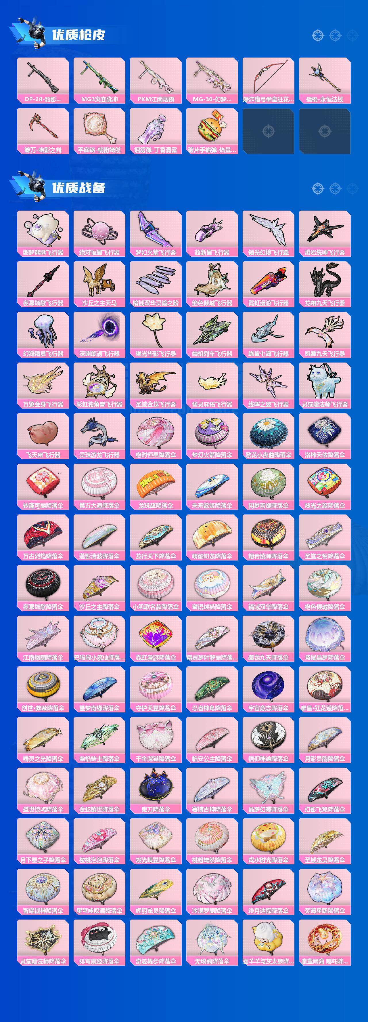 AKM-梦之光华,AKM-绿萝繁花,AKM-幽焰骑士,SCAR-L-梦幻火箭,SCAR-L-金蛇镇世,M416-心之恋语,M416-墨龙九天,GROZA-巴啦啦小魔仙,GROZA-精灵之光,AUG-超新星,AUG-星梦奇缘,AUG-许七安,M762-电糖天使,Famas-觉醒初号机,UMP45-量子极限,UMP45-宇宙意志,AKS-74U-信仰神谕,P90-沙丘之主,Kar98K-创世·救赎,Kar98K-巳巳如意,Kar98K-圣域龙灵,M24-莲影清波,Mk14-精灵梦叶罗丽,Mk14-盛世惊鸿,AMR-鸢尾晶梦,M200-梦海之灵,SVD-月影灵韵,SPAS-12-蜜语绒猫,DP-28-圣堂之誓,DP-28-千金淑猫,MG3-突变脉冲,PKM-江南烟雨,MG-36-幻梦之森,爆炸猎弓-拳皇·狂花道,平底锅-桃粉嫣然,烟雾弹-丁香清露,破片手榴弹-热量炸弹