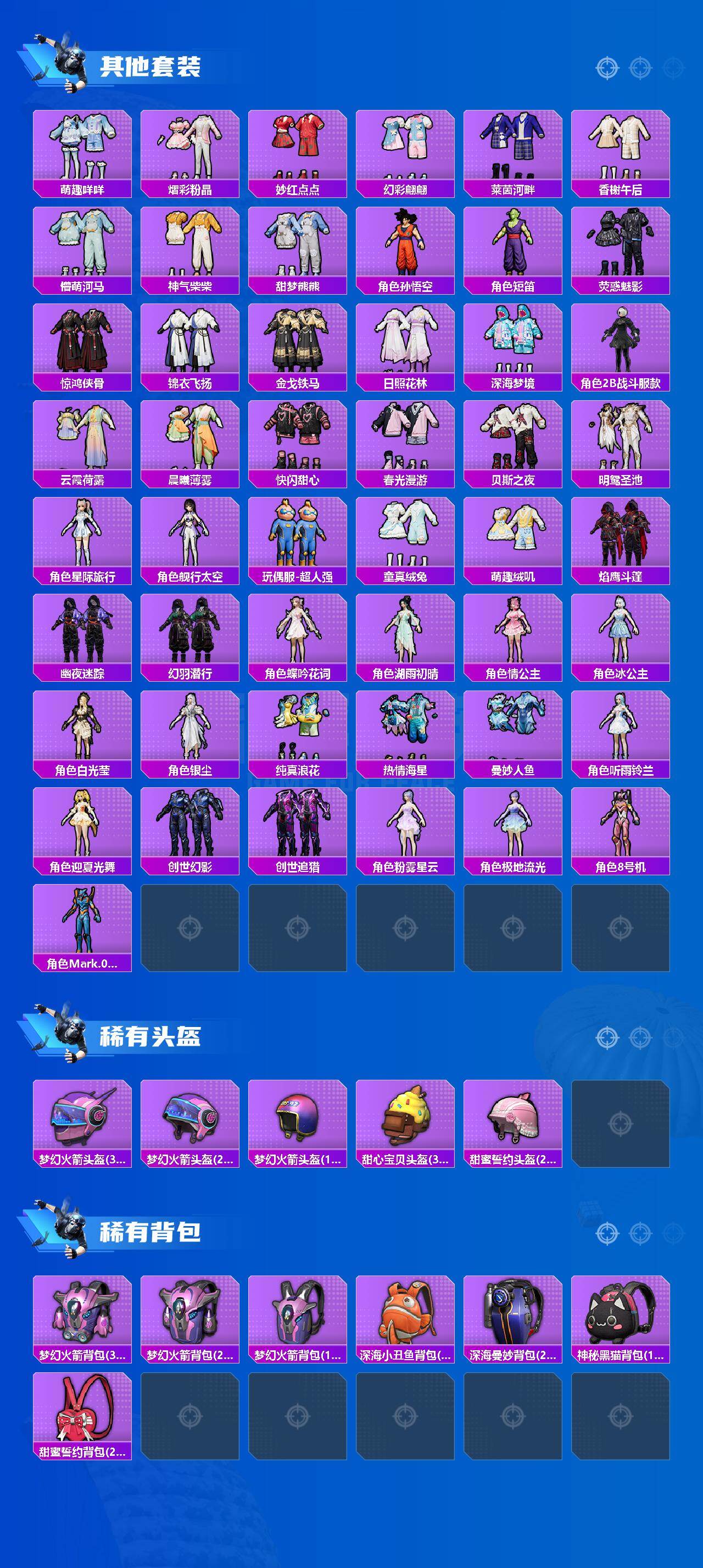 套装-浪漫天命,套装-六号树人,套装-龟仙人,套装-暗影哥特,角色-8号机,角色-Mark.06,套装-极速红龙,套装-破蛋小黄鸡,套装-漫步者,套装-雪山精英,套装-暗夜契约