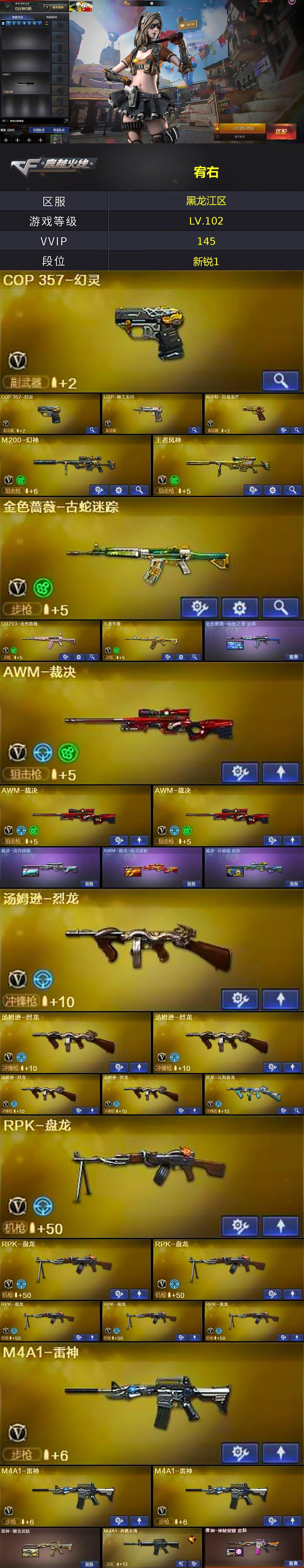 【热门武器】:QBZ03-金色蔷薇,M14EBR-玄武,HK417-朱雀,M4A1-青龙,M200-幻神,金色蔷薇-古蛇迷踪,修罗-古蛇迷踪,死亡之眼,金色小号,炼狱-迷你小钢,M4A1-黑骑士,汤姆逊-烈龙*5,RPK-盘龙*6,加特林-炼狱,斯泰尔-蝴蝶,雷神-小红,毁灭-孙三炮,COP 357-幻灵*2,沙鹰-修罗*3,黄金猫猫手套-白鲨,金刚伞