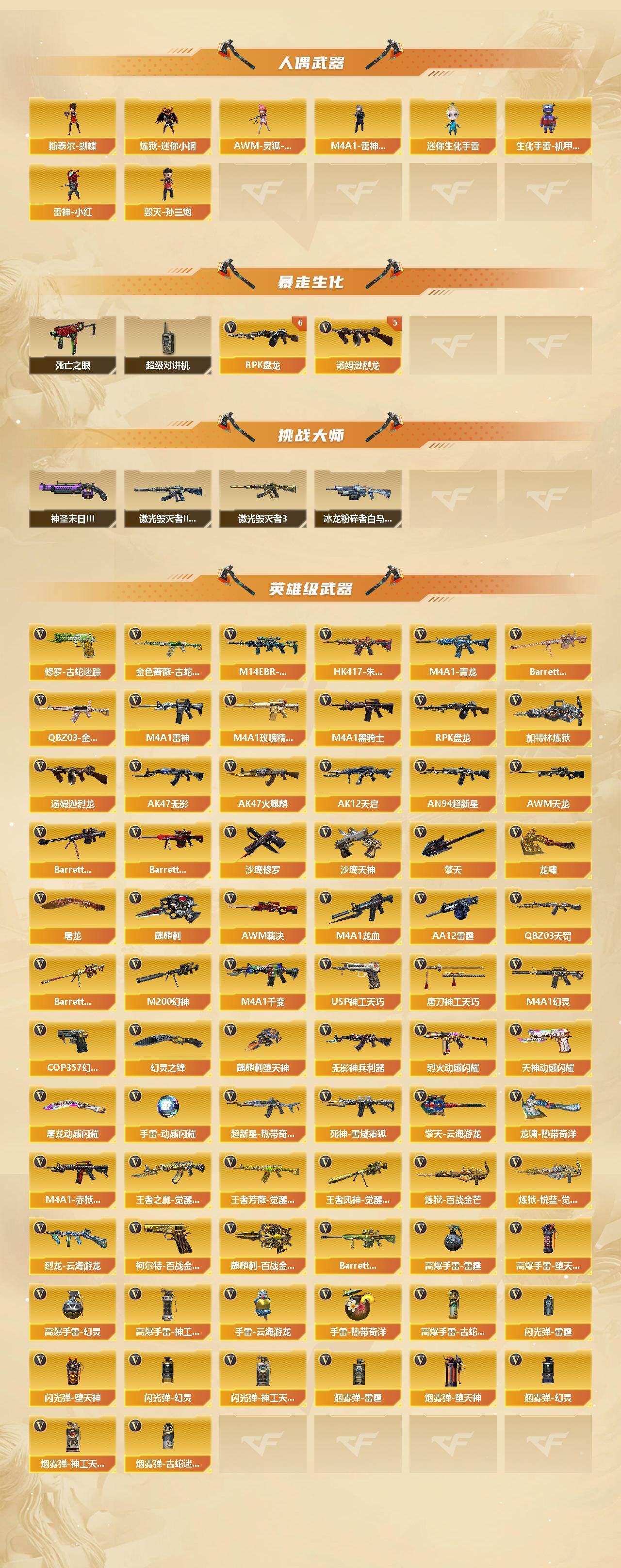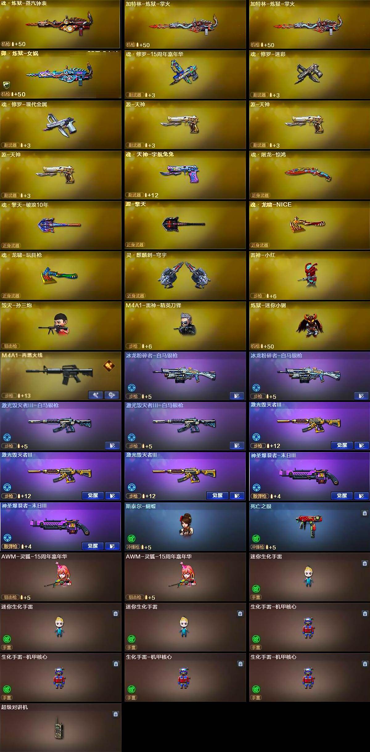 【英雄级武器】:M4A1-千变,AK47-火麒麟*2,M4A1-雷神*3,M4A1-黑骑士,AK47-无影,AK12-天启,AN94-超新星,M4A1-龙血,