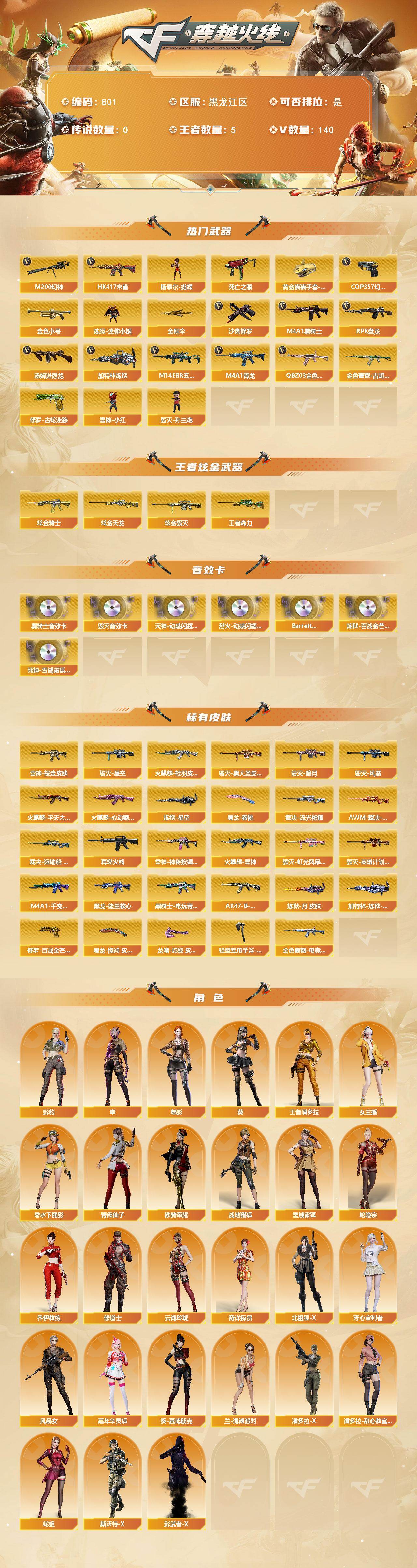[15523447]黑龙江区-140V-5王者-4炫金 【热门武器】:QBZ03-金色蔷薇,M14EBR-玄武,HK417-朱雀,M4A1-青龙,M200-幻神,金色蔷薇-古蛇迷踪,修罗-古蛇迷踪,死亡之眼,金色小号,炼狱-迷你小钢,M4A1-黑骑士,汤姆逊-烈龙*5,RPK-盘龙*6,加特林-炼狱,斯泰尔-蝴蝶,雷神-小红,毁灭-孙三炮,COP 357-幻灵*2,沙鹰-修罗*3,黄金猫猫手套-白鲨,金刚伞 【王者炫金武器】:王者森力,炫金骑士,炫金毁灭*2,炫金天龙 【音效卡】:天神-动感闪耀 音效卡,烈火-动感闪耀 音效卡,M4A1-黑骑士音效卡,Barrett-毁灭音效卡,Barrett-碧霄极光音效卡,炼狱-百战金芒-庆典舞曲音效卡,死神-雪域霜狐-怀旧音效卡 【皮肤】:金色蔷薇-电竞之星 皮肤,裁决-流光秘银,AWM-裁决-凤灵皮肤,裁决-运输船 皮肤,雷神-耀金皮肤,M4A1-再燃火线,雷神-神秘按键 皮肤,火麒麟-雷神,火麒麟-轻羽皮肤,火麒麟-平天大圣,火麒麟-心动糖果,毁灭-暗月,毁灭-星空,毁灭-黑大圣皮肤,毁灭-风暴,毁灭-虹光风暴 皮肤,毁灭-英雄计划 皮肤,M4A1-千变-孔明皮肤*2,黑龙-能量核心,黑骑士-电玩青兔皮肤,AK47-B-常胜将军-刘备,炼狱-星空,炼狱-月 皮肤,加特林-炼狱-钟馗皮肤,修罗-百战金芒 皮肤,屠龙-春桃 皮肤,屠龙-惊鸿 皮肤,龙啸-蛇姬 皮肤,轻型军用手斧-再燃火线 【角色】:葵,魅影,影豹,隼,战地猎狐,王者潘多拉,雪域霜狐,蛇隐宗,奇洋探员,乔伊教练,修道士,云海玲珑,北极狐-X,芳心审判者,风暴女,嘉年华灵狐,葵-赛博朋克,兰-海滩派对,零-水下丽影,女主播,潘多拉-X,潘多拉-甜心教官,青霞仙子,蛇姬,斯沃特-X,铁骑荣耀,影武者-X 【人偶武器】:雷神-小红,毁灭-孙三炮,M4A1-雷神-精英刀锋,炼狱-迷你小钢,斯泰尔-蝴蝶,AWM-灵狐-15周年嘉年华*2,迷你生化手雷*3,生化手雷-机甲核心*4 【暴走生化】:死亡之眼,超级对讲机 【挑战大师】:冰龙粉碎者-白马银枪*2,激光毁灭者III-白马银枪*2,激光毁灭者III*3,神圣爆裂者-末日III*2 【英雄级武器】:M4A1-千变,AK47-火麒麟*2,M4A1-雷神*3,M4A1-黑骑士,AK47-无影,AK12-天启,AN94-超新星,M4A1-龙血,