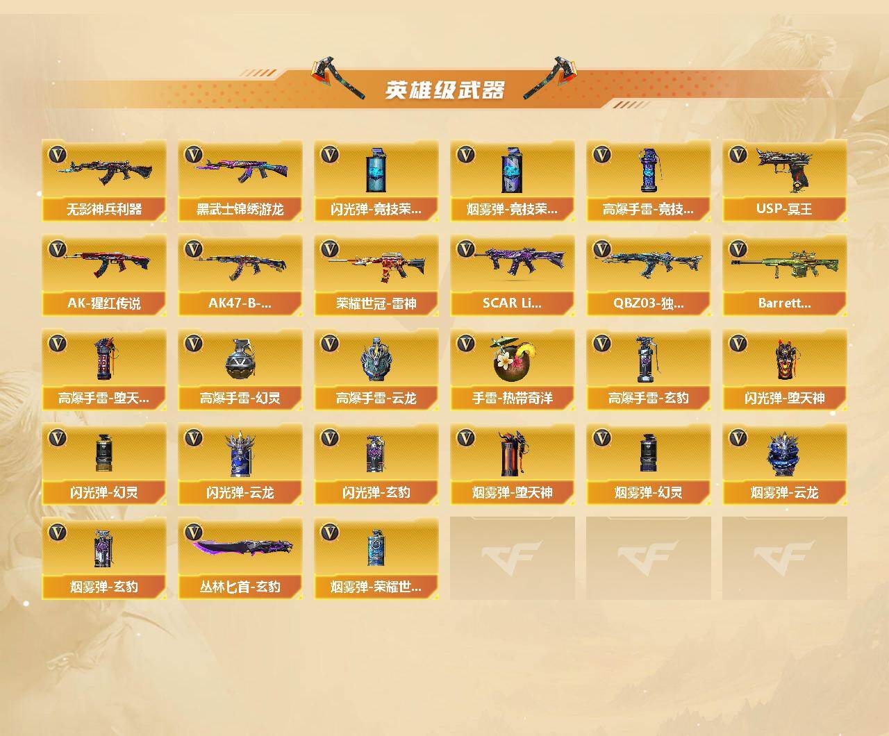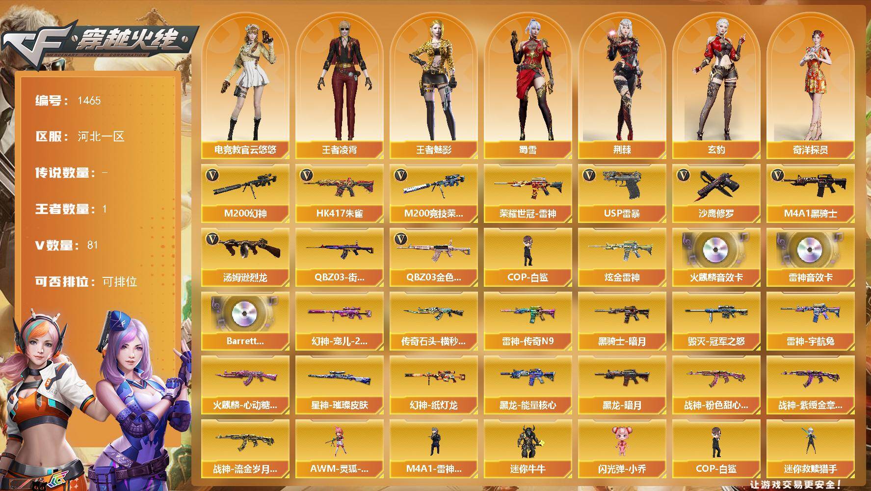 - [14998258]湖北一区-60V-7王者-1炫金 【热门武器】:QBZ03-金色蔷薇,Scar Light-白虎,M200-幻神,柯尔特-荣耀世冠白鲨2023*2,死亡之眼,白虎-电玩蓝兔,柯尔特-冠军之特*2,M4A1-黑骑士,COP 357-幻灵,沙鹰-修罗 【王者炫金武器】:USP-雷暴王者,炫金黑龙 【音效卡】:天神-动感闪耀 音效卡,烈火-动感闪耀 音效卡,M200-幻神音效卡,M4A1-黑骑士音效卡,Barrett-毁灭音效卡,AWM-裁决音效卡,70KG语音包,QBZ03-天罚音效卡 【皮肤】:M200-幻神-黄忠皮肤,幻神-AG-CFPLS17冠军,M200-幻神-荣耀世冠白鲨,幻神-荣耀世冠白鲨2023 皮肤,幻神-AG-CFPL S24冠军 皮肤,白虎-白鲨-CFPLS23冠军,QBZ03-冠军之薇,QBZ03-荣耀世冠白鲨,裁决-巅峰荣耀 皮肤,雷神-暗月,雷神-荣耀之魄,M4A1-战神赵云,雷神-R.LGD-CFPLS18冠军,雷神-宇航兔皮肤,火麒麟-雷神,火麒麟-百城,火麒麟-心动糖果,毁灭-荣耀之怒,毁灭-黑大圣皮肤,M4A1-千变-孔明皮肤,死神-机甲核心皮肤,战神-紫绶金章皮肤,AK47-B-常胜将军-刘备,AK47-B-常胜将军-孙权,天龙-秘银,天神-暗月,屠龙-荣耀之锋*2,龙啸-巅峰荣耀 皮肤,麒麟刺-甜蜜糖果 皮肤,麒麟刺-萌杀皮肤 【角色】:华,王者-零-国色天香,王者影豹,乔伊教练,云海玲珑,暗夜-X,芳心审判者,风暴女,虎妞,嘉年华灵狐,娟娟,龙儿,龙儿-小淘气,曼陀罗-礼服,萌儿,潘多拉-X,潘多拉-甜心教官,斯沃特-X,蜀雪,铁骑荣耀,兔囡囡,雪莉杨-摸金校尉,夜玫瑰-幻能朋克,职业选手 【人偶武器】:M4A1-雷神-精英刀锋,AWM-灵狐-15周年嘉年华,迷你波特博士,夺魂,生化手雷-机甲核心,深渊终结者手雷,迷你超能女侍,迷你巨石泰坦-魔花研究所,灵狐娃娃手雷 【暴走生化】:黑龙吞噬者,死亡之眼,超级对讲机 【挑战大师】:神圣爆裂者-末日III 【英雄级武器】:AK47-火麒麟,M4A1-雷神,M4A1-黑骑士,M4A1-死神,AN94-超新星,Scar Light-白虎,QBZ03-天罚,无影-神兵利器,FAMAS G2-天戎,M4A1-玫瑰精灵,QBZ03-金色蔷薇,烈火-动感闪耀,王者之心-觉醒版,王者之武-觉醒版,