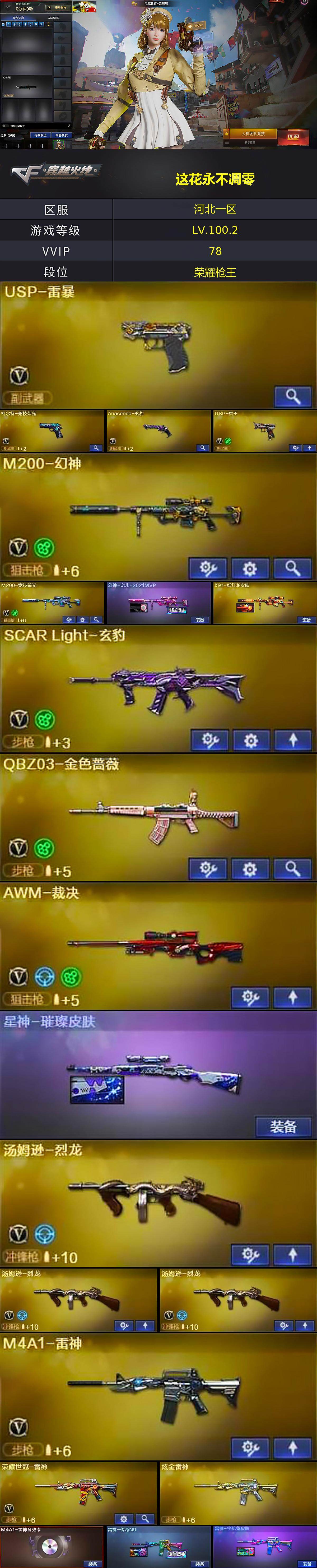 [15523546]河北一区-81V-1王者-1炫金 【热门武器】:QBZ03-金色蔷薇,HK417-朱雀,M200-幻神,M200-竞技荣光,荣耀世冠-雷神,QBZ03-街机,M4A1-黑骑士,汤姆逊-烈龙*3,COP-白鲨,USP-雷暴,沙鹰-修罗*2 【王者炫金武器】:炫金雷神 【音效卡】:AK47-火麒麟音效卡,M4A1-雷神音效卡,Barrett-碧霄极光音效卡 【皮肤】:幻神-宠儿-2021MVP,幻