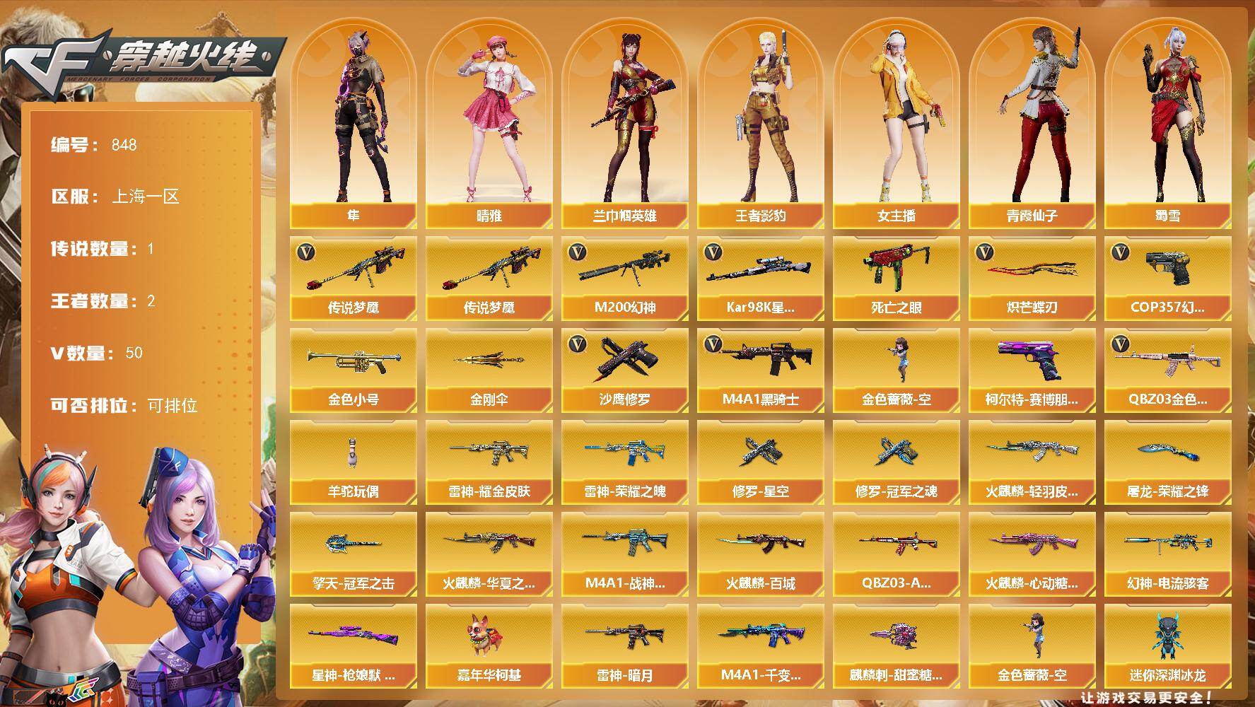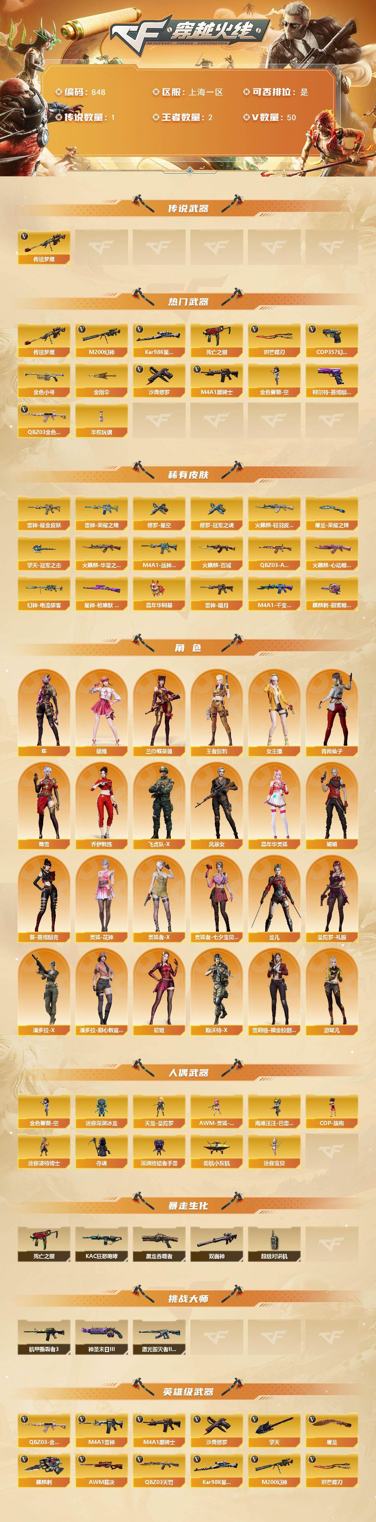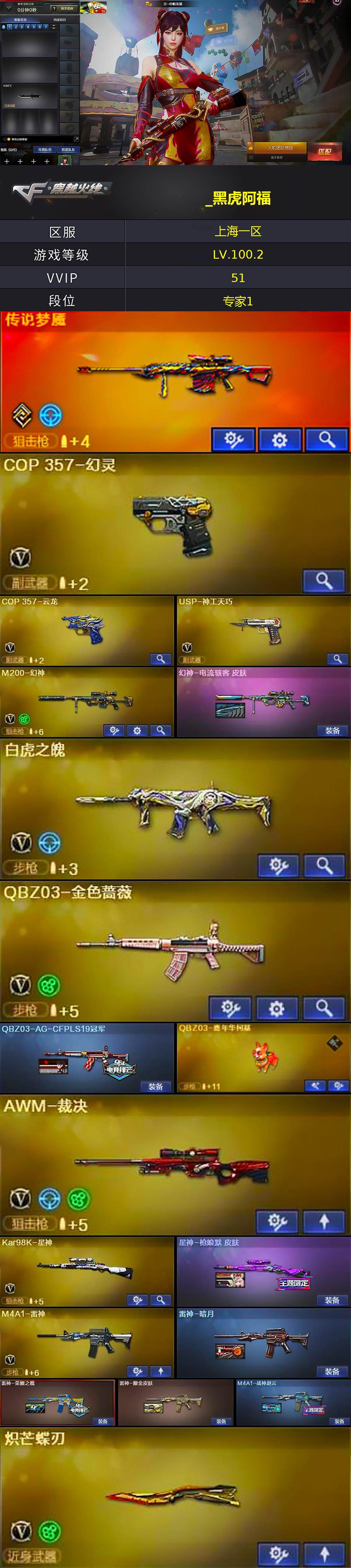 [15523695]上海一区-50V-2王者-0炫金 【传说武器】:传说梦魇 【热门武器】:传说梦魇,QBZ03-金色蔷薇,M200-幻神,死亡之眼,Kar98K-星神,金色小号,M4A1-黑骑士,金色蔷薇-空,羊驼玩偶,COP 357-幻灵,沙鹰-修罗*2,柯尔特-赛博朋克,炽芒蝶刃,金刚伞 【皮肤】:幻神-电流骇客 皮肤,QBZ03-AG-CFPLS19冠军,QBZ03-嘉年华柯基,星神-枪娘默 皮肤,雷神-暗月,雷神-荣耀之魄,雷神-耀金皮肤,M4A1-战神赵云,火麒麟-华夏之心,火麒麟-轻羽皮肤,火麒麟-百城,火麒麟-心动糖果,M4A1-千变-孔明皮肤,修罗-星空,修罗-冠军之魂,屠龙-荣耀之锋,擎天-冠军之击,麒麟刺-甜蜜糖果 皮肤 【角色】:兰-巾帼英雄,晴雅,隼,王者影豹,乔伊教练,飞虎队-X,风暴女,嘉年华灵狐,娟娟,葵-赛博朋克,灵狐-花神,灵狐者-X,灵狐者-七夕宝贝,龙儿,曼陀罗-礼服,女主播,潘多拉-X,潘多拉-甜心教官,青霞仙子,蛇姬,斯沃特-X,蜀雪,雪莉杨-摸金校尉,游珑儿 【人偶武器】:天龙-曼陀罗,金色蔷薇-空,迷你宝贝,街机小灰机,AWM-灵狐-15周年嘉年华,海滩汪汪-巴雷特,COP-旗袍,迷你深渊冰龙,迷你波特博士,夺魂,深渊终结者手雷 【暴走生化】:KAC-狂怒咆哮,黑龙吞噬者,双面神,死亡之眼,超级对讲机 【挑战大师】:激光毁灭者III-白马银枪,机甲撕裂者III,神圣爆裂者-末日III 【英雄级武器】:M4A1-雷神,M4A1-黑骑士,QBZ03-天罚,M4A1-神工天巧,无影-神兵利器,黑武士-锦绣游龙,QBZ03-金色蔷薇,白虎之魄-觉醒版,AWM-裁决,M200-幻神,Kar98K-星神,王者之怒-觉醒版,沙鹰-修罗*2,COP 357-幻灵,COP 357-云龙,USP-神工天巧,屠龙,擎天,麒麟刺,炽芒蝶刃,唐刀-神工天巧,高爆手雷-幻灵,高爆手雷-神工天巧*7,手雷-动感闪耀,闪光弹-幻灵,闪光弹-神工天巧*7,烟雾弹-幻灵,烟雾弹-神工天巧*7 【道具】:EDG炫彩背包,全能枪王背包,次元之矛-背包,炫彩背包,臻选金狐背包,超级背包,黄金巨石泰坦-魔花研究所背包,超核名片,绿色巨人,灵魂忍者,迷雾幽灵,夺命之镰,防化服*2,金色流光-枪王排位*2,星辰流光-枪王排位,枪王排位28赛季金色流光,枪王排位29赛季金色流光,斯沃特