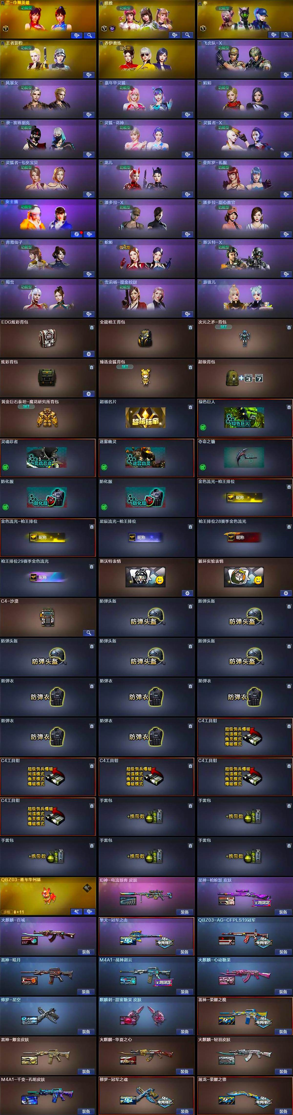 【道具】:EDG炫彩背包,全能枪王背包,次元之矛-背包,炫彩背包,臻选金狐背包,超级背包,黄金巨石泰坦-魔花研究所背包,超核名片,绿色巨人,灵魂忍者,迷雾幽灵,夺命之镰,防化服*2,金色流光-枪王排位*2,星辰流光-枪王排位,枪王排位28赛季金色流光,枪王排位29赛季金色流光,斯沃特