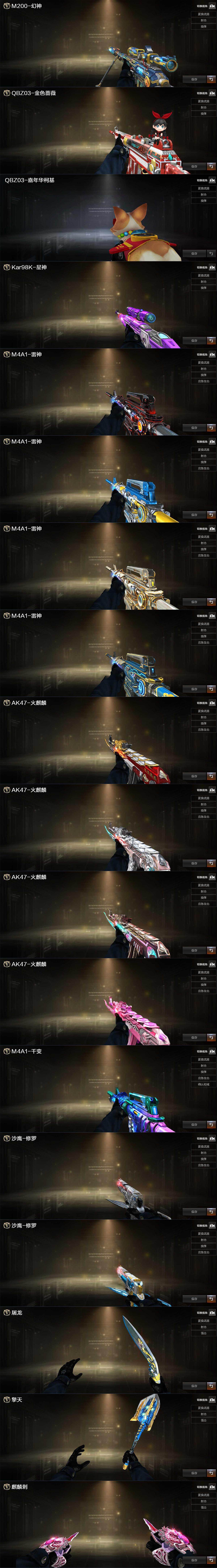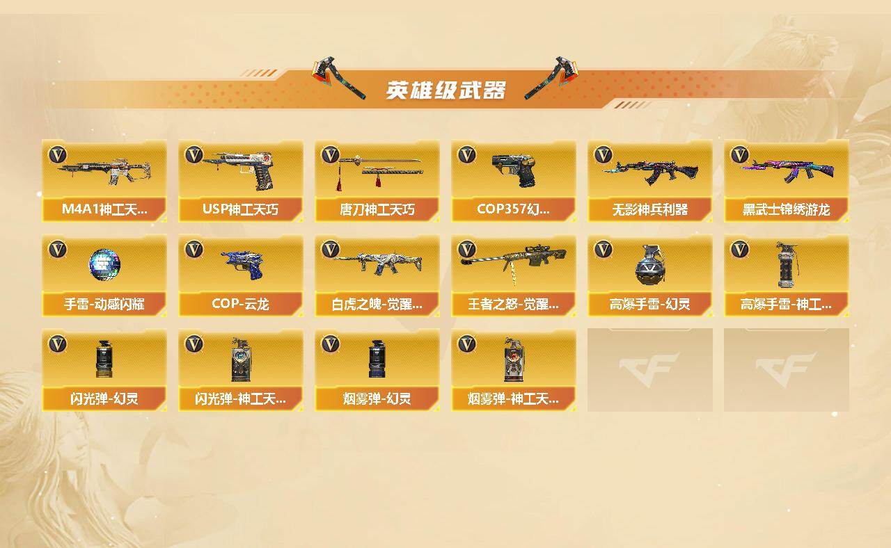 【英雄级武器】:M4A1-雷神,M4A1-黑骑士,QBZ03-天罚,M4A1-神工天巧,无影-神兵利器,黑武士-锦绣游龙,QBZ03-金色蔷薇,白虎之魄-觉醒版,AWM-裁决,M200-幻神,Kar98K-星神,王者之怒-觉醒版,沙鹰-修罗*2,COP 357-幻灵,COP 357-云龙,USP-神工天巧,屠龙,擎天,麒麟刺,炽芒蝶刃,唐刀-神工天巧,高爆手雷-幻灵,高爆手雷-神工天巧*7,手雷-动感闪耀,闪光弹-幻灵,闪光弹-神工天巧*7,烟雾弹-幻灵,烟雾弹-神工天巧*7