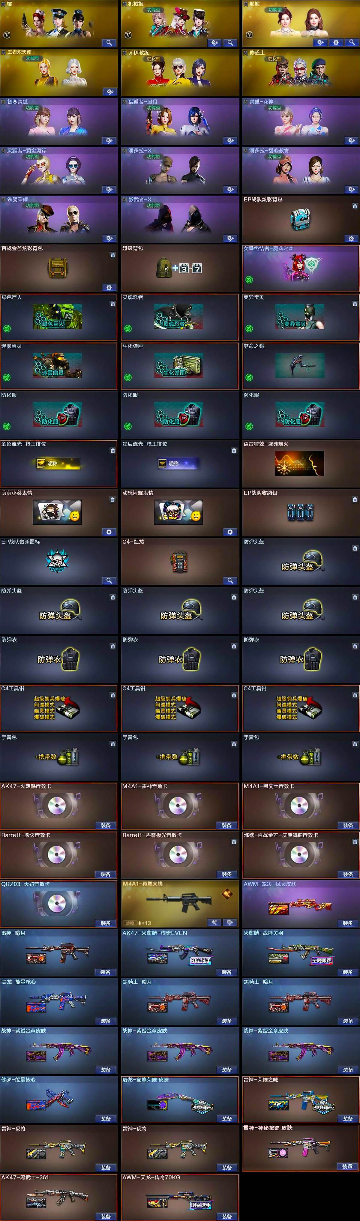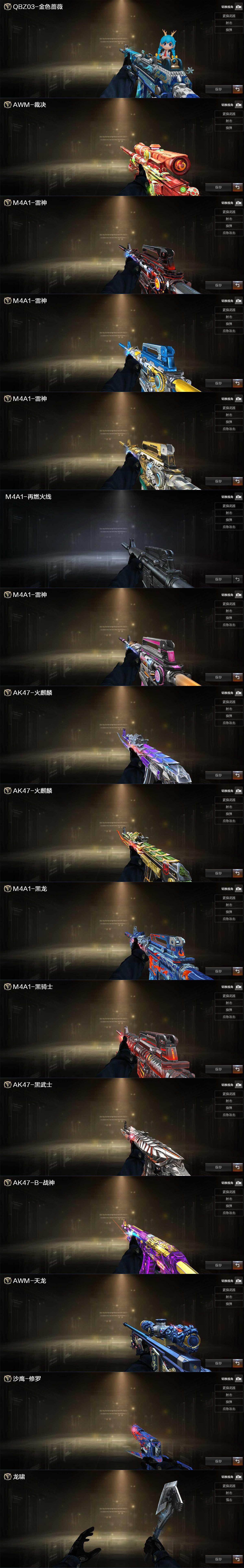 【英雄级武器】:AK47-火麒麟,M4A1-黑龙,M4A1-雷神*2,M4A1-黑骑士,AK47-黑武士,AK47-黑鲨,M4A1-龙血,QBZ03-天罚,QBZ03-独角-III,QBZ03-金色蔷薇,烈火-动感闪耀,王者之心-觉醒版,王者之戮-觉醒版,AK-47-猩红传说*3,白虎-电玩蓝兔,荣耀世冠-火麒麟,Barrett-毁灭,AWM-裁决,Kar98K-星神,VSK-94-金蚀,RPK-盘龙*4,加特林-炼狱,炼狱-百战金芒,炼狱-悦蓝-觉醒版,AA-12-雷霆,沙鹰-修罗,沙鹰-天神,柯尔特-荣耀世冠EP,天神-动感闪耀,屠龙,龙啸*4,麒麟刺-堕天神,马来剑-夜魔,擎天,麒麟刺,屠龙-动感闪耀,麒麟刺-百战金芒,丛林匕首-玄豹,高爆手雷-雷霆,高爆手雷-堕天神,高爆手雷-夜魔,手雷-动感闪耀,高爆手雷-玄豹,闪光弹-雷霆,闪光弹