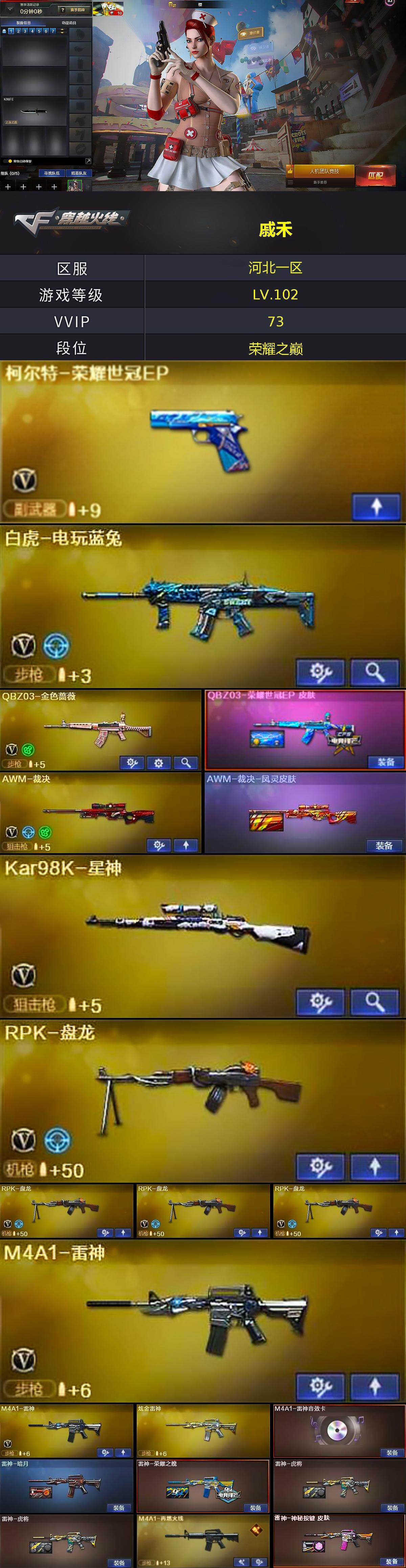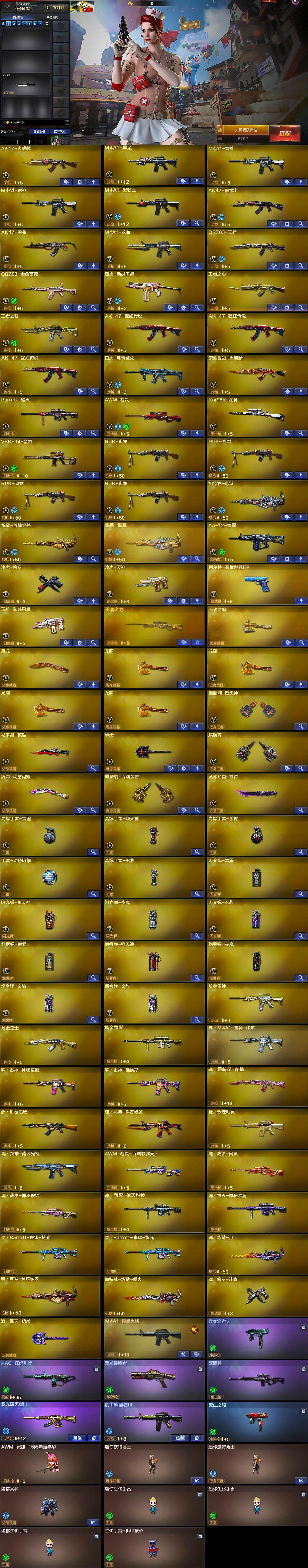 【热门武器】:QBZ03-金色蔷薇,死亡之眼,荣耀世冠-火麒麟,白虎-电玩蓝兔,Kar98K-星神,M4A1-黑骑士,RPK-盘龙*4,加特林-炼狱,沙鹰-修罗