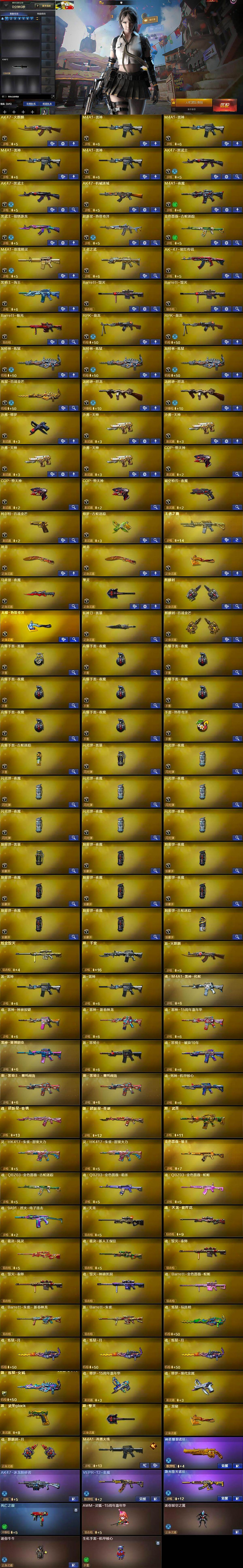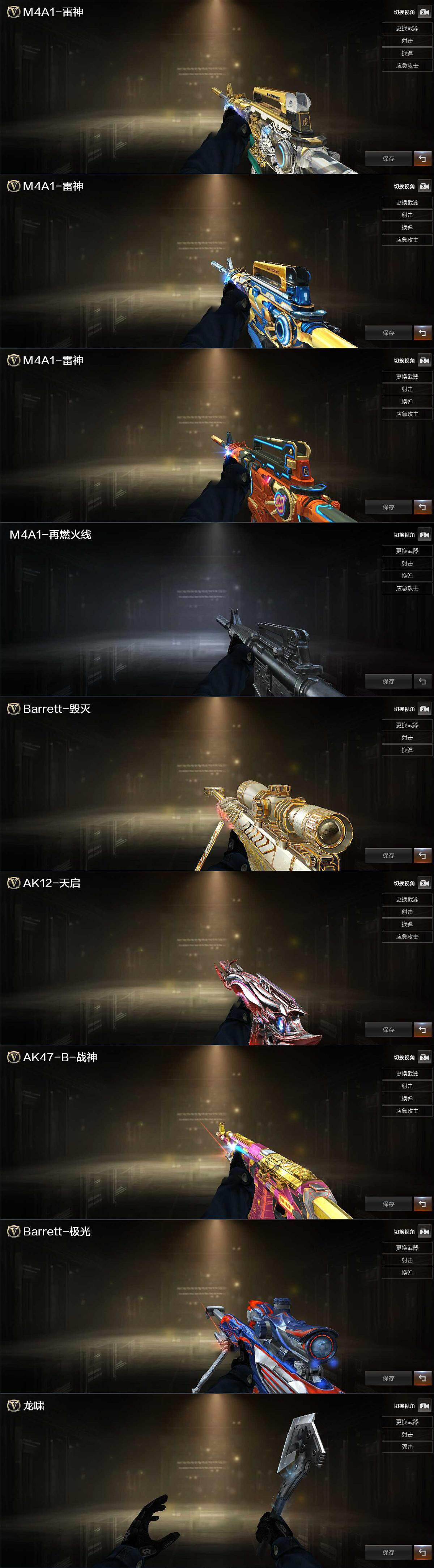 【英雄级武器】:AK47-火麒麟,M4A1-雷神*4,AK47-黑武士*2,AK47-机械迷城,M4A1-夜魔,黑武士-锦绣游龙,超新星-热带奇洋,金色蔷薇-古蛇迷踪,M4A1-玫瑰精灵,王者之武-觉醒版,AK-47-猩红传说,黑骑士-海王,Barrett-毁灭*2,Barrett-极光,RPK-盘龙*2,加特林-炼狱*3,炼狱-百战金芒,汤姆逊-烈龙*2,沙鹰-修罗,沙鹰-天神*4,COP-堕天神*3,破空枪刃-夜魔,柯尔特-百战金芒,修罗-古蛇迷踪,屠龙*2,龙啸,马来剑-夜魔,擎天,麒麟刺,龙啸-热带奇洋,斩神刀-雷暴,麒麟刺-百战金芒,高爆手雷-雷暴,高爆手雷-夜魔*7,手雷-热带奇洋,高爆手雷-古蛇迷踪,闪光弹-雷暴,闪光弹-夜魔*7,烟雾弹-雷暴,烟雾弹-夜魔*7,烟雾弹-古蛇迷踪