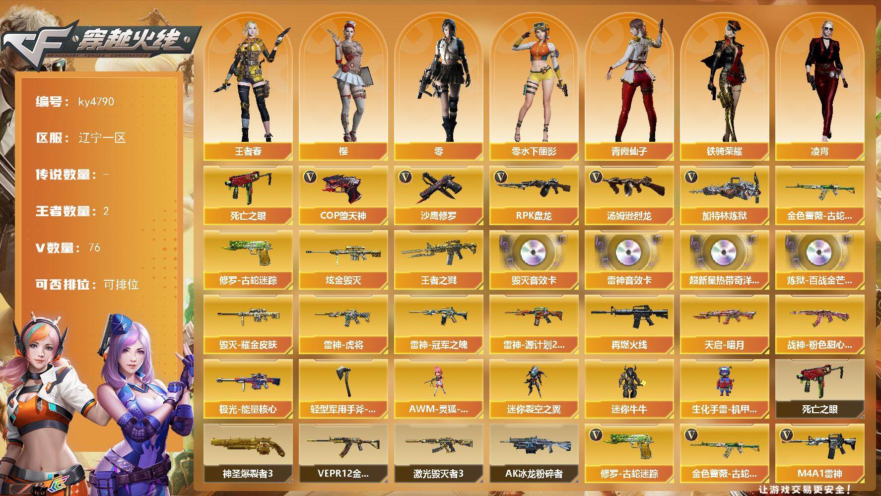 [15523611]辽宁一区-76V-2王者-1炫金 【热门武器】:金色蔷薇-古蛇迷踪,修罗-古蛇迷踪,死亡之眼,汤姆逊-烈龙*2,RPK-盘龙*2,加特林-炼狱*3,COP-堕天神*3,沙鹰-修罗 【王者炫金武器】:王者之戮,炫金毁灭 【音效卡】:AN94-超新星-热带奇洋音效卡,M4A1-雷神音效卡,Barrett-毁灭音效卡,炼狱-百战金芒-庆典舞曲音效卡 【皮肤】:雷神-虎将,雷神-冠军之魄,雷神-源计划2.0专属 皮肤,M4A1-再燃火线,毁灭耀金皮肤,天启-暗月,战神-粉色甜心皮肤,极光-能量核心*2,轻型军用手斧-再燃火线 【角色】:零,樱,凌霄,王者春,蛇隐宗,奇洋探员,暗夜-X,飞虎队-X,风暴女,虎妞,嘉年华灵狐,兰-梨园特工,零-水下丽影,潘多拉-X,青霞仙子,蛇姬,铁骑荣耀,维纳斯,夜玫瑰-宠粉,影武者-X 【人偶武器】:AWM-灵狐-15周年嘉年华,迷你裂空之翼,迷你牛牛,生化手雷-机甲核心 【暴走生化】:死亡之眼 【挑战大师】:神圣爆裂者III,AK47-冰龙粉碎者,VEPR-12-金魔,激光毁灭者III 【英雄级武器】:AK47-火麒麟,M4A1-雷神*4,AK47-黑武士*2,AK47-机械迷城,M4A1-夜魔,黑武士-锦绣游龙,超新星-热带奇洋,金色蔷薇-古蛇迷踪,M4A1-玫瑰精灵,王者之武-觉醒版,AK-47-猩红传说,黑骑士-海王,Barrett-毁灭*2,Barrett-极光,RPK-盘龙*2,加特林-炼狱*3,炼狱-百战金芒,汤姆逊-烈龙*2,沙鹰-修罗,沙鹰-天神*4,COP-堕天神*3,破空枪刃-夜魔,柯尔特-百战金芒,修罗-古蛇迷踪,屠龙*2,龙啸,马来剑-夜魔,擎天,麒麟刺,龙啸-热带奇洋,斩神刀-雷暴,麒麟刺-百战金芒,高爆手雷-雷暴,高爆手雷-夜魔*7,手雷-热带奇洋,高爆手雷-古蛇迷踪,闪光弹-雷暴,闪光弹-夜魔*7,烟雾弹-雷暴,烟雾弹-夜魔*7,烟雾弹-古蛇迷踪 【道具】:CFS限定背包,WE炫彩背包,XROCK炫彩背包,古蛇迷踪炫彩背包,奇洋探员-海龟背包,战舰背包,炫彩背包,热带奇洋炫彩背包,百战金芒炫彩背包,背包-洛丽塔,背包-葫芦兄弟,超级背包,女皇终结者-魔龙之吻,妩媚妖姬,绿色巨人,灵魂忍者,妖姬,迷雾幽灵,生化弹匣,夺命之镰,防化服*2,金色流光-枪王排位,星辰流光-枪王排位,巅峰赛先锋-金色流光,枪王排位2