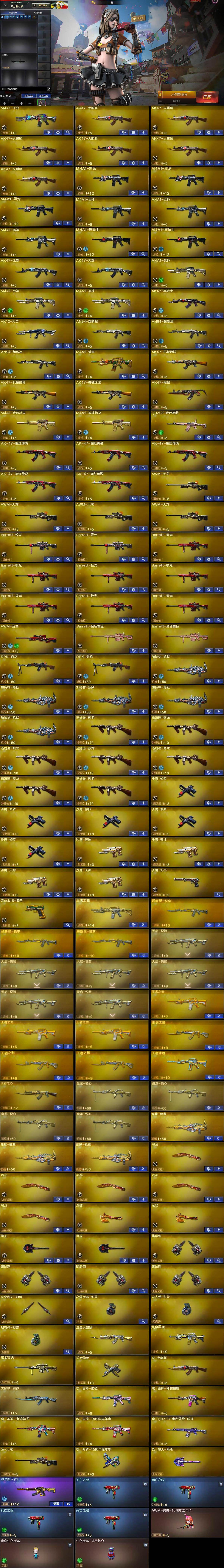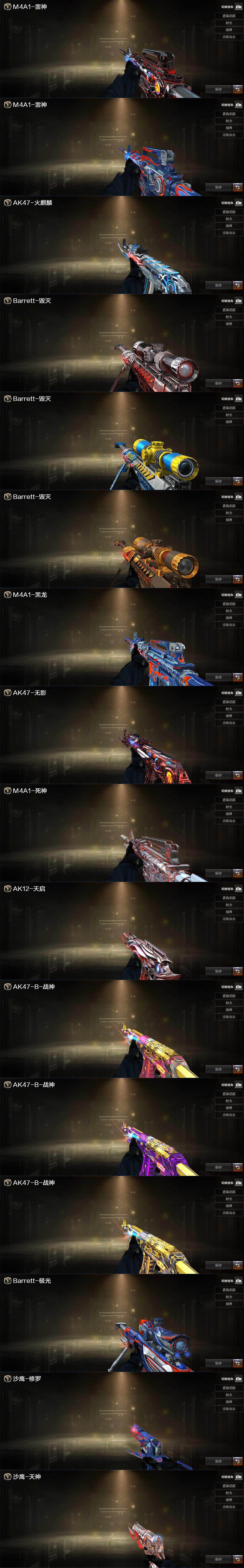 【英雄级武器】:M4A1-千变,AK47-火麒麟*6,M4A1-黑龙*3,M4A1-雷神*3,M4A1-黑骑士*2,AK47-无影*2,M4A1-死神*3,AK47-黑武士,AK12-天启,AN94-超新星*3,M4A1-武圣,AK47-机械迷城*3,AK47-黑鲨,M4A1-玫瑰精灵*2,QBZ03-金色蔷薇,AK-47-猩红传说*5,AWM-天龙*4,Barrett-毁灭*2,Barrett-极光*7,AWM-裁决,Barrett-金色蔷薇*2,RPK-盘龙*2,加特林-炼狱*5,汤姆逊-烈龙*7,沙鹰-修罗*5,沙鹰-天神*4,沙鹰-幻兽,Glock18-武圣,屠龙*5,龙啸*2,擎天*2,麒麟刺*4,女皇利刃-幻兽,高爆手雷-幻兽,闪光弹-幻兽,烟雾弹-幻兽