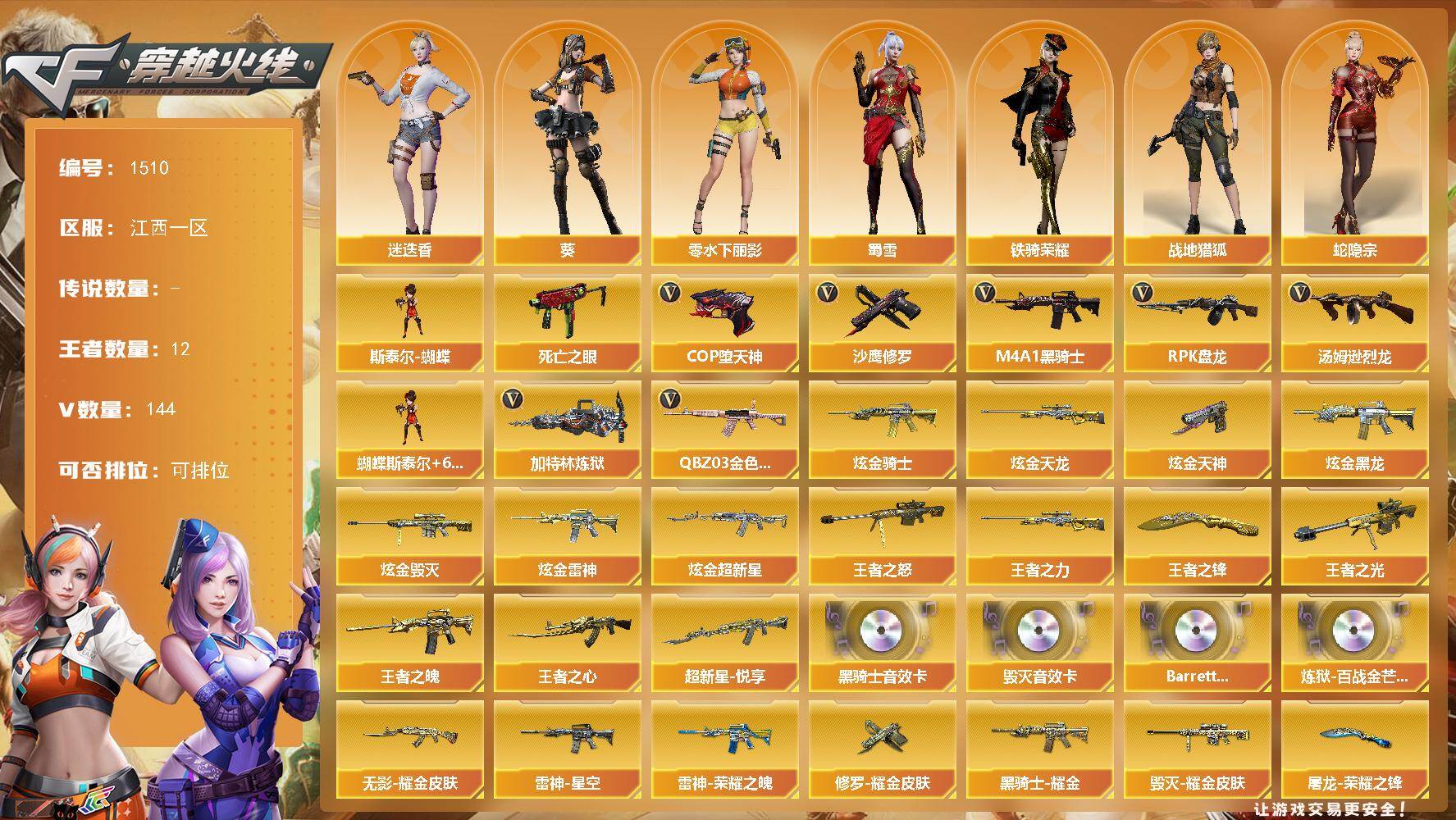 [15524423]江西一区-144V-12王者-11炫金 【热门武器】:QBZ03-金色蔷薇*4,死亡之眼,M4A1-黑骑士*4,汤姆逊-烈龙*6,RPK-盘龙*5,加特林-炼狱*2,斯泰尔-蝴蝶,COP-堕天神*2,沙鹰-修罗*3 【王者炫金武器】:超新星-悦享,王者之魄*2,王者之心,王者之光,王者之怒*2,王者之力,王者之锋,炫金骑士,炫金黑龙*4,炫金雷神,炫金超新星,炫金毁灭*2,炫金天龙,炫金天神 【音效卡】:M4A1-黑骑士音效卡,Barrett-毁灭音效卡,Barrett-碧霄极光音效卡*3,炼狱-百战金芒-庆典舞曲音效卡 【皮肤】:雷神-暗月,雷神-荣耀之魄,雷神-星空,M4A1-雷神-CFS 2019,M4A1-再燃火线,火麒麟-雷神*2,毁灭-暗月,毁灭耀金皮肤*2,毁灭-英雄计划 皮肤,M4A1-千变-孔明皮肤,黑龙-能量核心,黑骑士耀金皮肤,无影-能量核心,无影耀金皮肤,天启-暗月,战神-粉色甜心皮肤*9,战神-紫绶金章皮肤*13,战神-流金岁月皮肤*11,AWM-天龙-传奇70KG*2,AWM-天龙-传奇白鲨,极光-能量核心,炼狱-星空,修罗-能量核心,修罗耀金皮肤,天神-暗月*2,屠龙-荣耀之锋*2,轻型军用手斧-再燃火线 【角色】:葵,迷迭香,战地猎狐,蛇隐宗,奇洋探员,乔伊教练,修道士,云海玲珑,暗夜-X,初恋灵狐,电竞少女,芳心审判者,飞虎队-X,风暴女,嘉年华灵狐,兰-新年限定,兰妹妹,0号玩家,零-水下丽影,灵狐者-黄金海岸,龙儿,麻雀,娜塔莉娅,潘多拉-X,潘多拉-甜心教官,蛇姬,斯沃特-X,蜀雪,铁骑荣耀,新娜塔莎,雪莉杨-摸金校尉,樱-战斗天使,影武者-X,游珑儿,海豹突击队 【人偶武器】:M4A1-雷神-精英刀锋,迷你钢铁终结者,迷你救赎猎手,斯泰尔-蝴蝶,巴雷特-零-水下丽影*2,加特林-机械猎手,AWM-灵狐-15周年嘉年华,迷你深渊冰龙,迷你裂空之翼,迷你牛魔王,迷你波特博士,夺魂,迷你生化手雷*2,生化手雷-机甲核心*4,深渊终结者手雷,闪光弹-小乔,巴雷特-赏金猎人,迷你超能女侍,迷你巨石泰坦-魔花研究所,灵狐娃娃手雷 【暴走生化】:双面神,死亡之眼,超级对讲机 【挑战大师】:冰龙粉碎者-白马银枪,激光毁灭者III-白马银枪,机甲撕裂者III,KAC-圣炎切割者III,神圣爆裂者-末日III 【英雄级武器】:M4A1-千变,
