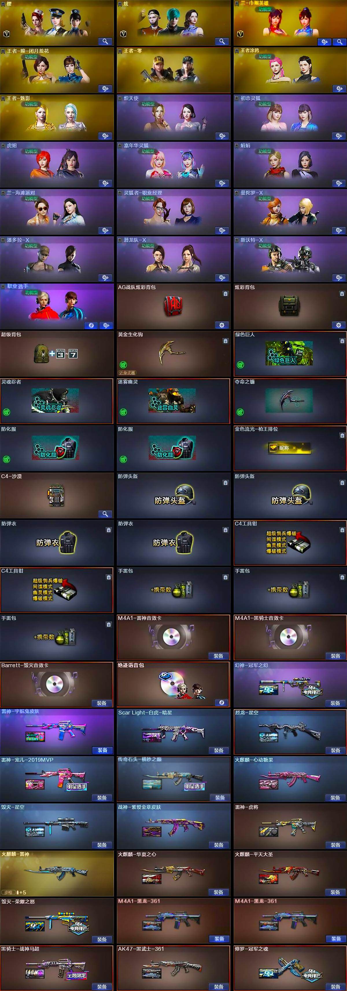 【皮肤】:幻神-冠军之幻,Scar Light-白虎-暗星,烈龙-星空,雷神-虎将,雷神-宠儿-2019MVP,雷神-宇航兔皮肤,火麒麟-雷神,火麒麟-华夏之心,传奇石头-横秒之巅,火麒麟-平天大圣,火麒麟-心动糖果,毁灭-荣耀之怒,毁灭-星空,M4A1-黑龙-361*2,黑骑士-战神马超,AK47-黑武士-361,战神-紫绶金章皮肤,AK47-B-常胜将军-曹操*2,AK47-B-常胜将军-刘备,修罗-冠军之魂