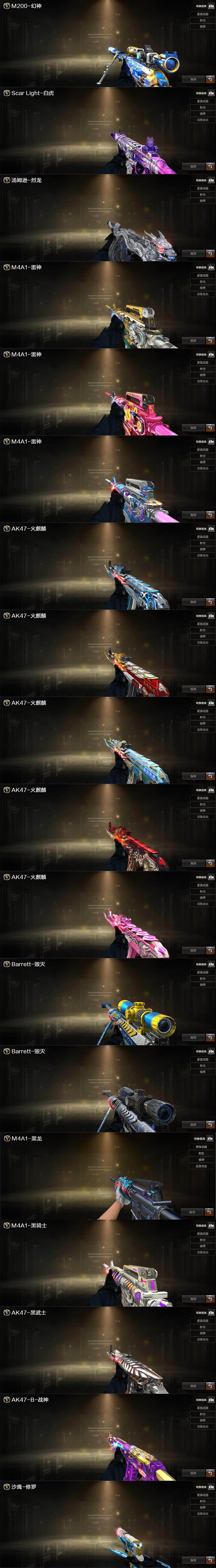 【热门武器】:QBZ03-金色蔷薇,Scar Light-白虎*2,HK417-朱雀,M200-幻神,荣耀世冠-火麒麟,荣耀世冠-雷神*2,荣耀世冠-柯尔特*2,M4A1-黑骑士,汤姆逊-烈龙,加特林-炼狱,USP-雷暴,COP 357-幻灵,沙鹰-修罗*2,荣耀世冠-龙啸*2