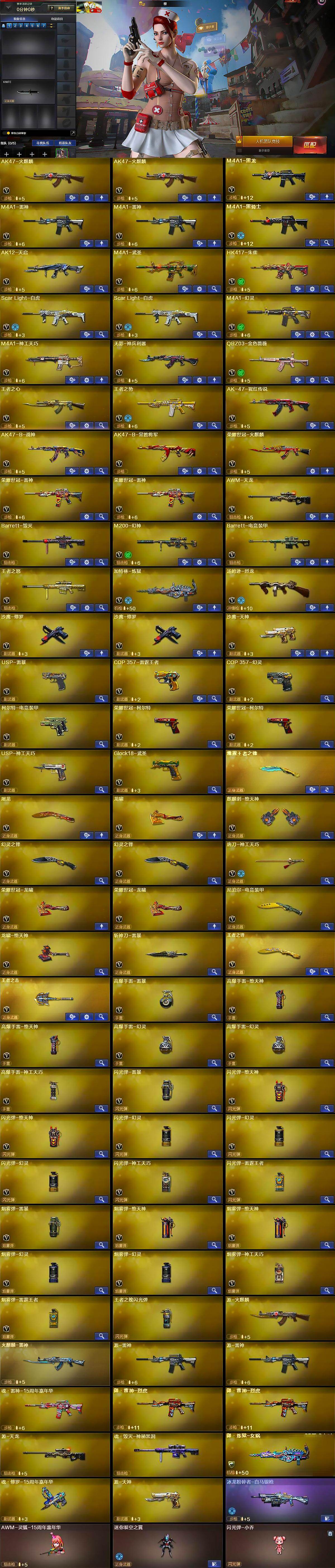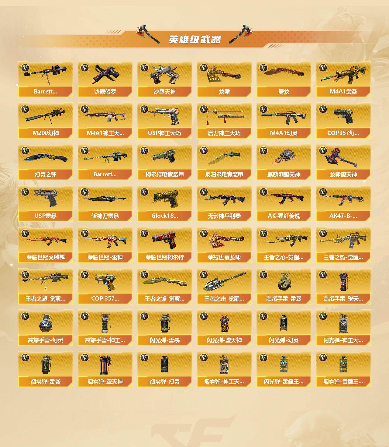 【英雄级武器】:AK47-火麒麟*2,M4A1-黑龙,M4A1-雷神*2,M4A1-黑骑士,AK12-天启,M4A1-武圣,HK417-朱雀,Scar Light-白虎*2,M4A1-幻灵,M4A1-神工天巧,无影-神兵利器,QBZ03-金色蔷薇,王者之心-觉醒版,王者之势-觉醒版,AK-47-猩红传说,AK47-B-战神,AK47-B-常胜将军,荣耀世冠-火麒麟,荣耀世冠-雷神*2,AWM-天龙,Barrett-毁灭,M200-幻神,Barrett-电竞装甲,王者之怒-觉醒版,加特林-炼狱,汤姆逊-烈龙,沙鹰-修罗*2,沙鹰-天神,USP-雷暴,COP 357-雷霆王者-觉醒版,COP 357-幻灵,柯尔特-电竞装甲,荣耀世冠-柯尔特*2,USP-神工天巧,Glock18-武圣,屠龙,龙啸,麒麟刺-堕天神,幻灵之锋*2,唐刀-神工天巧,荣耀世冠-龙啸*2,尼泊尔-电竞