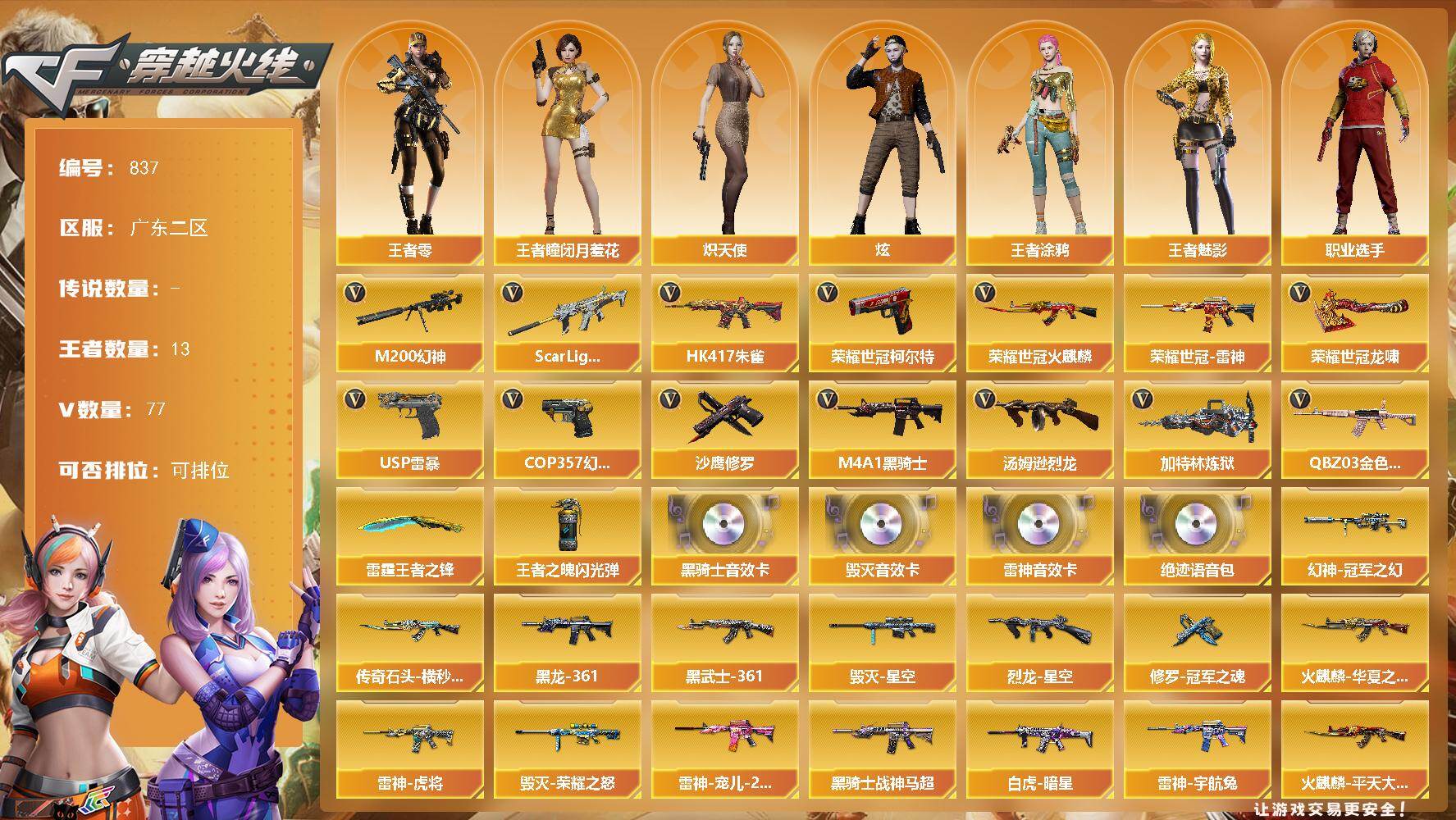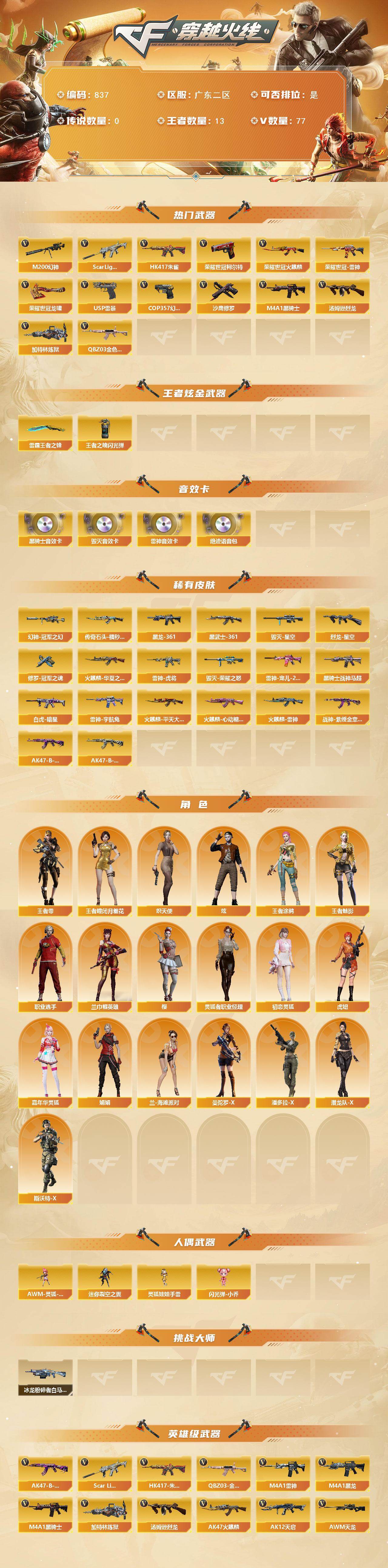 [15524716]广东二区-77V-13王者-0炫金 【热门武器】:QBZ03-金色蔷薇,Scar Light-白虎*2,HK417-朱雀,M200-幻神,荣耀世冠-火麒麟,荣耀世冠-雷神*2,荣耀世冠-柯尔特*2,M4A1-黑骑士,汤姆逊-烈龙,加特林-炼狱,USP-雷暴,COP 357-幻灵,沙鹰-修罗*2,荣耀世冠-龙啸*2 【王者炫金武器】:雷霆王者之锋,王者之魄闪光弹 【音效卡】:M4A1-雷神音效卡,M4A1-黑骑士音效卡,Barrett-毁灭音效卡,绝迹语音包 【皮肤】:幻神-冠军之幻,Scar Light-白虎-暗星,烈龙-星空,雷神-虎将,雷神-宠儿-2019MVP,雷神-宇航兔皮肤,火麒麟-雷神,火麒麟-华夏之心,传奇石头-横秒之巅,火麒麟-平天大圣,火麒麟-心动糖果,毁灭-荣耀之怒,毁灭-星空,M4A1-黑龙-361*2,黑骑士-战神马超,AK47-黑武士-361,战神-紫绶金章皮肤,AK47-B-常胜将军-曹操*2,AK47-B-常胜将军-刘备,修罗-冠军之魂 【角色】:樱,炫,兰-巾帼英雄,王者-瞳-闭月羞花,王者-零,王者涂鸦,王者-魅影,炽天使,初恋灵狐,虎妞,嘉年华灵狐,娟娟,兰-海滩派对,灵狐者-职业经理,曼陀罗-X,潘多拉-X,潜龙队-X,斯沃特-X,职业选手 【人偶武器】:AWM-灵狐-15周年嘉年华,迷你裂空之翼,闪光弹-小乔,灵狐娃娃手雷 【挑战大师】:冰龙粉碎者-白马银枪 【英雄级武器】:AK47-火麒麟*2,M4A1-黑龙,M4A1-雷神*2,M4A1-黑骑士,AK12-天启,M4A1-武圣,HK417-朱雀,Scar Light-白虎*2,M4A1-幻灵,M4A1-神工天巧,无影-神兵利器,QBZ03-金色蔷薇,王者之心-觉醒版,王者之势-觉醒版,AK-47-猩红传说,AK47-B-战神,AK47-B-常胜将军,荣耀世冠-火麒麟,荣耀世冠-雷神*2,AWM-天龙,Barrett-毁灭,M200-幻神,Barrett-电竞装甲,王者之怒-觉醒版,加特林-炼狱,汤姆逊-烈龙,沙鹰-修罗*2,沙鹰-天神,USP-雷暴,COP 357-雷霆王者-觉醒版,COP 357-幻灵,柯尔特-电竞装甲,荣耀世冠-柯尔特*2,USP-神工天巧,Glock18-武圣,屠龙,龙啸,麒麟刺-堕天神,幻灵之锋*2,唐刀-神工天巧,荣耀世冠-龙啸*2,尼泊尔-电竞