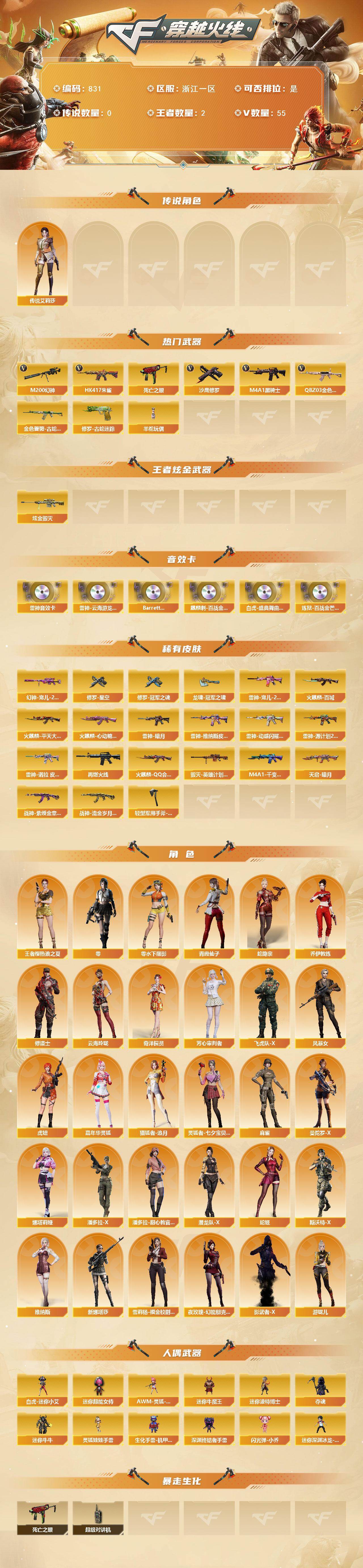 [15525221]浙江一区-55V-2王者-1炫金 【传说角色】:传说艾莉莎 【热门武器】:QBZ03-金色蔷薇,HK417-朱雀,M200-幻神,金色蔷薇-古蛇迷踪,修罗-古蛇迷踪,死亡之眼,M4A1-黑骑士,羊驼玩偶,沙鹰-修罗*5 【王者炫金武器】:炫金毁灭 【音效卡】:M4A1-雷神音效卡,M4A1-雷神-云海游龙音效卡,Barrett-碧霄极光音效卡,麒麟刺-百战金芒-盛典舞曲音效卡,白虎-盛典舞曲音效卡,炼狱-百战金芒-庆典舞曲音效卡 【皮肤】:幻神-宠儿-2021MVP,雷神-暗月,雷神-宠儿-2019MVP,雷神-维纳斯皮肤,雷神-动感闪耀 皮肤,雷神-源计划2.0专属 皮肤,雷神-诺拉 皮肤,M4A1-再燃火线,火麒麟-平天大圣*2,火麒麟-QQ会员,火麒麟-百城,火麒麟-心动糖果,毁灭-英雄计划 皮肤,M4A1-千变-孔明皮肤,天启-暗月,战神-紫绶金章皮肤*2,战神-流金岁月皮肤*3,修罗-星空,修罗-冠军之魂,龙啸-冠军之啸,轻型军用手斧-再燃火线 【角色】:零,王者樱-热浪之夏,蛇隐宗,奇洋探员,乔伊教练,修道士,云海玲珑,芳心审判者,飞虎队-X,风暴女,虎妞,嘉年华灵狐,猎狐者-追月,零-水下丽影,灵狐者-七夕宝贝,麻雀,曼陀罗-X,娜塔莉娅,潘多拉-X,潘多拉-甜心教官,潜龙队-X,青霞仙子,蛇姬,斯沃特-X,维纳斯,新娜塔莎,雪莉杨-摸金校尉,夜玫瑰-幻能朋克,影武者-X,游珑儿 【人偶武器】:白虎-迷你小艾,AWM-灵狐-15周年嘉年华*3,迷你牛魔王,迷你波特博士,夺魂,迷你牛牛,生化手雷-机甲核心,深渊终结者手雷,闪光弹-小乔,迷你深渊冰龙-王绿豆,迷你超能女侍,灵狐娃娃手雷 【暴走生化】:死亡之眼,超级对讲机 【挑战大师】:激光毁灭者III-白马银枪*3,激光毁灭者III 【英雄级武器】:AK47-火麒麟,M4A1-雷神*2,M4A1-黑骑士,AK47-无影,AK47-黑武士,HK417-朱雀,无影-神兵利器,黑武士-锦绣游龙,超新星-热带奇洋,金色蔷薇-古蛇迷踪,九霄圣角,M4A1-玫瑰精灵,QBZ03-金色蔷薇,烈火-动感闪耀,AK-47-猩红传说*3,AK47-B-战神,黑骑士-海王*2,Barrett-毁灭,AWM-裁决,M200-幻神,王者之怒-觉醒版,炼狱-百战金芒,烈龙-云海游龙,AA-12-雷霆*2,沙鹰-修罗*5,天神-动感