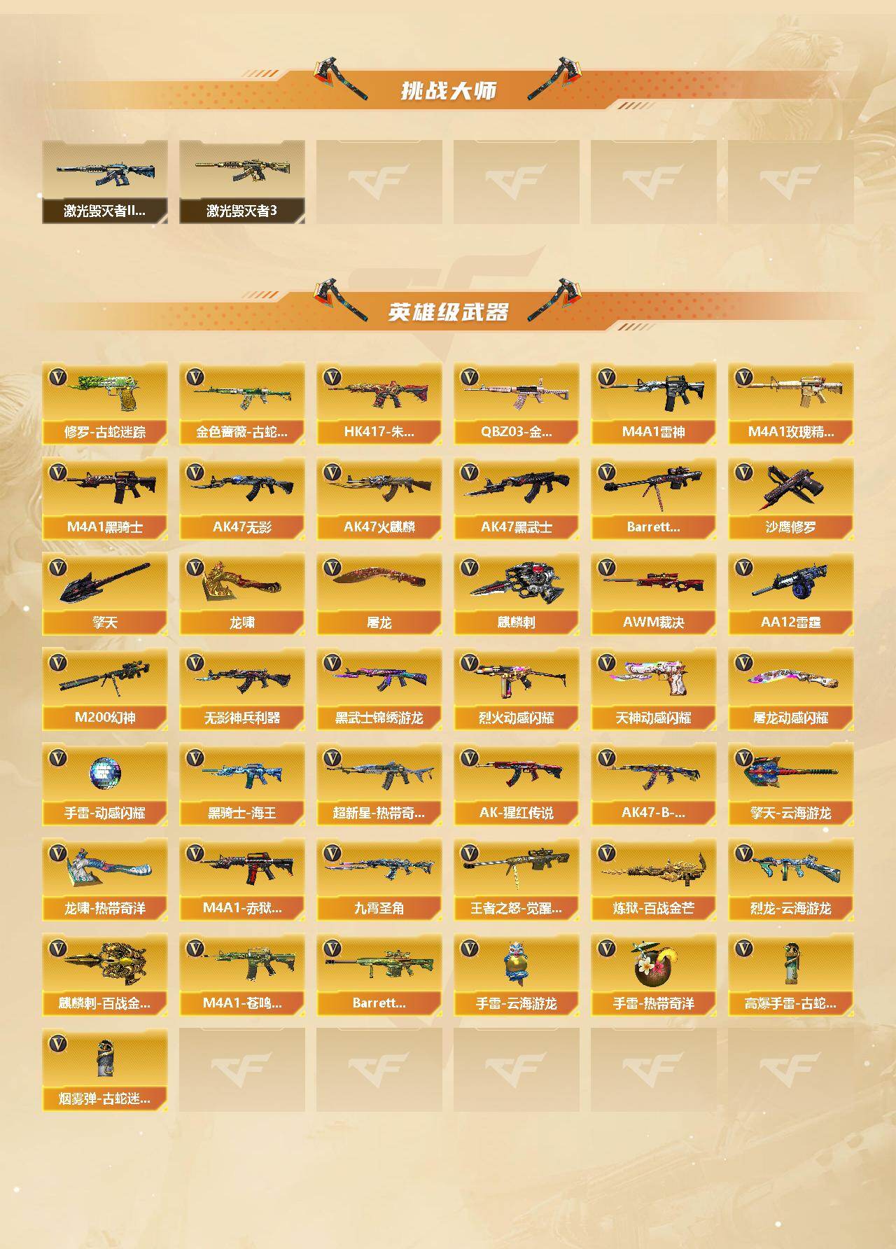 【英雄级武器】:AK47-火麒麟,M4A1-雷神*2,M4A1-黑骑士,AK47-无影,AK47-黑武士,HK417-朱雀,无影-神兵利器,黑武士-锦绣游龙,超新星-热带奇洋,金色蔷薇-古蛇迷踪,九霄圣角,M4A1-玫瑰精灵,QBZ03-金色蔷薇,烈火-动感闪耀,AK-47-猩红传说*3,AK47-B-战神,黑骑士-海王*2,Barrett-毁灭,AWM-裁决,M200-幻神,王者之怒-觉醒版,炼狱-百战金芒,烈龙-云海游龙,AA-12-雷霆*2,沙鹰-修罗*5,天神-动感