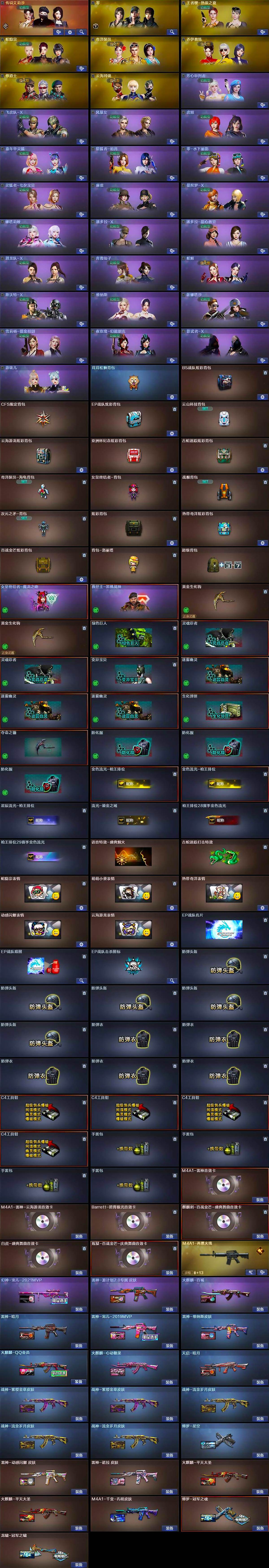 【皮肤】:幻神-宠儿-2021MVP,雷神-暗月,雷神-宠儿-2019MVP,雷神-维纳斯皮肤,雷神-动感闪耀 皮肤,雷神-源计划2.0专属 皮肤,雷神-诺拉 皮肤,M4A1-再燃火线,火麒麟-平天大圣*2,火麒麟-QQ会员,火麒麟-百城,火麒麟-心动糖果,毁灭-英雄计划 皮肤,M4A1-千变-孔明皮肤,天启-暗月,战神-紫绶金章皮肤*2,战神-流金岁月皮肤*3,修罗-星空,修罗-冠军之魂,龙啸-冠军之啸,轻型军用手斧-再燃火线