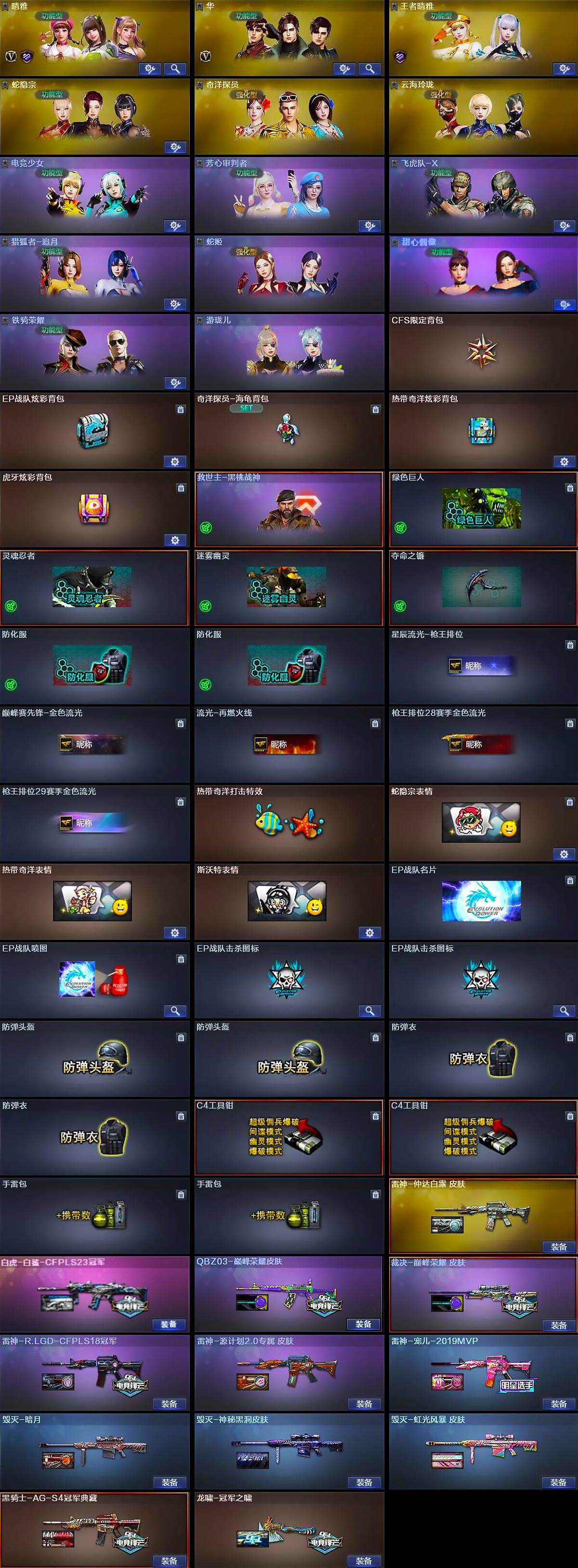 【道具】:CFS限定背包,EP战队炫彩背包,奇洋探员-海龟背包,热带奇洋炫彩背包,虎牙炫彩背包,救世主-黑桃战神,绿色巨人,灵魂忍者,迷雾幽灵,夺命之镰,防化服*2,星辰流光-枪王排位,巅峰赛先锋-金色流光,流光-再燃火线,枪王排位28赛季金色流光,枪王排位29赛季金色流光,热带奇洋打击特效,蛇隐宗表情,热带奇洋表情,斯沃特表情,EP战队名片,EP战队喷图,EP战队击杀图标*2,防弹头盔*2,防弹衣*2,C4工具钳*2,手雷包*2