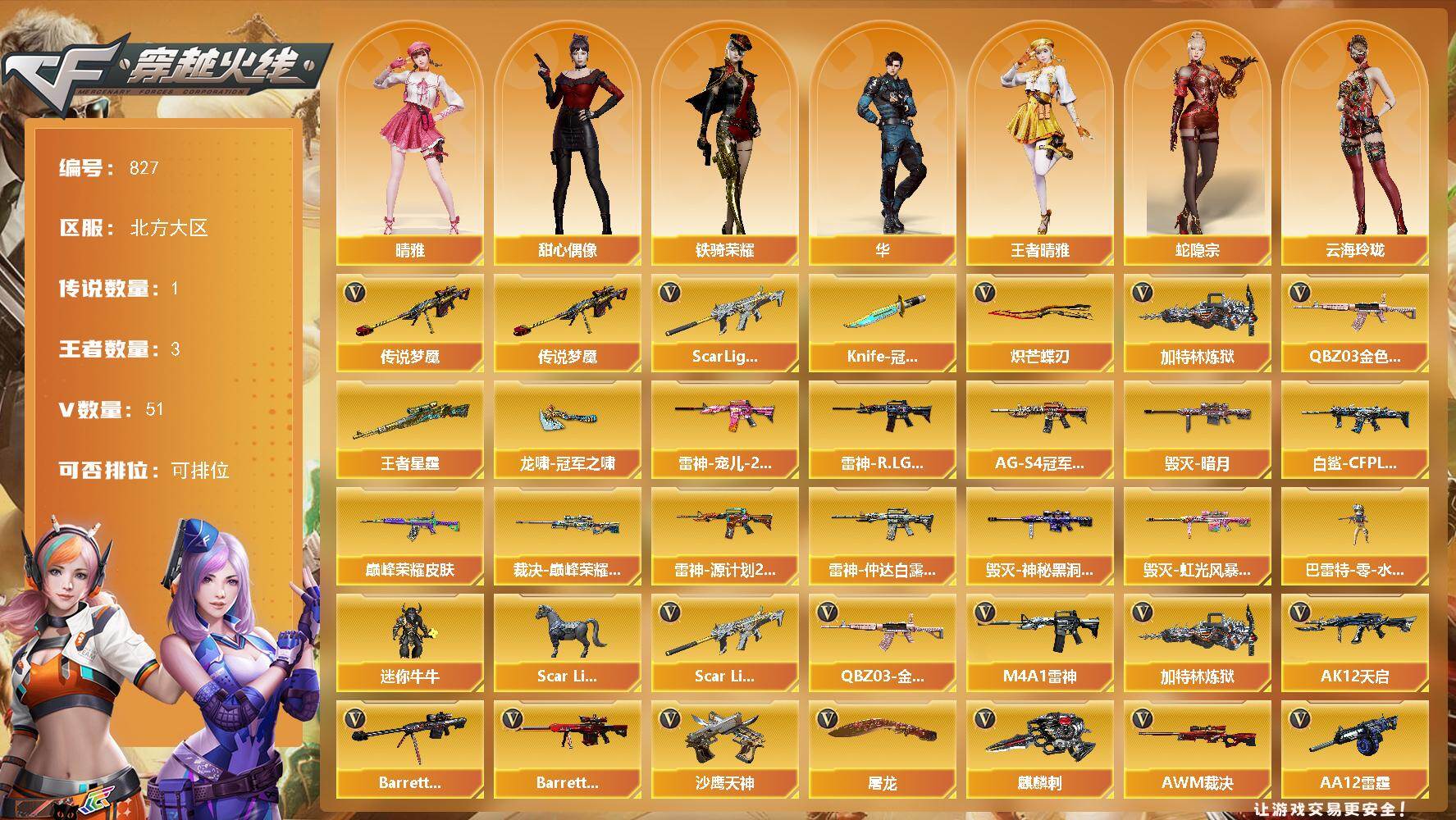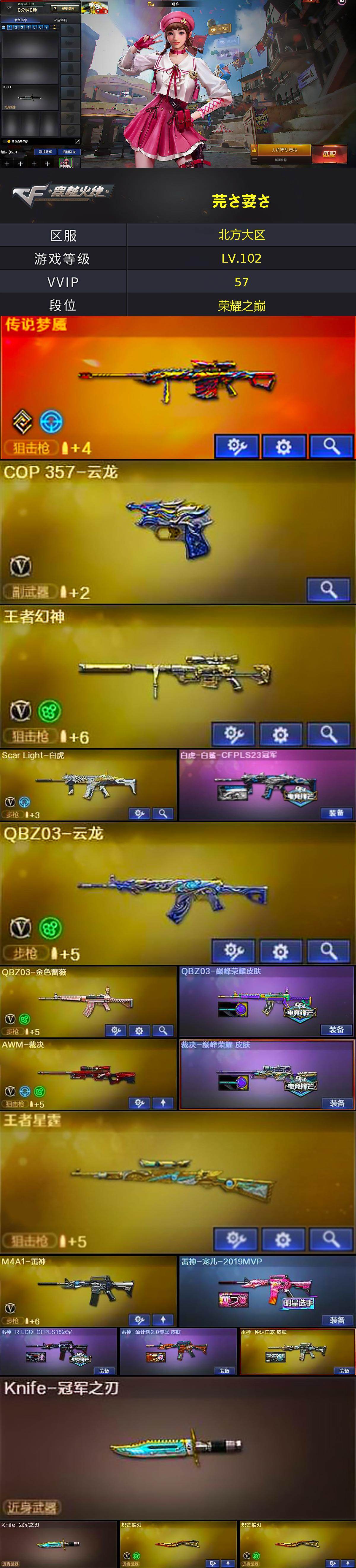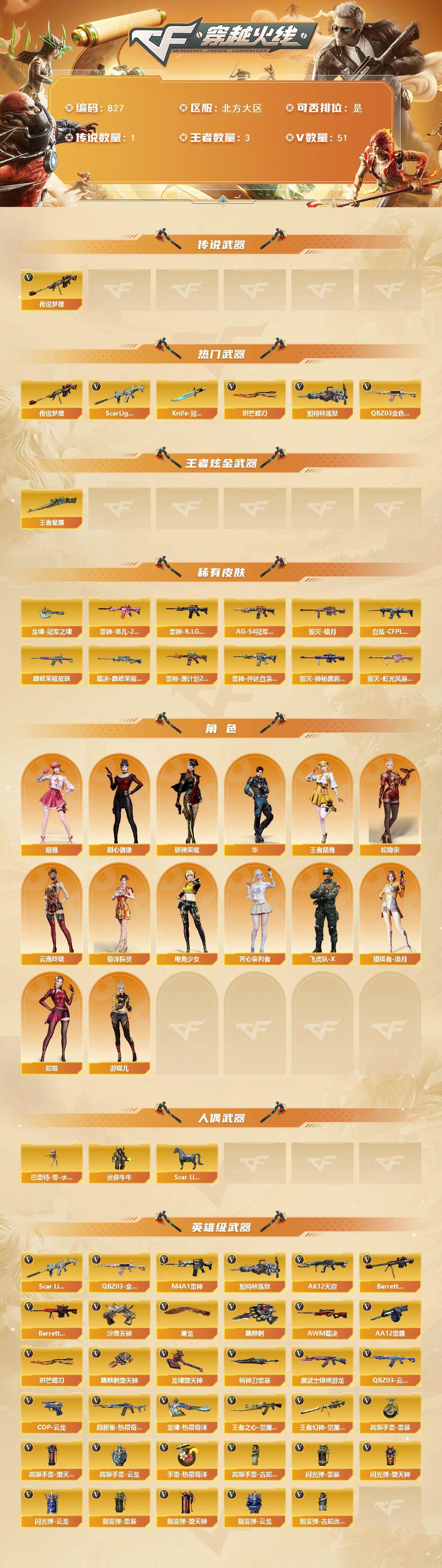 [15525458]北方大区-51V-3王者-0炫金 【传说武器】:传说梦魇 【热门武器】:传说梦魇,QBZ03-金色蔷薇,Scar Light-白虎,加特林-炼狱,Knife-冠军之刃*2,炽芒蝶刃*2 【王者炫金武器】:王者星霆 【皮肤】:白虎-白鲨-CFPLS23冠军,QBZ03-巅峰荣耀皮肤,裁决-巅峰荣耀 皮肤,雷神-宠儿-2019MVP,雷神-R.LGD-CFPLS18冠军,雷神-源计划2.0专属 皮肤,雷神-仲达白露 皮肤,毁灭-暗月,毁灭-神秘黑洞皮肤,毁灭-虹光风暴 皮肤,黑骑士-AG-S4冠军典藏,龙啸-冠军之啸 【角色】:晴雅,华,王者晴雅,蛇隐宗,奇洋探员,云海玲珑,电竞少女,芳心审判者,飞虎队-X,猎狐者-追月,蛇姬,甜心偶像,铁骑荣耀,游珑儿 【人偶武器】:巴雷特-零-水下丽影,Scar Light-马枪,迷你牛牛 【英雄级武器】:M4A1-雷神,AK12-天启,Scar Light-白虎,QBZ03-云龙,黑武士-锦绣游龙,超新星-热带奇洋,QBZ03-金色蔷薇,王者之心-觉醒版,Barrett-毁灭,Barrett-极光,AWM-裁决,王者幻神-觉醒版,加特林-炼狱,AA-12-雷霆,沙鹰-天神*3,COP 357-云龙,屠龙,麒麟刺-堕天神,麒麟刺,炽芒蝶刃*2,龙啸-热带奇洋,龙啸-堕天神,斩神刀-雷暴,高爆手雷-雷暴,高爆手雷-堕天神*3,高爆手雷-云龙*2,手雷-热带奇洋,高爆手雷-古蛇迷踪,闪光弹-雷暴,闪光弹-堕天神*2,闪光弹-云龙*7,烟雾弹-雷暴*2,烟雾弹-堕天神*2,烟雾弹-云龙*6,烟雾弹-古蛇迷踪 【道具】:CFS限定背包,EP战队炫彩背包,奇洋探员-海龟背包,热带奇洋炫彩背包,虎牙炫彩背包,救世主-黑桃战神,绿色巨人,灵魂忍者,迷雾幽灵,夺命之镰,防化服*2,星辰流光-枪王排位,巅峰赛先锋-金色流光,流光-再燃火线,枪王排位28赛季金色流光,枪王排位29赛季金色流光,热带奇洋打击特效,蛇隐宗表情,热带奇洋表情,斯沃特表情,EP战队名片,EP战队喷图,EP战队击杀图标*2,防弹头盔*2,防弹衣*2,C4工具钳*2,手雷包*2 【特殊枪械】:1白虎,1炼狱