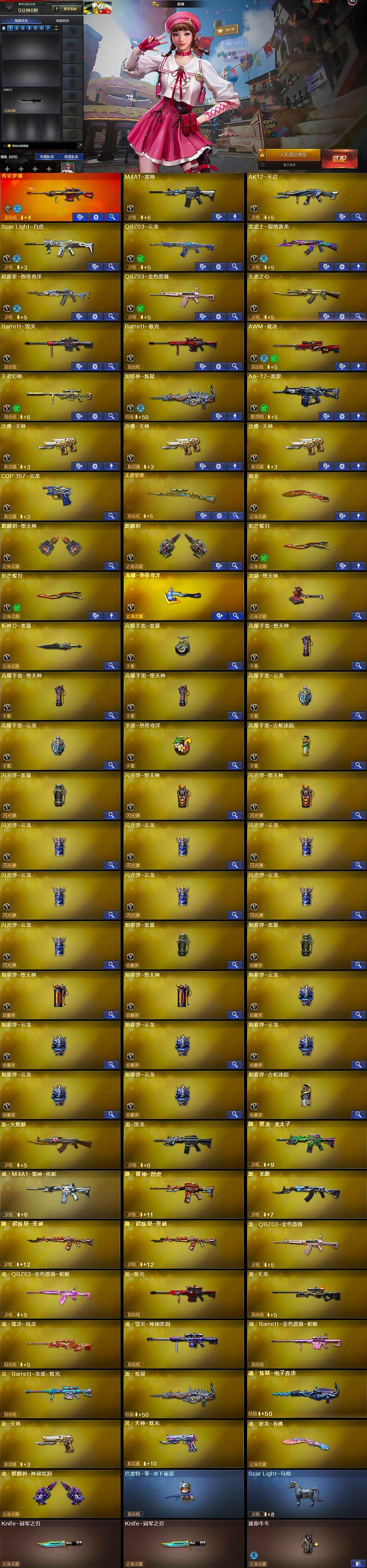 【英雄级武器】:M4A1-雷神,AK12-天启,Scar Light-白虎,QBZ03-云龙,黑武士-锦绣游龙,超新星-热带奇洋,QBZ03-金色蔷薇,王者之心-觉醒版,Barrett-毁灭,Barrett-极光,AWM-裁决,王者幻神-觉醒版,加特林-炼狱,AA-12-雷霆,沙鹰-天神*3,COP 357-云龙,屠龙,麒麟刺-堕天神,麒麟刺,炽芒蝶刃*2,龙啸-热带奇洋,龙啸-堕天神,斩神刀-雷暴,高爆手雷-雷暴,高爆手雷-堕天神*3,高爆手雷-云龙*2,手雷-热带奇洋,高爆手雷-古蛇迷踪,闪光弹-雷暴,闪光弹-堕天神*2,闪光弹-云龙*7,烟雾弹-雷暴*2,烟雾弹-堕天神*2,烟雾弹-云龙*6,烟雾弹-古蛇迷踪