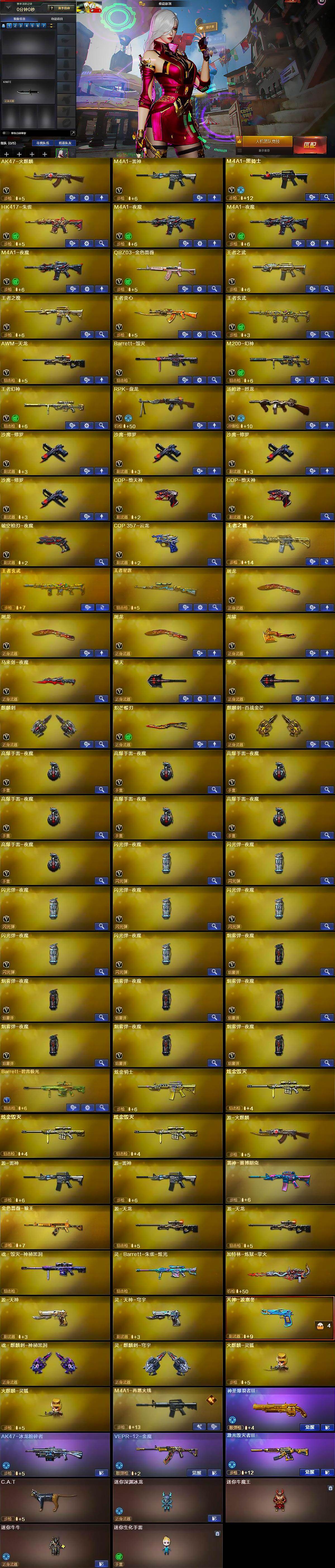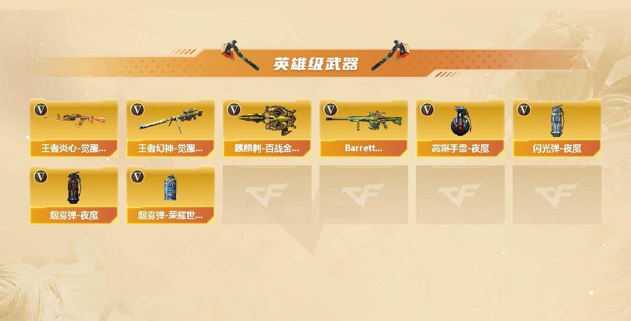 【英雄级武器】:AK47-火麒麟,M4A1-雷神,M4A1-黑骑士,HK417-朱雀,M4A1-夜魔*3,QBZ03-金色蔷薇,王者之武-觉醒版,王者之魄-觉醒版,王者炎心-觉醒版,王者玄武-觉醒版,AWM-天龙,Barrett-毁灭,M200-幻神,王者幻神-觉醒版,RPK-盘龙,汤姆逊-烈龙,沙鹰-修罗*4,COP-堕天神*2,破空枪刃-夜魔,COP 357-云龙,屠龙*3,龙啸,马来剑-夜魔,擎天*2,麒麟刺,炽芒蝶刃,麒麟刺-百战金芒,高爆手雷-夜魔*7,闪光弹-夜魔*7,烟雾弹-夜魔*7,烟雾弹-荣耀世冠EP,Barrett-碧霄极光