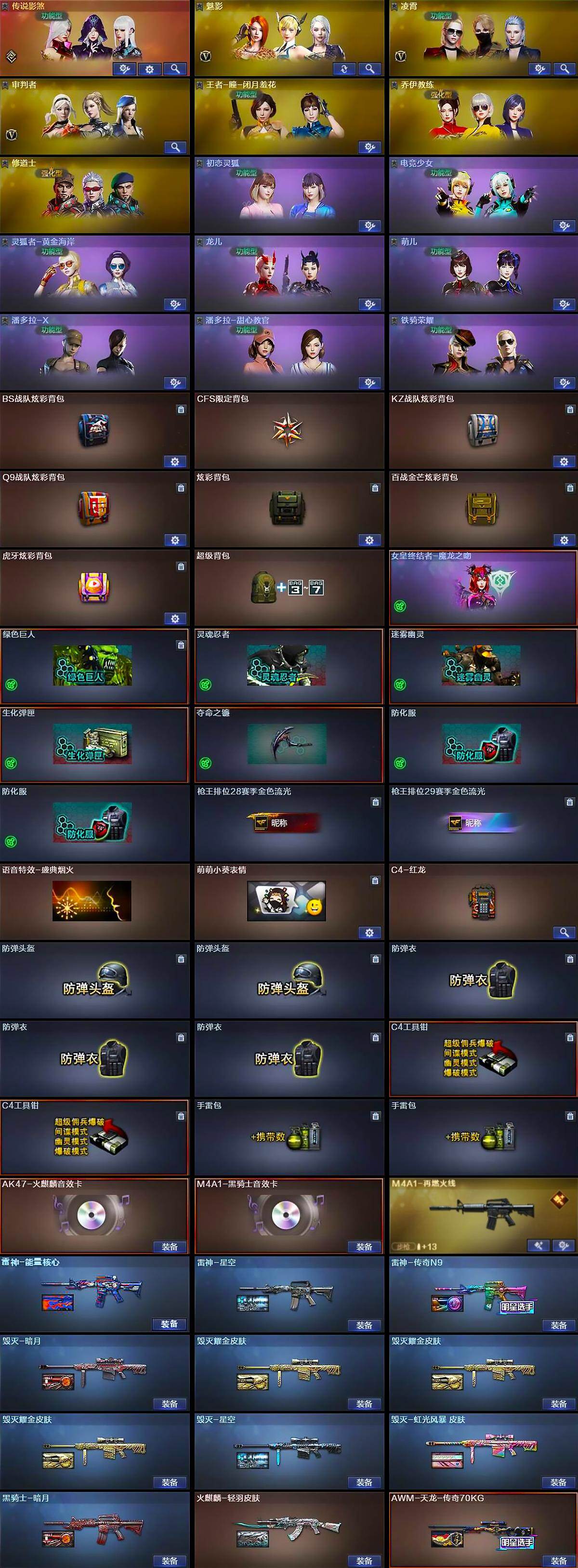 【道具】:BS战队炫彩背包,CFS限定背包,KZ战队炫彩背包,Q9战队炫彩背包,炫彩背包,百战金芒炫彩背包,虎牙炫彩背包,超级背包,女皇终结者-魔龙之吻,绿色巨人,灵魂忍者,迷雾幽灵,生化弹匣,夺命之镰,防化服*2,枪王排位28赛季金色流光,枪王排位29赛季金色流光,语音特效-盛典烟火,萌萌小葵表情,C4-红龙,防弹头盔*2,防弹衣*3,C4工具钳*2,手雷包*2