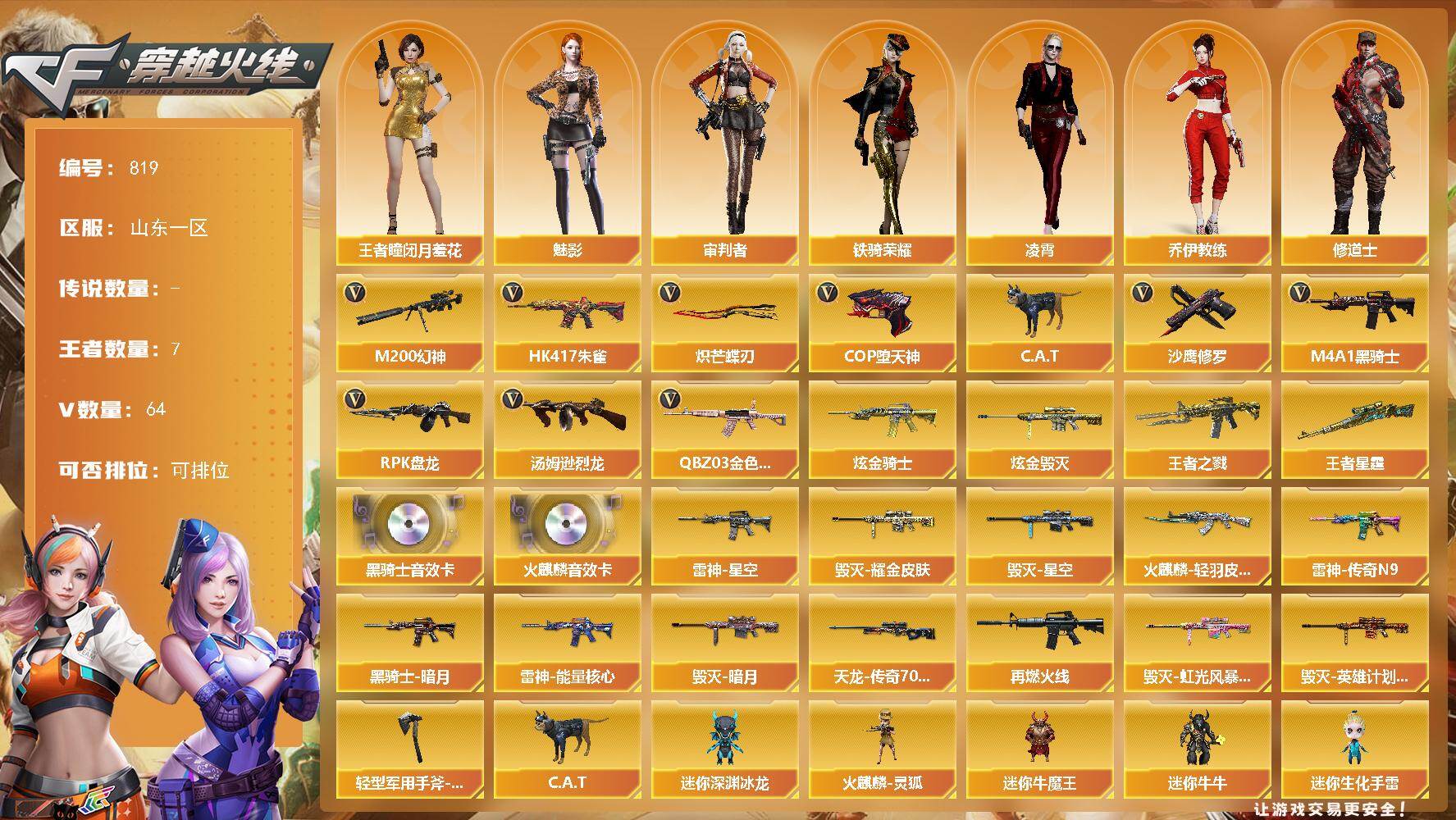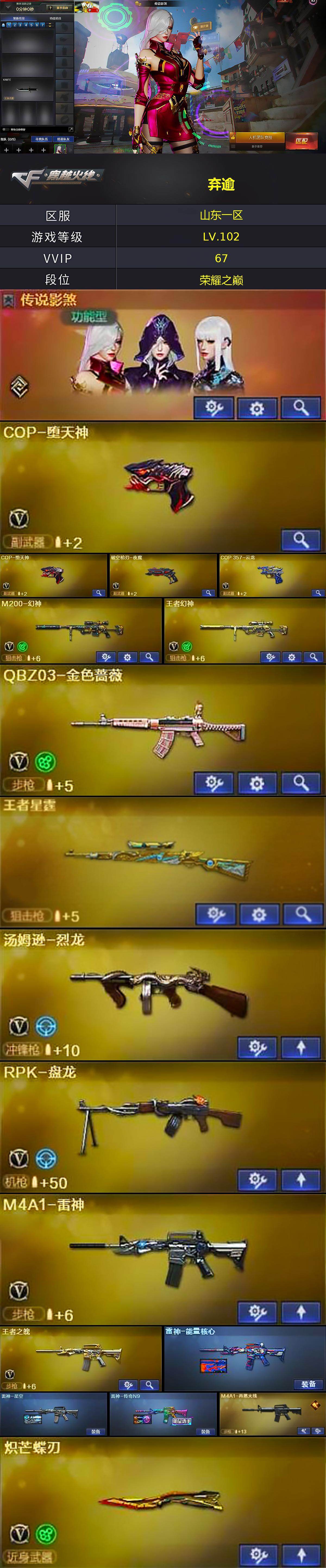 [15526045]山东一区-64V-7王者-4炫金 【传说角色】:传说影煞 【热门武器】:QBZ03-金色蔷薇,HK417-朱雀,M200-幻神,C.A.T,M4A1-黑骑士,汤姆逊-烈龙,RPK-盘龙,COP-堕天神*2,沙鹰-修罗*4,炽芒蝶刃 【王者炫金武器】:王者之戮,王者星霆,炫金骑士,炫金毁灭*3 【音效卡】:AK47-火麒麟音效卡,M4A1-黑骑士音效卡 【皮肤】:雷神-能量核心,雷神-星空,雷神-传奇N9,M4A1-再燃火线,火麒麟-轻羽皮肤,毁灭-暗月,毁灭耀金皮肤*3,毁灭-星空,毁灭-虹光风暴 皮肤,毁灭-英雄计划 皮肤,黑骑士-暗月,AWM-天龙-传奇70KG,轻型军用手斧-再燃火线 【角色】:魅影,凌霄,审判者,王者-瞳-闭月羞花,乔伊教练,修道士,初恋灵狐,电竞少女,灵狐者-黄金海岸,龙儿,萌儿,潘多拉-X,潘多拉-甜心教官,铁骑荣耀 【人偶武器】:火麒麟-灵狐*2,C.A.T,迷你深渊冰龙,迷你牛魔王,迷你牛牛,迷你生化手雷 【挑战大师】:神圣爆裂者III,AK47-冰龙粉碎者,VEPR-12-金魔,激光毁灭者III 【英雄级武器】:AK47-火麒麟,M4A1-雷神,M4A1-黑骑士,HK417-朱雀,M4A1-夜魔*3,QBZ03-金色蔷薇,王者之武-觉醒版,王者之魄-觉醒版,王者炎心-觉醒版,王者玄武-觉醒版,AWM-天龙,Barrett-毁灭,M200-幻神,王者幻神-觉醒版,RPK-盘龙,汤姆逊-烈龙,沙鹰-修罗*4,COP-堕天神*2,破空枪刃-夜魔,COP 357-云龙,屠龙*3,龙啸,马来剑-夜魔,擎天*2,麒麟刺,炽芒蝶刃,麒麟刺-百战金芒,高爆手雷-夜魔*7,闪光弹-夜魔*7,烟雾弹-夜魔*7,烟雾弹-荣耀世冠EP,Barrett-碧霄极光 【道具】:BS战队炫彩背包,CFS限定背包,KZ战队炫彩背包,Q9战队炫彩背包,炫彩背包,百战金芒炫彩背包,虎牙炫彩背包,超级背包,女皇终结者-魔龙之吻,绿色巨人,灵魂忍者,迷雾幽灵,生化弹匣,夺命之镰,防化服*2,枪王排位28赛季金色流光,枪王排位29赛季金色流光,语音特效-盛典烟火,萌萌小葵表情,C4-红龙,防弹头盔*2,防弹衣*3,C4工具钳*2,手雷包*2 【特殊枪械】:1黑骑士,1烈龙,1盘龙