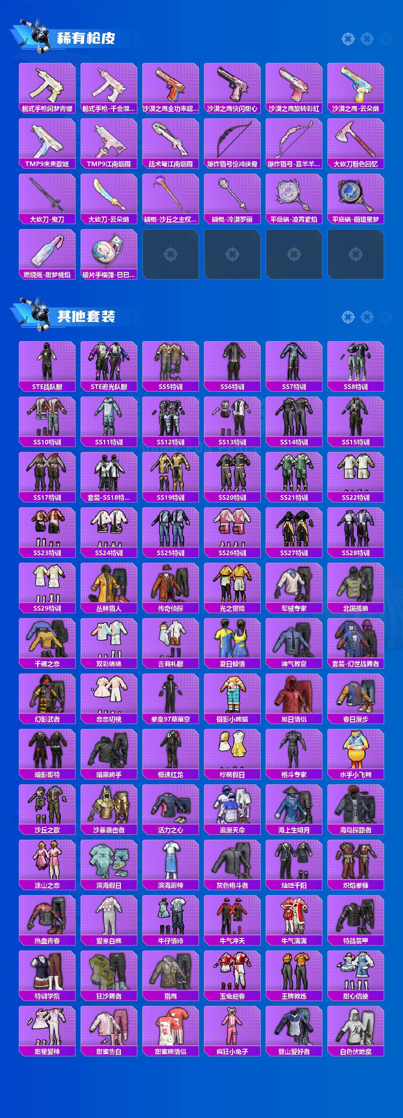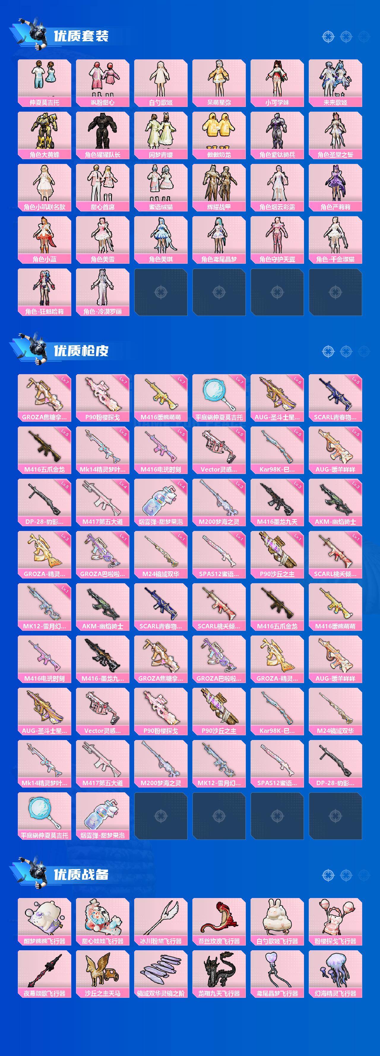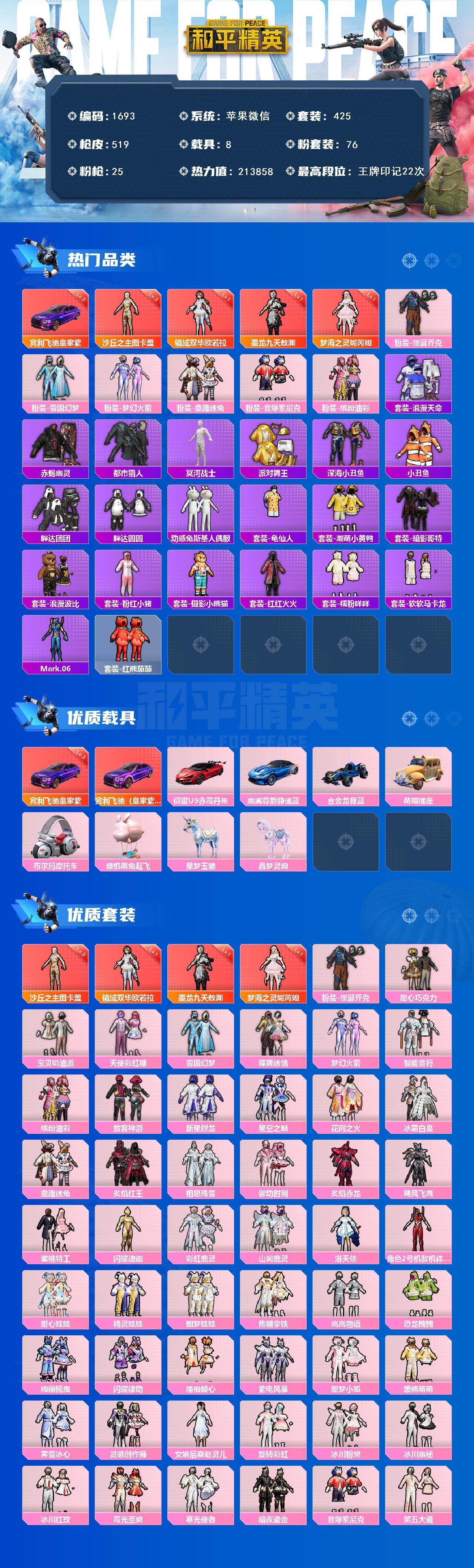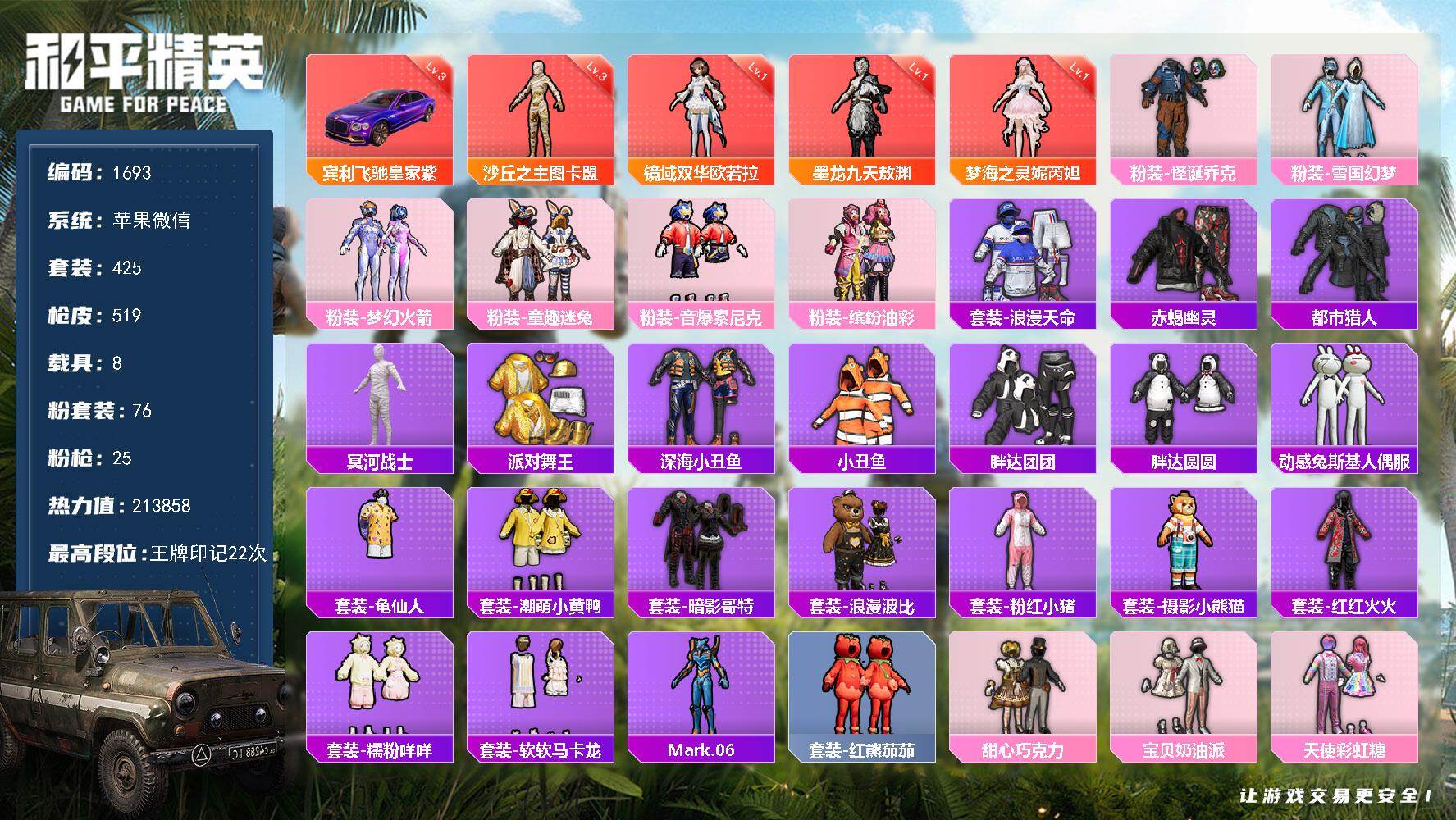 [15528329]【1693】苹果 微信-4神装-76粉装-25特效枪-8载具-20粉色飞行器-213858热力值-22王牌印记-425套装-519枪皮